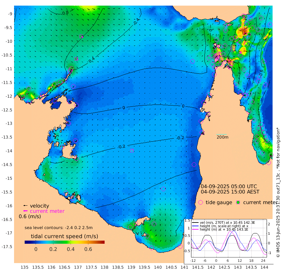 26cm/s 118T +3cm/s rms + 7cm/s -42T. ARA-GOC87 57m 14cm/s 32T +3cm/s rms + 2cm/s -2T. ARA-GOC87 60m 28cm/s 117T +2cm/s rms + 3cm/s 61T. ARA-GOC87 47m -112cm Daru -106cm Bobo Island -57cm Meer Island Barge -91cm Bramble Cay -112cm Unnamed Cay -104cm Pearce Cay -98cm Stephens Island -120cm Merrie England Shoals -127cm Mutacomal Reef -86cm Darnley Island Barge -72cm East Cay -94cm Yorke Island Barge -109cm Rennel Island -98cm Aureed Island -99cm Dungeness Reef -69cm Zagai Island -75cm Yam Island -34cm Dauan Island -35cm Saibai Island -65cm Phipi Reef -79cm Warrior Reef - West -26cm Mabuiag Island Barge -100cm Half Way Island -103cm Coconut Island -104cm Dugong Islet -90cm Poll Island -95cm Kirkcaldie Reef -82cm Suarji Island -85cm Sue Islet 1cm Hawkesbury Island -77cm Alert Patches -74cm Twin Island 5cm Badu Island -64cm St Pauls (Moa Island) -10cm Kubin (Moa Island) -47cm Ince Point -32cm Thursday Island -36cm Nardana Patches -22cm Turtle Head -10cm Round Island 11cm Goods Island 37cm Booby Island 20cm White Rocks Area 57cm Carpentaria -51cm Papou Point 28cm Bampfield Head 32cm Crab Island 25cm Red Wallis Island -11cm Packe Island -115cm Harrington Reef 6cm Herald Camp -24cm Sharp Point -25cm Red Island Point -47cm Possession Island -80cm Alpha Rock -92cm Frederick Point -115cm Wyborn Reef Light -110cm Tetley Island -59cm Triangle Reef -101cm Turtle Head Island -59cm Maclennan Cay -40cm Raine Island -100cm Mcsweeny Reef -97cm Collette Reef -65cm Shadwell Reef -106cm Hannibal Island -98cm Round Point 39cm Vrilya Point -87cm Cape Grenville -72cm Hicks Island -69cm Sir Charles Hardy Island -25cm Harvey Island -78cm Kay Reef -56cm Rocky Island -53cm Chapman Island -47cm Ham Reef -49cm Jubilee Reef -51cm Night Island -51cm Unnamed Reef No. 3 -57cm Morris Island -39cm 1st 3 Mile Opening -50cm Creech Reef -61cm Fife Island -55cm Eden Reef -60cm Stanley Island -69cm Normanby River 77cm Yabooma Island 84cm Hutchison River 80cm Elcho Island 73cm North West Crocodile Island 60cm Cape Wessel 63cm Stevens Island 49cm Guluwuru Island 53cm Hopeful Bay 61cm Auster Point 73cm Two Island Bay 78cm Cadell Strait -12cm Mallison Island 40cm Melville Bay (Gove Harbour) 48cm Truant Island 28cm Cape Arnhem 8cm Cape Grey -12cm Hawk Island -8cm Milner Bay (Groote Eylandt) -25cm Cape Beatrice -42cm West Island -40cm Centre Island -88cm Mornington Island -90cm West Wellesley Islands -99cm Bountiful Island -92cm Albert River Mouth -98cm Sweers Island -106cm Karumba -83cm Nassau River Offshore -64cm Christmas Creek -26cm Archer River -2cm Boyd Point -3cm Weipa (Humbug Point) 11cm Pennefather River 28cm Cullen Point