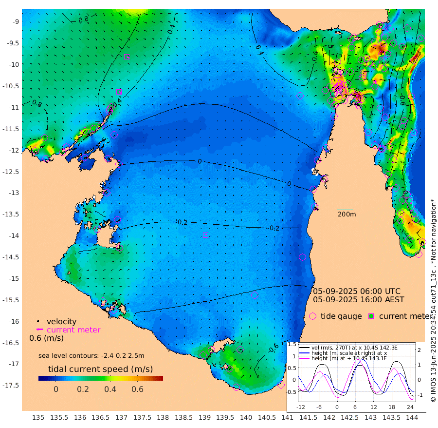 22cm/s 123T +3cm/s rms + 7cm/s -42T. ARA-GOC87 57m 11cm/s 40T +3cm/s rms + 2cm/s -2T. ARA-GOC87 60m 25cm/s 124T +2cm/s rms + 3cm/s 61T. ARA-GOC87 47m -130cm Daru -121cm Bobo Island -45cm Meer Island Barge -84cm Bramble Cay -116cm Unnamed Cay -112cm Pearce Cay -100cm Stephens Island -121cm Merrie England Shoals -140cm Mutacomal Reef -85cm Darnley Island Barge -60cm East Cay -102cm Yorke Island Barge -119cm Rennel Island -110cm Aureed Island -117cm Dungeness Reef -102cm Zagai Island -105cm Yam Island -70cm Dauan Island -65cm Saibai Island -101cm Phipi Reef -114cm Warrior Reef - West -50cm Mabuiag Island Barge -109cm Half Way Island -123cm Coconut Island -117cm Dugong Islet -115cm Poll Island -117cm Kirkcaldie Reef -113cm Suarji Island -107cm Sue Islet 3cm Hawkesbury Island -101cm Alert Patches -100cm Twin Island -3cm Badu Island -96cm St Pauls (Moa Island) -20cm Kubin (Moa Island) -69cm Ince Point -49cm Thursday Island -54cm Nardana Patches -32cm Turtle Head -18cm Round Island 14cm Goods Island 48cm Booby Island 29cm White Rocks Area 73cm Carpentaria -77cm Papou Point 36cm Bampfield Head 39cm Crab Island 33cm Red Wallis Island -16cm Packe Island -134cm Harrington Reef 10cm Herald Camp -36cm Sharp Point -31cm Red Island Point -66cm Possession Island -103cm Alpha Rock -116cm Frederick Point -133cm Wyborn Reef Light -131cm Tetley Island -53cm Triangle Reef -118cm Turtle Head Island -48cm Maclennan Cay -24cm Raine Island -105cm Mcsweeny Reef -97cm Collette Reef -55cm Shadwell Reef -104cm Hannibal Island -91cm Round Point 50cm Vrilya Point -77cm Cape Grenville -63cm Hicks Island -55cm Sir Charles Hardy Island -22cm Harvey Island -60cm Kay Reef -40cm Rocky Island -34cm Chapman Island -27cm Ham Reef -32cm Jubilee Reef -38cm Night Island -32cm Unnamed Reef No. 3 -40cm Morris Island -22cm 1st 3 Mile Opening -32cm Creech Reef -48cm Fife Island -31cm Eden Reef -40cm Stanley Island -48cm Normanby River 76cm Yabooma Island 77cm Hutchison River 76cm Elcho Island 69cm North West Crocodile Island 56cm Cape Wessel 55cm Stevens Island 41cm Guluwuru Island 51cm Hopeful Bay 56cm Auster Point 68cm Two Island Bay 67cm Cadell Strait -16cm Mallison Island 30cm Melville Bay (Gove Harbour) 38cm Truant Island 19cm Cape Arnhem 2cm Cape Grey -20cm Hawk Island -15cm Milner Bay (Groote Eylandt) -30cm Cape Beatrice -44cm West Island -43cm Centre Island -95cm Mornington Island -92cm West Wellesley Islands -100cm Bountiful Island -102cm Albert River Mouth -110cm Sweers Island -117cm Karumba -83cm Nassau River Offshore -59cm Christmas Creek -14cm Archer River 8cm Boyd Point 11cm Weipa (Humbug Point) 18cm Pennefather River 38cm Cullen Point