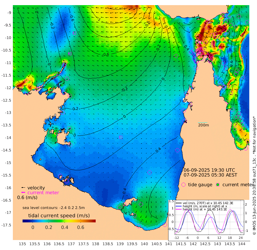23cm/s -82T +3cm/s rms + 7cm/s -42T. ARA-GOC87 57m 15cm/s -85T +3cm/s rms + 2cm/s -2T. ARA-GOC87 60m 19cm/s -83T +2cm/s rms + 3cm/s 61T. ARA-GOC87 47m -122cm Daru -118cm Bobo Island -29cm Meer Island Barge -63cm Bramble Cay -101cm Unnamed Cay -101cm Pearce Cay -85cm Stephens Island -99cm Merrie England Shoals -129cm Mutacomal Reef -73cm Darnley Island Barge -34cm East Cay -97cm Yorke Island Barge -106cm Rennel Island -104cm Aureed Island -110cm Dungeness Reef -125cm Zagai Island -123cm Yam Island -83cm Dauan Island -94cm Saibai Island -72cm Phipi Reef -119cm Warrior Reef - West -89cm Mabuiag Island Barge -104cm Half Way Island -127cm Coconut Island -116cm Dugong Islet -127cm Poll Island -120cm Kirkcaldie Reef -127cm Suarji Island -125cm Sue Islet -28cm Hawkesbury Island -117cm Alert Patches -125cm Twin Island -44cm Badu Island -129cm St Pauls (Moa Island) -54cm Kubin (Moa Island) -97cm Ince Point -82cm Thursday Island -86cm Nardana Patches -51cm Turtle Head -34cm Round Island -15cm Goods Island 4cm Booby Island -13cm White Rocks Area -9cm Carpentaria -112cm Papou Point -10cm Bampfield Head 13cm Crab Island -7cm Red Wallis Island -35cm Packe Island -136cm Harrington Reef 2cm Herald Camp -39cm Sharp Point -45cm Red Island Point -78cm Possession Island -129cm Alpha Rock -132cm Frederick Point -140cm Wyborn Reef Light -144cm Tetley Island -42cm Triangle Reef -133cm Turtle Head Island -32cm Maclennan Cay -3cm Raine Island -94cm Mcsweeny Reef -78cm Collette Reef -33cm Shadwell Reef -82cm Hannibal Island -65cm Round Point 14cm Vrilya Point -51cm Cape Grenville -39cm Hicks Island -38cm Sir Charles Hardy Island -14cm Harvey Island -33cm Kay Reef -14cm Rocky Island -7cm Chapman Island -6cm Ham Reef -14cm Jubilee Reef -13cm Night Island -9cm Unnamed Reef No. 3 -14cm Morris Island -5cm 1st 3 Mile Opening -10cm Creech Reef -18cm Fife Island -1cm Eden Reef -10cm Stanley Island -18cm Normanby River -7cm Yabooma Island -19cm Hutchison River -5cm Elcho Island -3cm North West Crocodile Island -57cm Cape Wessel -40cm Stevens Island -68cm Guluwuru Island -14cm Hopeful Bay -39cm Auster Point -34cm Two Island Bay -40cm Cadell Strait -133cm Mallison Island -55cm Melville Bay (Gove Harbour) -65cm Truant Island -42cm Cape Arnhem -26cm Cape Grey -6cm Hawk Island 8cm Milner Bay (Groote Eylandt) 19cm Cape Beatrice 30cm West Island 40cm Centre Island 78cm Mornington Island 72cm West Wellesley Islands 94cm Bountiful Island 130cm Albert River Mouth 128cm Sweers Island 136cm Karumba 76cm Nassau River Offshore 61cm Christmas Creek 48cm Archer River 26cm Boyd Point 45cm Weipa (Humbug Point) 23cm Pennefather River 23cm Cullen Point