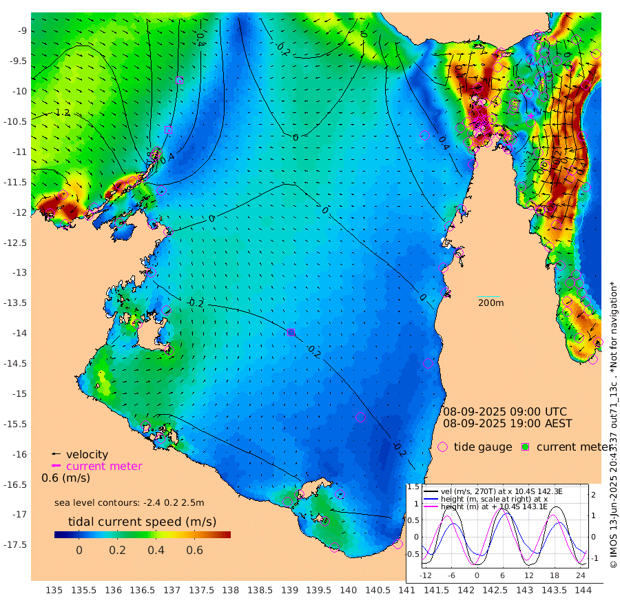 11cm/s 162T +3cm/s rms + 7cm/s -42T. ARA-GOC87 57m 2cm/s 24T +3cm/s rms + 2cm/s -2T. ARA-GOC87 60m 16cm/s 150T +2cm/s rms + 3cm/s 61T. ARA-GOC87 47m -83cm Daru -68cm Bobo Island 23cm Meer Island Barge -1cm Bramble Cay -40cm Unnamed Cay -40cm Pearce Cay -25cm Stephens Island -36cm Merrie England Shoals -75cm Mutacomal Reef -19cm Darnley Island Barge 23cm East Cay -48cm Yorke Island Barge -53cm Rennel Island -58cm Aureed Island -76cm Dungeness Reef -118cm Zagai Island -108cm Yam Island -118cm Dauan Island -114cm Saibai Island -129cm Phipi Reef -128cm Warrior Reef - West -73cm Mabuiag Island Barge -49cm Half Way Island -85cm Coconut Island -62cm Dugong Islet -94cm Poll Island -88cm Kirkcaldie Reef -108cm Suarji Island -95cm Sue Islet 40cm Hawkesbury Island -88cm Alert Patches -91cm Twin Island 4cm Badu Island -105cm St Pauls (Moa Island) -6cm Kubin (Moa Island) -66cm Ince Point -44cm Thursday Island -51cm Nardana Patches -14cm Turtle Head 2cm Round Island 45cm Goods Island 74cm Booby Island 69cm White Rocks Area 69cm Carpentaria -80cm Papou Point 67cm Bampfield Head 49cm Crab Island 58cm Red Wallis Island 9cm Packe Island -78cm Harrington Reef 38cm Herald Camp -49cm Sharp Point -9cm Red Island Point -53cm Possession Island -90cm Alpha Rock -89cm Frederick Point -81cm Wyborn Reef Light -89cm Tetley Island 3cm Triangle Reef -59cm Turtle Head Island 21cm Maclennan Cay 43cm Raine Island -37cm Mcsweeny Reef -27cm Collette Reef 10cm Shadwell Reef -24cm Hannibal Island 0cm Round Point 52cm Vrilya Point 8cm Cape Grenville 15cm Hicks Island 25cm Sir Charles Hardy Island 1cm Harvey Island 31cm Kay Reef 38cm Rocky Island 47cm Chapman Island 46cm Ham Reef 40cm Jubilee Reef 27cm Night Island 44cm Unnamed Reef No. 3 42cm Morris Island 47cm 1st 3 Mile Opening 42cm Creech Reef 30cm Fife Island 62cm Eden Reef 46cm Stanley Island 52cm Normanby River 153cm Yabooma Island 153cm Hutchison River 139cm Elcho Island 134cm North West Crocodile Island 79cm Cape Wessel 104cm Stevens Island 38cm Guluwuru Island 106cm Hopeful Bay 92cm Auster Point 95cm Two Island Bay 103cm Cadell Strait -65cm Mallison Island 37cm Melville Bay (Gove Harbour) 40cm Truant Island 12cm Cape Arnhem 2cm Cape Grey -18cm Hawk Island -24cm Milner Bay (Groote Eylandt) -29cm Cape Beatrice -49cm West Island -53cm Centre Island -83cm Mornington Island -71cm West Wellesley Islands -58cm Bountiful Island -80cm Albert River Mouth -85cm Sweers Island -89cm Karumba -54cm Nassau River Offshore -31cm Christmas Creek 15cm Archer River 25cm Boyd Point 39cm Weipa (Humbug Point) 22cm Pennefather River 44cm Cullen Point