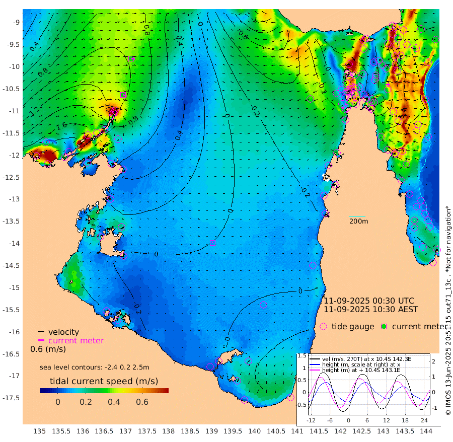 34cm/s 114T +3cm/s rms + 7cm/s -42T. ARA-GOC87 57m 9cm/s -57T +3cm/s rms + 2cm/s -2T. ARA-GOC87 60m 35cm/s 102T +2cm/s rms + 3cm/s 61T. ARA-GOC87 47m 46cm Daru 57cm Bobo Island 61cm Meer Island Barge 70cm Bramble Cay 55cm Unnamed Cay 73cm Pearce Cay 67cm Stephens Island 61cm Merrie England Shoals 42cm Mutacomal Reef 56cm Darnley Island Barge 69cm East Cay 45cm Yorke Island Barge 55cm Rennel Island 50cm Aureed Island 41cm Dungeness Reef -1cm Zagai Island -3cm Yam Island -25cm Dauan Island -48cm Saibai Island 2cm Phipi Reef 0cm Warrior Reef - West -35cm Mabuiag Island Barge 52cm Half Way Island 41cm Coconut Island 38cm Dugong Islet 21cm Poll Island 22cm Kirkcaldie Reef 0cm Suarji Island -2cm Sue Islet -1cm Hawkesbury Island -2cm Alert Patches 1cm Twin Island 5cm Badu Island -10cm St Pauls (Moa Island) 5cm Kubin (Moa Island) -8cm Ince Point -9cm Thursday Island -9cm Nardana Patches 5cm Turtle Head 2cm Round Island 12cm Goods Island -2cm Booby Island 7cm White Rocks Area -50cm Carpentaria -3cm Papou Point -2cm Bampfield Head 4cm Crab Island -4cm Red Wallis Island 10cm Packe Island 44cm Harrington Reef -10cm Herald Camp -17cm Sharp Point 3cm Red Island Point 3cm Possession Island -12cm Alpha Rock 19cm Frederick Point 40cm Wyborn Reef Light 32cm Tetley Island 47cm Triangle Reef 59cm Turtle Head Island 54cm Maclennan Cay 62cm Raine Island 55cm Mcsweeny Reef 53cm Collette Reef 52cm Shadwell Reef 63cm Hannibal Island 76cm Round Point -12cm Vrilya Point 59cm Cape Grenville 67cm Hicks Island 52cm Sir Charles Hardy Island 19cm Harvey Island 59cm Kay Reef 60cm Rocky Island 61cm Chapman Island 51cm Ham Reef 57cm Jubilee Reef 57cm Night Island 55cm Unnamed Reef No. 3 66cm Morris Island 62cm 1st 3 Mile Opening 60cm Creech Reef 72cm Fife Island 79cm Eden Reef 63cm Stanley Island 75cm Normanby River 190cm Yabooma Island 227cm Hutchison River 189cm Elcho Island 178cm North West Crocodile Island 109cm Cape Wessel 171cm Stevens Island 105cm Guluwuru Island 153cm Hopeful Bay 134cm Auster Point 132cm Two Island Bay 198cm Cadell Strait 48cm Mallison Island 105cm Melville Bay (Gove Harbour) 108cm Truant Island 67cm Cape Arnhem 38cm Cape Grey 29cm Hawk Island -2cm Milner Bay (Groote Eylandt) -7cm Cape Beatrice -55cm West Island -53cm Centre Island -9cm Mornington Island -17cm West Wellesley Islands -3cm Bountiful Island 26cm Albert River Mouth 24cm Sweers Island 26cm Karumba 7cm Nassau River Offshore 6cm Christmas Creek 9cm Archer River -8cm Boyd Point 7cm Weipa (Humbug Point) 2cm Pennefather River -18cm Cullen Point