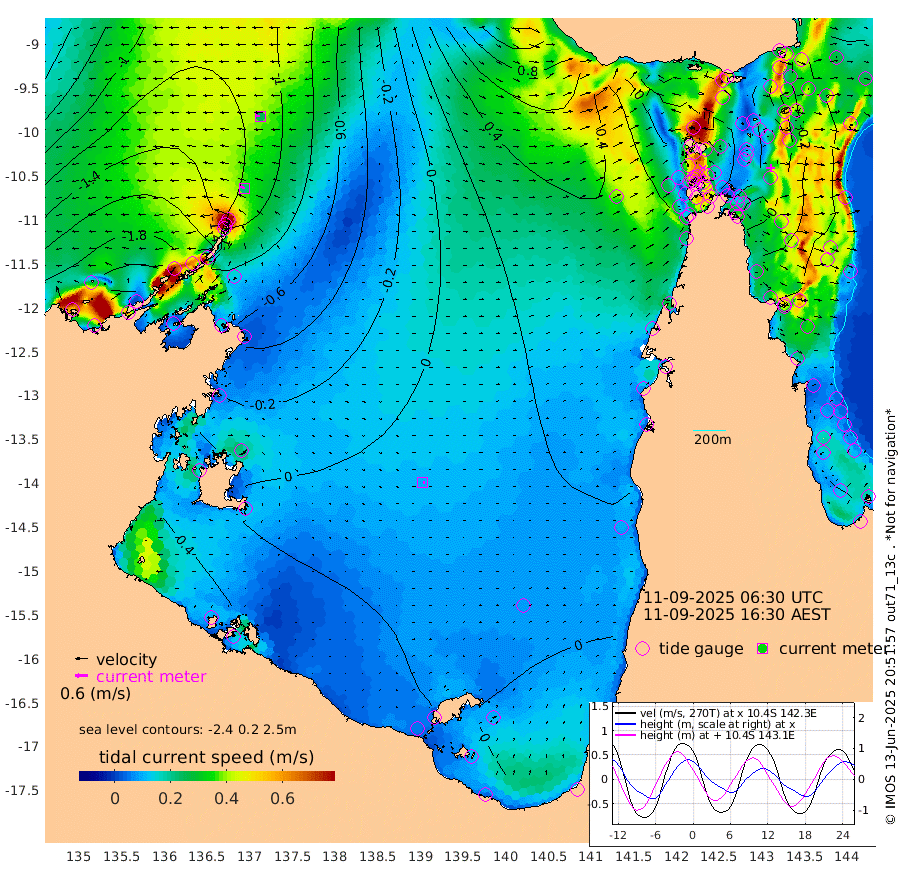 22cm/s -69T +3cm/s rms + 7cm/s -42T. ARA-GOC87 57m 10cm/s 100T +3cm/s rms + 2cm/s -2T. ARA-GOC87 60m 25cm/s -83T +2cm/s rms + 3cm/s 61T. ARA-GOC87 47m -25cm Daru -36cm Bobo Island -39cm Meer Island Barge -48cm Bramble Cay -33cm Unnamed Cay -51cm Pearce Cay -44cm Stephens Island -36cm Merrie England Shoals -23cm Mutacomal Reef -32cm Darnley Island Barge -50cm East Cay -23cm Yorke Island Barge -36cm Rennel Island -27cm Aureed Island -20cm Dungeness Reef 13cm Zagai Island 5cm Yam Island 22cm Dauan Island 40cm Saibai Island 18cm Phipi Reef 7cm Warrior Reef - West 30cm Mabuiag Island Barge -33cm Half Way Island -16cm Coconut Island -24cm Dugong Islet -7cm Poll Island -8cm Kirkcaldie Reef 20cm Suarji Island 12cm Sue Islet -16cm Hawkesbury Island 18cm Alert Patches 10cm Twin Island -6cm Badu Island 19cm St Pauls (Moa Island) -9cm Kubin (Moa Island) 14cm Ince Point 14cm Thursday Island 15cm Nardana Patches 1cm Turtle Head 4cm Round Island -11cm Goods Island 2cm Booby Island -10cm White Rocks Area 52cm Carpentaria 6cm Papou Point 19cm Bampfield Head 0cm Crab Island -2cm Red Wallis Island -9cm Packe Island -23cm Harrington Reef 7cm Herald Camp 19cm Sharp Point -7cm Red Island Point 14cm Possession Island 17cm Alpha Rock -4cm Frederick Point -20cm Wyborn Reef Light -15cm Tetley Island -30cm Triangle Reef -34cm Turtle Head Island -37cm Maclennan Cay -42cm Raine Island -32cm Mcsweeny Reef -28cm Collette Reef -29cm Shadwell Reef -35cm Hannibal Island -53cm Round Point 19cm Vrilya Point -36cm Cape Grenville -46cm Hicks Island -38cm Sir Charles Hardy Island -12cm Harvey Island -39cm Kay Reef -41cm Rocky Island -41cm Chapman Island -36cm Ham Reef -39cm Jubilee Reef -36cm Night Island -39cm Unnamed Reef No. 3 -45cm Morris Island -36cm 1st 3 Mile Opening -39cm Creech Reef -52cm Fife Island -56cm Eden Reef -41cm Stanley Island -58cm Normanby River -231cm Yabooma Island -267cm Hutchison River -226cm Elcho Island -224cm North West Crocodile Island -135cm Cape Wessel -198cm Stevens Island -114cm Guluwuru Island -175cm Hopeful Bay -153cm Auster Point -163cm Two Island Bay -231cm Cadell Strait -22cm Mallison Island -109cm Melville Bay (Gove Harbour) -112cm Truant Island -63cm Cape Arnhem -33cm Cape Grey -20cm Hawk Island 15cm Milner Bay (Groote Eylandt) 13cm Cape Beatrice 63cm West Island 71cm Centre Island 31cm Mornington Island 34cm West Wellesley Islands 19cm Bountiful Island -14cm Albert River Mouth 8cm Sweers Island -11cm Karumba 11cm Nassau River Offshore 11cm Christmas Creek 7cm Archer River 16cm Boyd Point 3cm Weipa (Humbug Point) 18cm Pennefather River 21cm Cullen Point