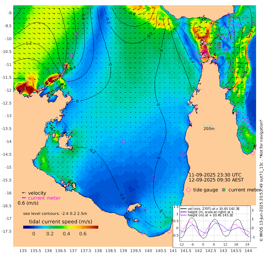 20cm/s 142T +3cm/s rms + 7cm/s -42T. ARA-GOC87 57m 12cm/s -24T +3cm/s rms + 2cm/s -2T. ARA-GOC87 60m 24cm/s 132T +2cm/s rms + 3cm/s 61T. ARA-GOC87 47m -47cm Daru -38cm Bobo Island -4cm Meer Island Barge -8cm Bramble Cay -33cm Unnamed Cay -18cm Pearce Cay -21cm Stephens Island -24cm Merrie England Shoals -43cm Mutacomal Reef -30cm Darnley Island Barge 4cm East Cay -44cm Yorke Island Barge -29cm Rennel Island -39cm Aureed Island -41cm Dungeness Reef -67cm Zagai Island -59cm Yam Island -60cm Dauan Island -76cm Saibai Island -51cm Phipi Reef -69cm Warrior Reef - West -33cm Mabuiag Island Barge -30cm Half Way Island -39cm Coconut Island -43cm Dugong Islet -46cm Poll Island -44cm Kirkcaldie Reef -54cm Suarji Island -65cm Sue Islet 59cm Hawkesbury Island -36cm Alert Patches -37cm Twin Island 47cm Badu Island -48cm St Pauls (Moa Island) 28cm Kubin (Moa Island) -18cm Ince Point -2cm Thursday Island -7cm Nardana Patches 25cm Turtle Head 34cm Round Island 66cm Goods Island 80cm Booby Island 83cm White Rocks Area 38cm Carpentaria -32cm Papou Point 65cm Bampfield Head 77cm Crab Island 77cm Red Wallis Island 50cm Packe Island -41cm Harrington Reef 46cm Herald Camp -28cm Sharp Point 31cm Red Island Point -10cm Possession Island -50cm Alpha Rock -40cm Frederick Point -44cm Wyborn Reef Light -47cm Tetley Island -7cm Triangle Reef -29cm Turtle Head Island -3cm Maclennan Cay 19cm Raine Island -28cm Mcsweeny Reef -25cm Collette Reef -7cm Shadwell Reef -24cm Hannibal Island 0cm Round Point 68cm Vrilya Point -8cm Cape Grenville -1cm Hicks Island -12cm Sir Charles Hardy Island -3cm Harvey Island 2cm Kay Reef 7cm Rocky Island 17cm Chapman Island 9cm Ham Reef 7cm Jubilee Reef 8cm Night Island 14cm Unnamed Reef No. 3 12cm Morris Island 11cm 1st 3 Mile Opening 9cm Creech Reef 14cm Fife Island 18cm Eden Reef 10cm Stanley Island 15cm Normanby River 171cm Yabooma Island 181cm Hutchison River 163cm Elcho Island 161cm North West Crocodile Island 70cm Cape Wessel 133cm Stevens Island 20cm Guluwuru Island 122cm Hopeful Bay 96cm Auster Point 92cm Two Island Bay 127cm Cadell Strait -95cm Mallison Island 33cm Melville Bay (Gove Harbour) 35cm Truant Island 9cm Cape Arnhem -6cm Cape Grey -9cm Hawk Island -18cm Milner Bay (Groote Eylandt) -20cm Cape Beatrice -49cm West Island -46cm Centre Island -40cm Mornington Island -43cm West Wellesley Islands -42cm Bountiful Island -12cm Albert River Mouth -24cm Sweers Island -10cm Karumba -13cm Nassau River Offshore -2cm Christmas Creek 31cm Archer River 23cm Boyd Point 41cm Weipa (Humbug Point) 47cm Pennefather River 49cm Cullen Point