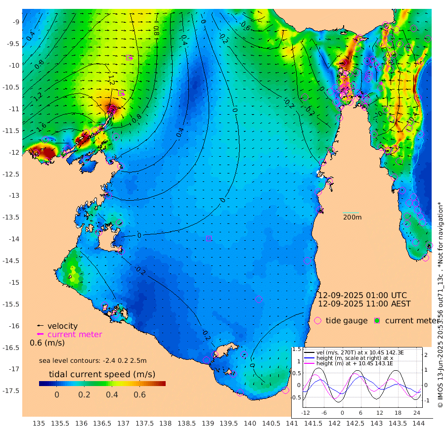 39cm/s 117T +3cm/s rms + 7cm/s -42T. ARA-GOC87 57m 6cm/s -47T +3cm/s rms + 2cm/s -2T. ARA-GOC87 60m 40cm/s 107T +2cm/s rms + 3cm/s 61T. ARA-GOC87 47m 25cm Daru 37cm Bobo Island 40cm Meer Island Barge 44cm Bramble Cay 29cm Unnamed Cay 51cm Pearce Cay 41cm Stephens Island 32cm Merrie England Shoals 18cm Mutacomal Reef 32cm Darnley Island Barge 46cm East Cay 23cm Yorke Island Barge 32cm Rennel Island 30cm Aureed Island 24cm Dungeness Reef -2cm Zagai Island -5cm Yam Island -10cm Dauan Island -32cm Saibai Island 6cm Phipi Reef 0cm Warrior Reef - West -17cm Mabuiag Island Barge 29cm Half Way Island 26cm Coconut Island 18cm Dugong Islet 12cm Poll Island 9cm Kirkcaldie Reef -3cm Suarji Island -10cm Sue Islet 24cm Hawkesbury Island -2cm Alert Patches 2cm Twin Island 32cm Badu Island -5cm St Pauls (Moa Island) 23cm Kubin (Moa Island) 1cm Ince Point 4cm Thursday Island 3cm Nardana Patches 20cm Turtle Head 18cm Round Island 34cm Goods Island 26cm Booby Island 32cm White Rocks Area -21cm Carpentaria 2cm Papou Point 22cm Bampfield Head 28cm Crab Island 24cm Red Wallis Island 28cm Packe Island 24cm Harrington Reef 10cm Herald Camp -16cm Sharp Point 18cm Red Island Point 8cm Possession Island -14cm Alpha Rock 11cm Frederick Point 22cm Wyborn Reef Light 17cm Tetley Island 32cm Triangle Reef 39cm Turtle Head Island 35cm Maclennan Cay 46cm Raine Island 31cm Mcsweeny Reef 29cm Collette Reef 32cm Shadwell Reef 35cm Hannibal Island 50cm Round Point 12cm Vrilya Point 33cm Cape Grenville 44cm Hicks Island 31cm Sir Charles Hardy Island 11cm Harvey Island 35cm Kay Reef 40cm Rocky Island 44cm Chapman Island 34cm Ham Reef 39cm Jubilee Reef 39cm Night Island 39cm Unnamed Reef No. 3 45cm Morris Island 43cm 1st 3 Mile Opening 41cm Creech Reef 51cm Fife Island 55cm Eden Reef 40cm Stanley Island 49cm Normanby River 201cm Yabooma Island 239cm Hutchison River 201cm Elcho Island 190cm North West Crocodile Island 120cm Cape Wessel 181cm Stevens Island 109cm Guluwuru Island 159cm Hopeful Bay 143cm Auster Point 142cm Two Island Bay 209cm Cadell Strait 43cm Mallison Island 108cm Melville Bay (Gove Harbour) 114cm Truant Island 68cm Cape Arnhem 33cm Cape Grey 20cm Hawk Island -13cm Milner Bay (Groote Eylandt) -22cm Cape Beatrice -74cm West Island -73cm Centre Island -40cm Mornington Island -49cm West Wellesley Islands -39cm Bountiful Island -12cm Albert River Mouth -20cm Sweers Island -13cm Karumba -16cm Nassau River Offshore -7cm Christmas Creek 10cm Archer River 1cm Boyd Point 14cm Weipa (Humbug Point) 13cm Pennefather River 2cm Cullen Point