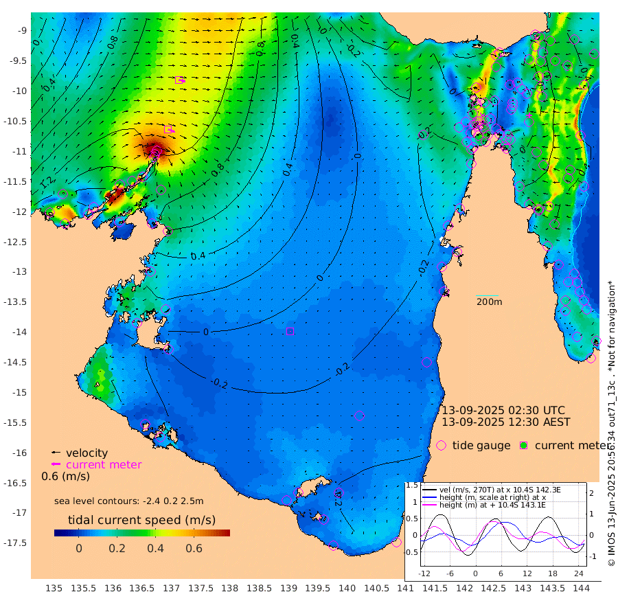 49cm/s 112T +3cm/s rms + 7cm/s -42T. ARA-GOC87 57m 2cm/s 170T +3cm/s rms + 2cm/s -2T. ARA-GOC87 60m 47cm/s 104T +2cm/s rms + 3cm/s 61T. ARA-GOC87 47m 31cm Daru 42cm Bobo Island 37cm Meer Island Barge 37cm Bramble Cay 25cm Unnamed Cay 49cm Pearce Cay 37cm Stephens Island 23cm Merrie England Shoals 17cm Mutacomal Reef 34cm Darnley Island Barge 38cm East Cay 30cm Yorke Island Barge 28cm Rennel Island 36cm Aureed Island 29cm Dungeness Reef 25cm Zagai Island 13cm Yam Island 25cm Dauan Island 9cm Saibai Island 29cm Phipi Reef 26cm Warrior Reef - West 2cm Mabuiag Island Barge 27cm Half Way Island 32cm Coconut Island 19cm Dugong Islet 21cm Poll Island 15cm Kirkcaldie Reef 9cm Suarji Island 8cm Sue Islet 12cm Hawkesbury Island 5cm Alert Patches 11cm Twin Island 31cm Badu Island 10cm St Pauls (Moa Island) 20cm Kubin (Moa Island) 7cm Ince Point 7cm Thursday Island 7cm Nardana Patches 16cm Turtle Head 10cm Round Island 21cm Goods Island 11cm Booby Island 10cm White Rocks Area -21cm Carpentaria 14cm Papou Point 9cm Bampfield Head 14cm Crab Island 8cm Red Wallis Island 17cm Packe Island 23cm Harrington Reef -2cm Herald Camp -9cm Sharp Point 12cm Red Island Point 9cm Possession Island -4cm Alpha Rock 17cm Frederick Point 25cm Wyborn Reef Light 23cm Tetley Island 32cm Triangle Reef 39cm Turtle Head Island 30cm Maclennan Cay 37cm Raine Island 30cm Mcsweeny Reef 26cm Collette Reef 28cm Shadwell Reef 30cm Hannibal Island 39cm Round Point 0cm Vrilya Point 23cm Cape Grenville 36cm Hicks Island 29cm Sir Charles Hardy Island 9cm Harvey Island 24cm Kay Reef 32cm Rocky Island 34cm Chapman Island 28cm Ham Reef 33cm Jubilee Reef 31cm Night Island 30cm Unnamed Reef No. 3 35cm Morris Island 35cm 1st 3 Mile Opening 33cm Creech Reef 40cm Fife Island 44cm Eden Reef 28cm Stanley Island 34cm Normanby River 167cm Yabooma Island 211cm Hutchison River 172cm Elcho Island 158cm North West Crocodile Island 126cm Cape Wessel 164cm Stevens Island 140cm Guluwuru Island 140cm Hopeful Bay 136cm Auster Point 140cm Two Island Bay 209cm Cadell Strait 131cm Mallison Island 126cm Melville Bay (Gove Harbour) 135cm Truant Island 87cm Cape Arnhem 43cm Cape Grey 22cm Hawk Island -21cm Milner Bay (Groote Eylandt) -34cm Cape Beatrice -91cm West Island -91cm Centre Island -63cm Mornington Island -73cm West Wellesley Islands -68cm Bountiful Island -54cm Albert River Mouth -63cm Sweers Island -58cm Karumba -38cm Nassau River Offshore -21cm Christmas Creek -3cm Archer River -3cm Boyd Point 3cm Weipa (Humbug Point) 4cm Pennefather River -6cm Cullen Point