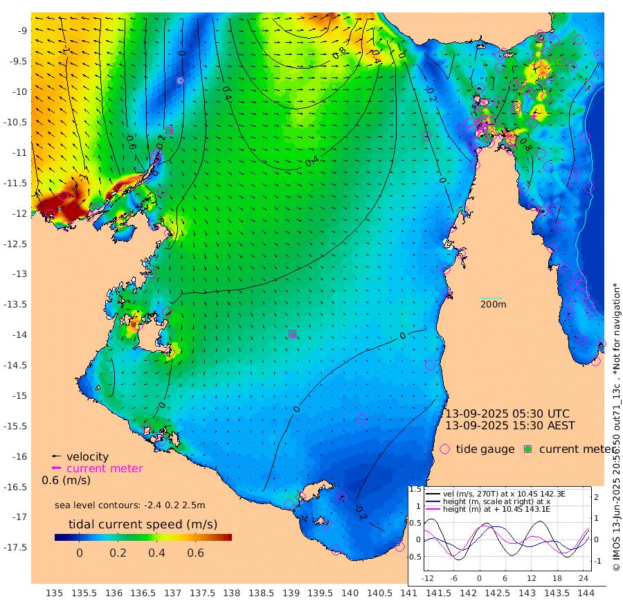 25cm/s 102T +3cm/s rms + 7cm/s -42T. ARA-GOC87 57m 22cm/s 153T +3cm/s rms + 2cm/s -2T. ARA-GOC87 60m 15cm/s 91T +2cm/s rms + 3cm/s 61T. ARA-GOC87 47m 71cm Daru 71cm Bobo Island 58cm Meer Island Barge 58cm Bramble Cay 66cm Unnamed Cay 65cm Pearce Cay 68cm Stephens Island 64cm Merrie England Shoals 61cm Mutacomal Reef 76cm Darnley Island Barge 51cm East Cay 76cm Yorke Island Barge 59cm Rennel Island 72cm Aureed Island 62cm Dungeness Reef 61cm Zagai Island 47cm Yam Island 40cm Dauan Island 43cm Saibai Island 42cm Phipi Reef 59cm Warrior Reef - West 12cm Mabuiag Island Barge 65cm Half Way Island 63cm Coconut Island 64cm Dugong Islet 53cm Poll Island 56cm Kirkcaldie Reef 41cm Suarji Island 61cm Sue Islet -37cm Hawkesbury Island 35cm Alert Patches 37cm Twin Island -18cm Badu Island 39cm St Pauls (Moa Island) -9cm Kubin (Moa Island) 19cm Ince Point 10cm Thursday Island 12cm Nardana Patches -3cm Turtle Head -21cm Round Island -26cm Goods Island -34cm Booby Island -45cm White Rocks Area -6cm Carpentaria 28cm Papou Point -28cm Bampfield Head -28cm Crab Island -36cm Red Wallis Island -16cm Packe Island 64cm Harrington Reef -30cm Herald Camp 14cm Sharp Point -14cm Red Island Point 14cm Possession Island 37cm Alpha Rock 49cm Frederick Point 62cm Wyborn Reef Light 59cm Tetley Island 48cm Triangle Reef 67cm Turtle Head Island 49cm Maclennan Cay 40cm Raine Island 66cm Mcsweeny Reef 64cm Collette Reef 54cm Shadwell Reef 70cm Hannibal Island 53cm Round Point -16cm Vrilya Point 54cm Cape Grenville 52cm Hicks Island 57cm Sir Charles Hardy Island 18cm Harvey Island 49cm Kay Reef 44cm Rocky Island 39cm Chapman Island 41cm Ham Reef 47cm Jubilee Reef 45cm Night Island 40cm Unnamed Reef No. 3 46cm Morris Island 49cm 1st 3 Mile Opening 49cm Creech Reef 45cm Fife Island 54cm Eden Reef 48cm Stanley Island 44cm Normanby River -114cm Yabooma Island -106cm Hutchison River -105cm Elcho Island -115cm North West Crocodile Island -24cm Cape Wessel -72cm Stevens Island 42cm Guluwuru Island -72cm Hopeful Bay -43cm Auster Point -41cm Two Island Bay -37cm Cadell Strait 197cm Mallison Island 18cm Melville Bay (Gove Harbour) 24cm Truant Island 28cm Cape Arnhem 11cm Cape Grey 0cm Hawk Island -16cm Milner Bay (Groote Eylandt) -21cm Cape Beatrice -26cm West Island -23cm Centre Island -16cm Mornington Island -18cm West Wellesley Islands -41cm Bountiful Island -69cm Albert River Mouth -67cm Sweers Island -70cm Karumba -7cm Nassau River Offshore 10cm Christmas Creek 2cm Archer River 7cm Boyd Point -5cm Weipa (Humbug Point) 5cm Pennefather River -14cm Cullen Point