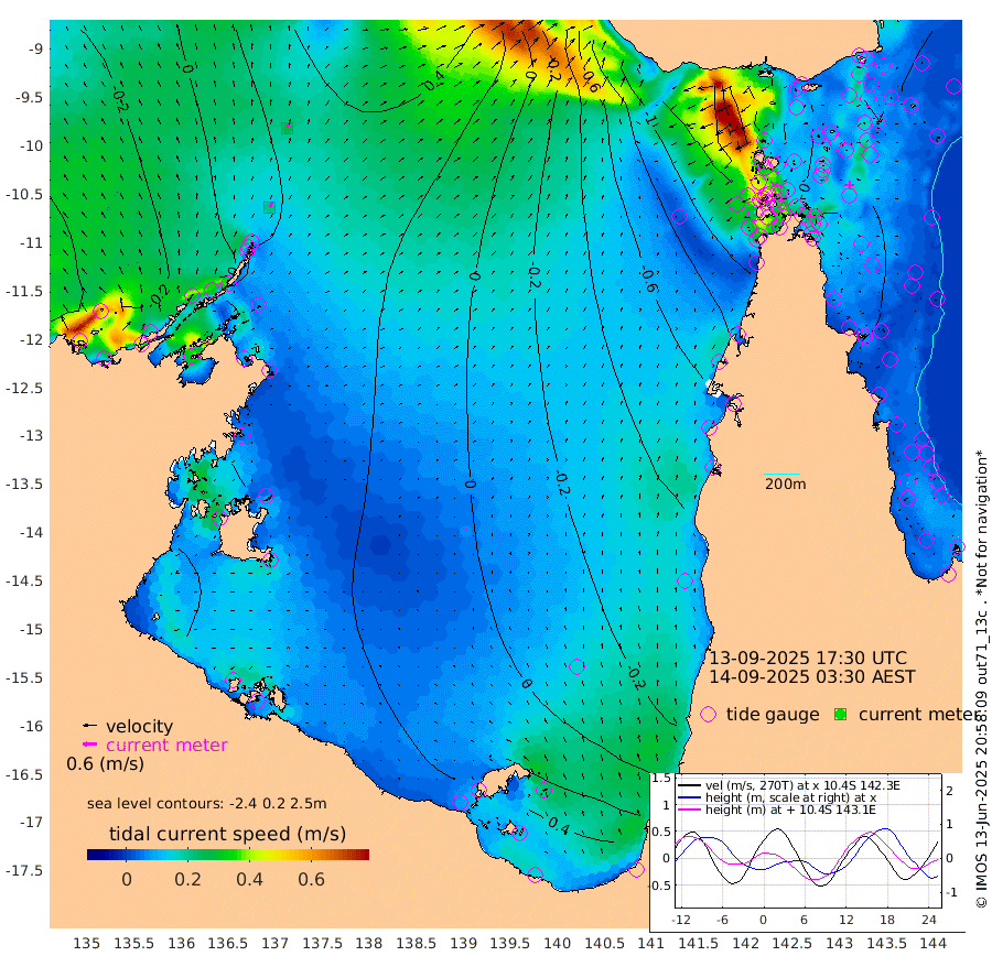 21cm/s 30T +3cm/s rms + 7cm/s -42T. ARA-GOC87 57m 8cm/s -28T +3cm/s rms + 2cm/s -2T. ARA-GOC87 60m 27cm/s 27T +2cm/s rms + 3cm/s 61T. ARA-GOC87 47m -1cm Daru 6cm Bobo Island 4cm Meer Island Barge 0cm Bramble Cay -2cm Unnamed Cay -6cm Pearce Cay 1cm Stephens Island -6cm Merrie England Shoals -9cm Mutacomal Reef 11cm Darnley Island Barge -1cm East Cay 9cm Yorke Island Barge -9cm Rennel Island 2cm Aureed Island -16cm Dungeness Reef -7cm Zagai Island -19cm Yam Island -33cm Dauan Island -17cm Saibai Island -39cm Phipi Reef -10cm Warrior Reef - West -66cm Mabuiag Island Barge -7cm Half Way Island -18cm Coconut Island -9cm Dugong Islet -24cm Poll Island -25cm Kirkcaldie Reef -46cm Suarji Island -11cm Sue Islet -153cm Hawkesbury Island -68cm Alert Patches -56cm Twin Island -144cm Badu Island -54cm St Pauls (Moa Island) -119cm Kubin (Moa Island) -81cm Ince Point -100cm Thursday Island -94cm Nardana Patches -123cm Turtle Head -127cm Round Island -159cm Goods Island -179cm Booby Island -177cm White Rocks Area -139cm Carpentaria -49cm Papou Point -175cm Bampfield Head -151cm Crab Island -170cm Red Wallis Island -143cm Packe Island -17cm Harrington Reef -144cm Herald Camp -5cm Sharp Point -107cm Red Island Point -80cm Possession Island -37cm Alpha Rock -38cm Frederick Point -13cm Wyborn Reef Light -17cm Tetley Island -7cm Triangle Reef -22cm Turtle Head Island -5cm Maclennan Cay -12cm Raine Island -4cm Mcsweeny Reef -1cm Collette Reef -3cm Shadwell Reef 1cm Hannibal Island -9cm Round Point -143cm Vrilya Point -6cm Cape Grenville -3cm Hicks Island 0cm Sir Charles Hardy Island 1cm Harvey Island -7cm Kay Reef -6cm Rocky Island -13cm Chapman Island -6cm Ham Reef -4cm Jubilee Reef -7cm Night Island -11cm Unnamed Reef No. 3 -8cm Morris Island -13cm 1st 3 Mile Opening -8cm Creech Reef -4cm Fife Island -2cm Eden Reef -6cm Stanley Island -1cm Normanby River -28cm Yabooma Island -17cm Hutchison River -16cm Elcho Island -16cm North West Crocodile Island 27cm Cape Wessel 1cm Stevens Island 69cm Guluwuru Island 1cm Hopeful Bay 11cm Auster Point 25cm Two Island Bay 34cm Cadell Strait 169cm Mallison Island 47cm Melville Bay (Gove Harbour) 48cm Truant Island 43cm Cape Arnhem 42cm Cape Grey 41cm Hawk Island 41cm Milner Bay (Groote Eylandt) 39cm Cape Beatrice 40cm West Island 37cm Centre Island 52cm Mornington Island 51cm West Wellesley Islands 55cm Bountiful Island 77cm Albert River Mouth 86cm Sweers Island 66cm Karumba 7cm Nassau River Offshore -26cm Christmas Creek -70cm Archer River -78cm Boyd Point -93cm Weipa (Humbug Point) -98cm Pennefather River -120cm Cullen Point