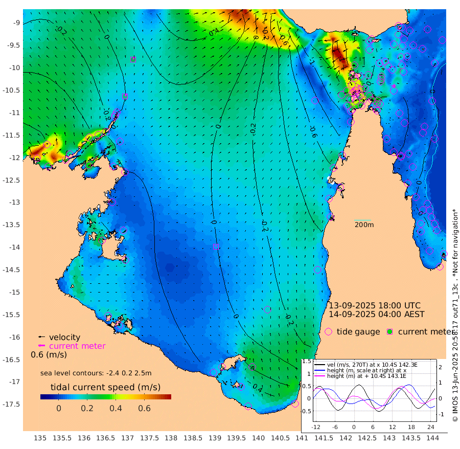 21cm/s 22T +3cm/s rms + 7cm/s -42T. ARA-GOC87 57m 9cm/s -8T +3cm/s rms + 2cm/s -2T. ARA-GOC87 60m 26cm/s 22T +2cm/s rms + 3cm/s 61T. ARA-GOC87 47m -5cm Daru 0cm Bobo Island 0cm Meer Island Barge -4cm Bramble Cay -4cm Unnamed Cay -12cm Pearce Cay -2cm Stephens Island -6cm Merrie England Shoals -10cm Mutacomal Reef 8cm Darnley Island Barge -5cm East Cay 5cm Yorke Island Barge -13cm Rennel Island -3cm Aureed Island -21cm Dungeness Reef -15cm Zagai Island -25cm Yam Island -48cm Dauan Island -28cm Saibai Island -54cm Phipi Reef -21cm Warrior Reef - West -70cm Mabuiag Island Barge -8cm Half Way Island -22cm Coconut Island -11cm Dugong Islet -29cm Poll Island -26cm Kirkcaldie Reef -53cm Suarji Island -13cm Sue Islet -154cm Hawkesbury Island -70cm Alert Patches -59cm Twin Island -150cm Badu Island -58cm St Pauls (Moa Island) -122cm Kubin (Moa Island) -83cm Ince Point -101cm Thursday Island -96cm Nardana Patches -126cm Turtle Head -130cm Round Island -161cm Goods Island -176cm Booby Island -176cm White Rocks Area -127cm Carpentaria -51cm Papou Point -174cm Bampfield Head -147cm Crab Island -167cm Red Wallis Island -145cm Packe Island -18cm Harrington Reef -145cm Herald Camp -4cm Sharp Point -108cm Red Island Point -82cm Possession Island -37cm Alpha Rock -40cm Frederick Point -16cm Wyborn Reef Light -19cm Tetley Island -12cm Triangle Reef -24cm Turtle Head Island -9cm Maclennan Cay -16cm Raine Island -7cm Mcsweeny Reef -4cm Collette Reef -6cm Shadwell Reef -1cm Hannibal Island -12cm Round Point -132cm Vrilya Point -7cm Cape Grenville -7cm Hicks Island -5cm Sir Charles Hardy Island 0cm Harvey Island -8cm Kay Reef -10cm Rocky Island -17cm Chapman Island -9cm Ham Reef -8cm Jubilee Reef -10cm Night Island -14cm Unnamed Reef No. 3 -11cm Morris Island -17cm 1st 3 Mile Opening -11cm Creech Reef -9cm Fife Island -7cm Eden Reef -8cm Stanley Island -4cm Normanby River -59cm Yabooma Island -58cm Hutchison River -49cm Elcho Island -48cm North West Crocodile Island 7cm Cape Wessel -27cm Stevens Island 46cm Guluwuru Island -25cm Hopeful Bay -12cm Auster Point 2cm Two Island Bay -1cm Cadell Strait 157cm Mallison Island 25cm Melville Bay (Gove Harbour) 25cm Truant Island 27cm Cape Arnhem 32cm Cape Grey 33cm Hawk Island 41cm Milner Bay (Groote Eylandt) 39cm Cape Beatrice 50cm West Island 48cm Centre Island 50cm Mornington Island 50cm West Wellesley Islands 45cm Bountiful Island 63cm Albert River Mouth 73cm Sweers Island 53cm Karumba 2cm Nassau River Offshore -30cm Christmas Creek -71cm Archer River -77cm Boyd Point -95cm Weipa (Humbug Point) -91cm Pennefather River -114cm Cullen Point