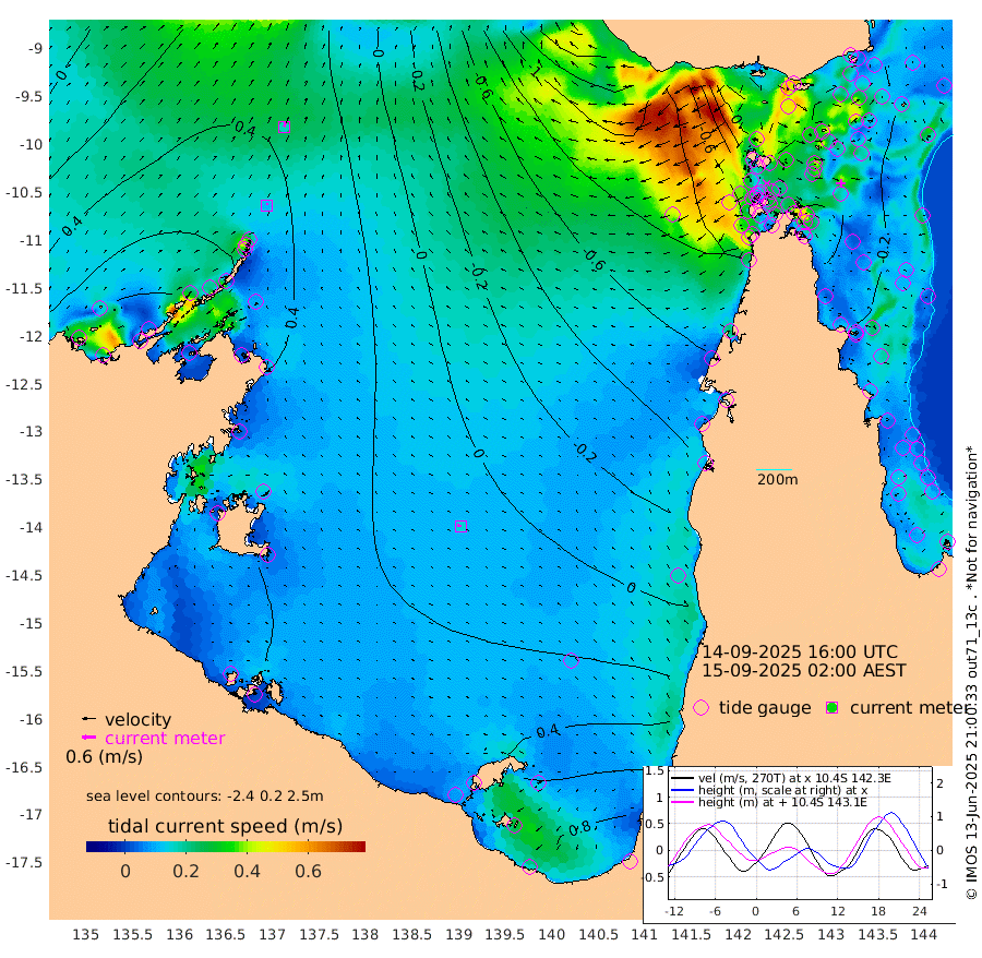 11cm/s -2T +3cm/s rms + 7cm/s -42T. ARA-GOC87 57m 15cm/s -83T +3cm/s rms + 2cm/s -2T. ARA-GOC87 60m 17cm/s 17T +2cm/s rms + 3cm/s 61T. ARA-GOC87 47m -36cm Daru -30cm Bobo Island -16cm Meer Island Barge -28cm Bramble Cay -42cm Unnamed Cay -33cm Pearce Cay -35cm Stephens Island -52cm Merrie England Shoals -51cm Mutacomal Reef -27cm Darnley Island Barge -20cm East Cay -31cm Yorke Island Barge -41cm Rennel Island -28cm Aureed Island -36cm Dungeness Reef -16cm Zagai Island -30cm Yam Island 13cm Dauan Island 7cm Saibai Island 10cm Phipi Reef -5cm Warrior Reef - West -38cm Mabuiag Island Barge -49cm Half Way Island -45cm Coconut Island -49cm Dugong Islet -43cm Poll Island -55cm Kirkcaldie Reef -38cm Suarji Island -41cm Sue Islet -94cm Hawkesbury Island -66cm Alert Patches -62cm Twin Island -74cm Badu Island -54cm St Pauls (Moa Island) -71cm Kubin (Moa Island) -65cm Ince Point -76cm Thursday Island -70cm Nardana Patches -73cm Turtle Head -74cm Round Island -88cm Goods Island -109cm Booby Island -107cm White Rocks Area -122cm Carpentaria -52cm Papou Point -108cm Bampfield Head -98cm Crab Island -107cm Red Wallis Island -86cm Packe Island -60cm Harrington Reef -84cm Herald Camp -13cm Sharp Point -73cm Red Island Point -63cm Possession Island -57cm Alpha Rock -58cm Frederick Point -51cm Wyborn Reef Light -52cm Tetley Island -18cm Triangle Reef -66cm Turtle Head Island -22cm Maclennan Cay -14cm Raine Island -39cm Mcsweeny Reef -34cm Collette Reef -21cm Shadwell Reef -37cm Hannibal Island -34cm Round Point -115cm Vrilya Point -35cm Cape Grenville -23cm Hicks Island -17cm Sir Charles Hardy Island -9cm Harvey Island -31cm Kay Reef -14cm Rocky Island -13cm Chapman Island -14cm Ham Reef -17cm Jubilee Reef -17cm Night Island -19cm Unnamed Reef No. 3 -18cm Morris Island -18cm 1st 3 Mile Opening -19cm Creech Reef -14cm Fife Island -12cm Eden Reef -25cm Stanley Island -22cm Normanby River 80cm Yabooma Island 111cm Hutchison River 95cm Elcho Island 90cm North West Crocodile Island 57cm Cape Wessel 75cm Stevens Island 78cm Guluwuru Island 76cm Hopeful Bay 60cm Auster Point 66cm Two Island Bay 103cm Cadell Strait 66cm Mallison Island 73cm Melville Bay (Gove Harbour) 69cm Truant Island 54cm Cape Arnhem 46cm Cape Grey 52cm Hawk Island 37cm Milner Bay (Groote Eylandt) 39cm Cape Beatrice 19cm West Island 16cm Centre Island 75cm Mornington Island 68cm West Wellesley Islands 114cm Bountiful Island 155cm Albert River Mouth 156cm Sweers Island 143cm Karumba 47cm Nassau River Offshore 13cm Christmas Creek -29cm Archer River -44cm Boyd Point -37cm Weipa (Humbug Point) -80cm Pennefather River -83cm Cullen Point