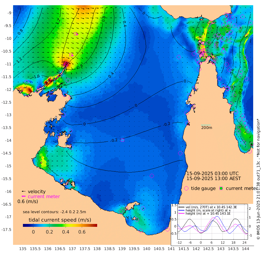 43cm/s 118T +3cm/s rms + 7cm/s -42T. ARA-GOC87 57m 8cm/s 29T +3cm/s rms + 2cm/s -2T. ARA-GOC87 60m 44cm/s 112T +2cm/s rms + 3cm/s 61T. ARA-GOC87 47m -56cm Daru -47cm Bobo Island -31cm Meer Island Barge -45cm Bramble Cay -62cm Unnamed Cay -44cm Pearce Cay -54cm Stephens Island -68cm Merrie England Shoals -67cm Mutacomal Reef -51cm Darnley Island Barge -35cm East Cay -53cm Yorke Island Barge -57cm Rennel Island -50cm Aureed Island -49cm Dungeness Reef -22cm Zagai Island -30cm Yam Island 12cm Dauan Island 8cm Saibai Island -4cm Phipi Reef -25cm Warrior Reef - West 14cm Mabuiag Island Barge -59cm Half Way Island -44cm Coconut Island -64cm Dugong Islet -40cm Poll Island -50cm Kirkcaldie Reef -35cm Suarji Island -43cm Sue Islet 53cm Hawkesbury Island -28cm Alert Patches -26cm Twin Island 61cm Badu Island -20cm St Pauls (Moa Island) 33cm Kubin (Moa Island) -6cm Ince Point 6cm Thursday Island 4cm Nardana Patches 21cm Turtle Head 34cm Round Island 50cm Goods Island 60cm Booby Island 52cm White Rocks Area 39cm Carpentaria -9cm Papou Point 58cm Bampfield Head 56cm Crab Island 53cm Red Wallis Island 33cm Packe Island -64cm Harrington Reef 36cm Herald Camp -16cm Sharp Point 24cm Red Island Point -3cm Possession Island -38cm Alpha Rock -39cm Frederick Point -52cm Wyborn Reef Light -48cm Tetley Island -24cm Triangle Reef -45cm Turtle Head Island -33cm Maclennan Cay -15cm Raine Island -55cm Mcsweeny Reef -53cm Collette Reef -34cm Shadwell Reef -59cm Hannibal Island -44cm Round Point 45cm Vrilya Point -52cm Cape Grenville -37cm Hicks Island -39cm Sir Charles Hardy Island -15cm Harvey Island -44cm Kay Reef -28cm Rocky Island -19cm Chapman Island -21cm Ham Reef -24cm Jubilee Reef -28cm Night Island -23cm Unnamed Reef No. 3 -29cm Morris Island -23cm 1st 3 Mile Opening -28cm Creech Reef -29cm Fife Island -27cm Eden Reef -37cm Stanley Island -38cm Normanby River 179cm Yabooma Island 208cm Hutchison River 180cm Elcho Island 171cm North West Crocodile Island 126cm Cape Wessel 164cm Stevens Island 107cm Guluwuru Island 144cm Hopeful Bay 136cm Auster Point 140cm Two Island Bay 188cm Cadell Strait 64cm Mallison Island 100cm Melville Bay (Gove Harbour) 110cm Truant Island 65cm Cape Arnhem 25cm Cape Grey 4cm Hawk Island -27cm Milner Bay (Groote Eylandt) -46cm Cape Beatrice -97cm West Island -95cm Centre Island -107cm Mornington Island -117cm West Wellesley Islands -113cm Bountiful Island -105cm Albert River Mouth -112cm Sweers Island -108cm Karumba -82cm Nassau River Offshore -54cm Christmas Creek -7cm Archer River 6cm Boyd Point 12cm Weipa (Humbug Point) 20cm Pennefather River 33cm Cullen Point