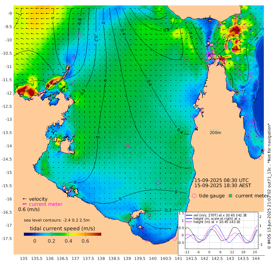 7cm/s -144T +3cm/s rms + 7cm/s -42T. ARA-GOC87 57m 34cm/s 161T +3cm/s rms + 2cm/s -2T. ARA-GOC87 60m 17cm/s -113T +2cm/s rms + 3cm/s 61T. ARA-GOC87 47m 105cm Daru 101cm Bobo Island 96cm Meer Island Barge 107cm Bramble Cay 118cm Unnamed Cay 110cm Pearce Cay 117cm Stephens Island 126cm Merrie England Shoals 114cm Mutacomal Reef 115cm Darnley Island Barge 99cm East Cay 111cm Yorke Island Barge 109cm Rennel Island 105cm Aureed Island 98cm Dungeness Reef 54cm Zagai Island 61cm Yam Island 16cm Dauan Island 18cm Saibai Island 24cm Phipi Reef 55cm Warrior Reef - West 24cm Mabuiag Island Barge 116cm Half Way Island 96cm Coconut Island 116cm Dugong Islet 82cm Poll Island 97cm Kirkcaldie Reef 63cm Suarji Island 84cm Sue Islet 46cm Hawkesbury Island 77cm Alert Patches 74cm Twin Island 31cm Badu Island 63cm St Pauls (Moa Island) 47cm Kubin (Moa Island) 61cm Ince Point 59cm Thursday Island 57cm Nardana Patches 56cm Turtle Head 36cm Round Island 52cm Goods Island 54cm Booby Island 50cm White Rocks Area 70cm Carpentaria 52cm Papou Point 51cm Bampfield Head 41cm Crab Island 54cm Red Wallis Island 59cm Packe Island 118cm Harrington Reef 48cm Herald Camp 15cm Sharp Point 44cm Red Island Point 53cm Possession Island 74cm Alpha Rock 89cm Frederick Point 104cm Wyborn Reef Light 97cm Tetley Island 82cm Triangle Reef 117cm Turtle Head Island 95cm Maclennan Cay 79cm Raine Island 113cm Mcsweeny Reef 109cm Collette Reef 93cm Shadwell Reef 120cm Hannibal Island 110cm Round Point 58cm Vrilya Point 111cm Cape Grenville 99cm Hicks Island 107cm Sir Charles Hardy Island 34cm Harvey Island 107cm Kay Reef 89cm Rocky Island 84cm Chapman Island 84cm Ham Reef 89cm Jubilee Reef 85cm Night Island 88cm Unnamed Reef No. 3 94cm Morris Island 91cm 1st 3 Mile Opening 95cm Creech Reef 91cm Fife Island 104cm Eden Reef 103cm Stanley Island 105cm Normanby River -154cm Yabooma Island -173cm Hutchison River -161cm Elcho Island -162cm North West Crocodile Island -82cm Cape Wessel -133cm Stevens Island -45cm Guluwuru Island -124cm Hopeful Bay -99cm Auster Point -100cm Two Island Bay -125cm Cadell Strait 65cm Mallison Island -57cm Melville Bay (Gove Harbour) -56cm Truant Island -34cm Cape Arnhem -34cm Cape Grey -39cm Hawk Island -47cm Milner Bay (Groote Eylandt) -36cm Cape Beatrice -21cm West Island -23cm Centre Island -25cm Mornington Island -15cm West Wellesley Islands -49cm Bountiful Island -109cm Albert River Mouth -118cm Sweers Island -99cm Karumba 13cm Nassau River Offshore 45cm Christmas Creek 50cm Archer River 56cm Boyd Point 49cm Weipa (Humbug Point) 56cm Pennefather River 49cm Cullen Point