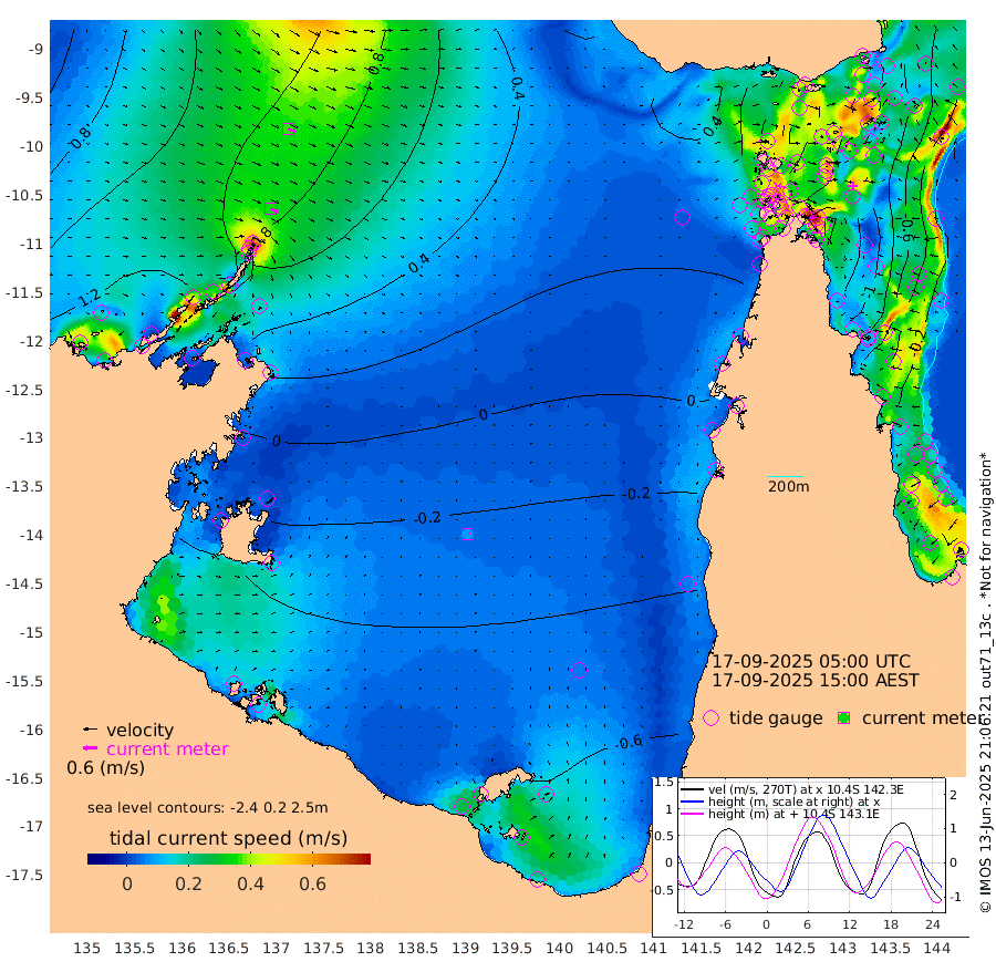 36cm/s 118T +3cm/s rms + 7cm/s -42T. ARA-GOC87 57m 8cm/s 62T +3cm/s rms + 2cm/s -2T. ARA-GOC87 60m 36cm/s 114T +2cm/s rms + 3cm/s 61T. ARA-GOC87 47m -110cm Daru -100cm Bobo Island -41cm Meer Island Barge -70cm Bramble Cay -100cm Unnamed Cay -95cm Pearce Cay -92cm Stephens Island -105cm Merrie England Shoals -116cm Mutacomal Reef -77cm Darnley Island Barge -51cm East Cay -89cm Yorke Island Barge -106cm Rennel Island -97cm Aureed Island -104cm Dungeness Reef -75cm Zagai Island -83cm Yam Island -30cm Dauan Island -21cm Saibai Island -60cm Phipi Reef -82cm Warrior Reef - West -18cm Mabuiag Island Barge -105cm Half Way Island -102cm Coconut Island -112cm Dugong Islet -97cm Poll Island -106cm Kirkcaldie Reef -95cm Suarji Island -87cm Sue Islet 39cm Hawkesbury Island -80cm Alert Patches -80cm Twin Island 33cm Badu Island -76cm St Pauls (Moa Island) 4cm Kubin (Moa Island) -49cm Ince Point -31cm Thursday Island -35cm Nardana Patches -11cm Turtle Head 14cm Round Island 34cm Goods Island 60cm Booby Island 41cm White Rocks Area 64cm Carpentaria -59cm Papou Point 63cm Bampfield Head 50cm Crab Island 46cm Red Wallis Island 8cm Packe Island -125cm Harrington Reef 35cm Herald Camp -31cm Sharp Point -7cm Red Island Point -43cm Possession Island -80cm Alpha Rock -96cm Frederick Point -105cm Wyborn Reef Light -102cm Tetley Island -39cm Triangle Reef -103cm Turtle Head Island -46cm Maclennan Cay -19cm Raine Island -92cm Mcsweeny Reef -82cm Collette Reef -44cm Shadwell Reef -89cm Hannibal Island -73cm Round Point 51cm Vrilya Point -68cm Cape Grenville -55cm Hicks Island -46cm Sir Charles Hardy Island -22cm Harvey Island -49cm Kay Reef -32cm Rocky Island -18cm Chapman Island -18cm Ham Reef -26cm Jubilee Reef -35cm Night Island -23cm Unnamed Reef No. 3 -35cm Morris Island -24cm 1st 3 Mile Opening -31cm Creech Reef -41cm Fife Island -26cm Eden Reef -37cm Stanley Island -44cm Normanby River 135cm Yabooma Island 147cm Hutchison River 133cm Elcho Island 122cm North West Crocodile Island 104cm Cape Wessel 122cm Stevens Island 88cm Guluwuru Island 115cm Hopeful Bay 107cm Auster Point 114cm Two Island Bay 137cm Cadell Strait 102cm Mallison Island 77cm Melville Bay (Gove Harbour) 87cm Truant Island 50cm Cape Arnhem 13cm Cape Grey -7cm Hawk Island -32cm Milner Bay (Groote Eylandt) -52cm Cape Beatrice -93cm West Island -90cm Centre Island -122cm Mornington Island -127cm West Wellesley Islands -126cm Bountiful Island -135cm Albert River Mouth -137cm Sweers Island -141cm Karumba -96cm Nassau River Offshore -61cm Christmas Creek -5cm Archer River 14cm Boyd Point 19cm Weipa (Humbug Point) 21cm Pennefather River 45cm Cullen Point