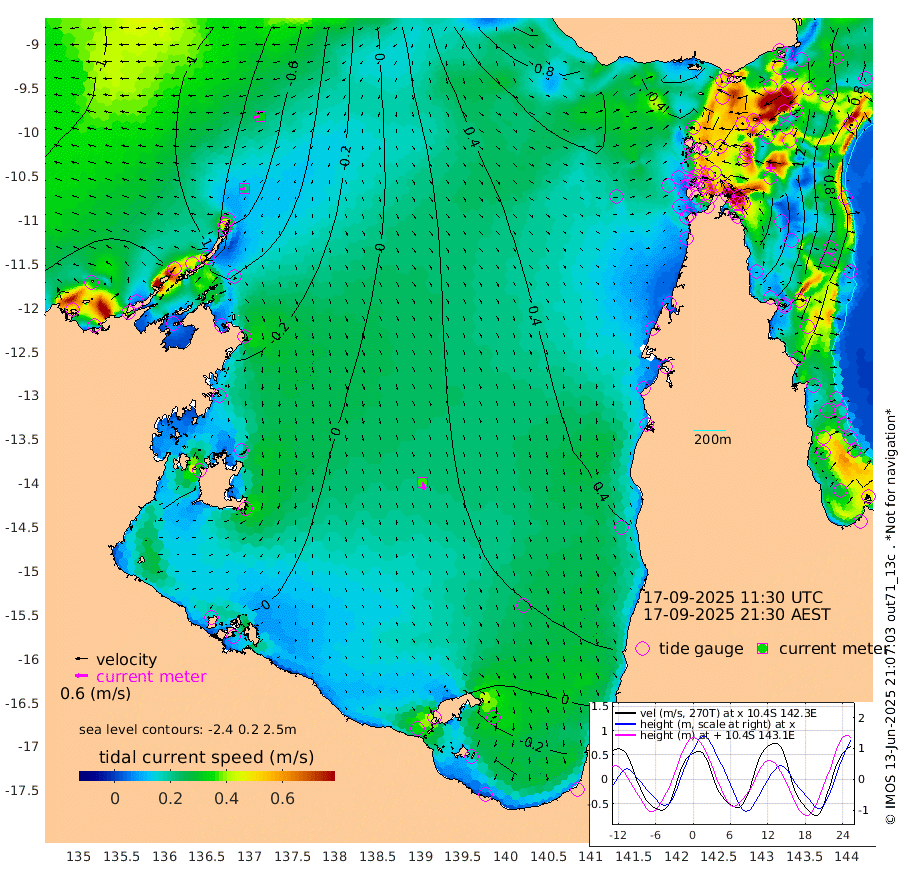 21cm/s -105T +3cm/s rms + 7cm/s -42T. ARA-GOC87 57m 36cm/s 170T +3cm/s rms + 2cm/s -2T. ARA-GOC87 60m 32cm/s -104T +2cm/s rms + 3cm/s 61T. ARA-GOC87 47m 168cm Daru 154cm Bobo Island 80cm Meer Island Barge 113cm Bramble Cay 152cm Unnamed Cay 156cm Pearce Cay 143cm Stephens Island 154cm Merrie England Shoals 175cm Mutacomal Reef 125cm Darnley Island Barge 91cm East Cay 143cm Yorke Island Barge 163cm Rennel Island 150cm Aureed Island 169cm Dungeness Reef 140cm Zagai Island 156cm Yam Island 117cm Dauan Island 102cm Saibai Island 130cm Phipi Reef 154cm Warrior Reef - West 114cm Mabuiag Island Barge 164cm Half Way Island 166cm Coconut Island 178cm Dugong Islet 168cm Poll Island 179cm Kirkcaldie Reef 169cm Suarji Island 157cm Sue Islet 125cm Hawkesbury Island 175cm Alert Patches 173cm Twin Island 114cm Badu Island 171cm St Pauls (Moa Island) 131cm Kubin (Moa Island) 155cm Ince Point 148cm Thursday Island 148cm Nardana Patches 138cm Turtle Head 111cm Round Island 116cm Goods Island 102cm Booby Island 110cm White Rocks Area 76cm Carpentaria 145cm Papou Point 93cm Bampfield Head 81cm Crab Island 109cm Red Wallis Island 134cm Packe Island 193cm Harrington Reef 110cm Herald Camp 48cm Sharp Point 121cm Red Island Point 137cm Possession Island 157cm Alpha Rock 179cm Frederick Point 171cm Wyborn Reef Light 172cm Tetley Island 85cm Triangle Reef 183cm Turtle Head Island 90cm Maclennan Cay 55cm Raine Island 145cm Mcsweeny Reef 127cm Collette Reef 83cm Shadwell Reef 135cm Hannibal Island 121cm Round Point 78cm Vrilya Point 111cm Cape Grenville 97cm Hicks Island 96cm Sir Charles Hardy Island 34cm Harvey Island 89cm Kay Reef 68cm Rocky Island 57cm Chapman Island 56cm Ham Reef 65cm Jubilee Reef 69cm Night Island 62cm Unnamed Reef No. 3 73cm Morris Island 64cm 1st 3 Mile Opening 70cm Creech Reef 75cm Fife Island 65cm Eden Reef 74cm Stanley Island 81cm Normanby River -122cm Yabooma Island -133cm Hutchison River -132cm Elcho Island -123cm North West Crocodile Island -88cm Cape Wessel -117cm Stevens Island -71cm Guluwuru Island -118cm Hopeful Bay -96cm Auster Point -98cm Two Island Bay -113cm Cadell Strait -77cm Mallison Island -69cm Melville Bay (Gove Harbour) -71cm Truant Island -49cm Cape Arnhem -41cm Cape Grey -40cm Hawk Island -53cm Milner Bay (Groote Eylandt) -33cm Cape Beatrice -17cm West Island -25cm Centre Island -9cm Mornington Island -4cm West Wellesley Islands -26cm Bountiful Island -79cm Albert River Mouth -97cm Sweers Island -58cm Karumba 34cm Nassau River Offshore 61cm Christmas Creek 57cm Archer River 65cm Boyd Point 61cm Weipa (Humbug Point) 63cm Pennefather River 67cm Cullen Point