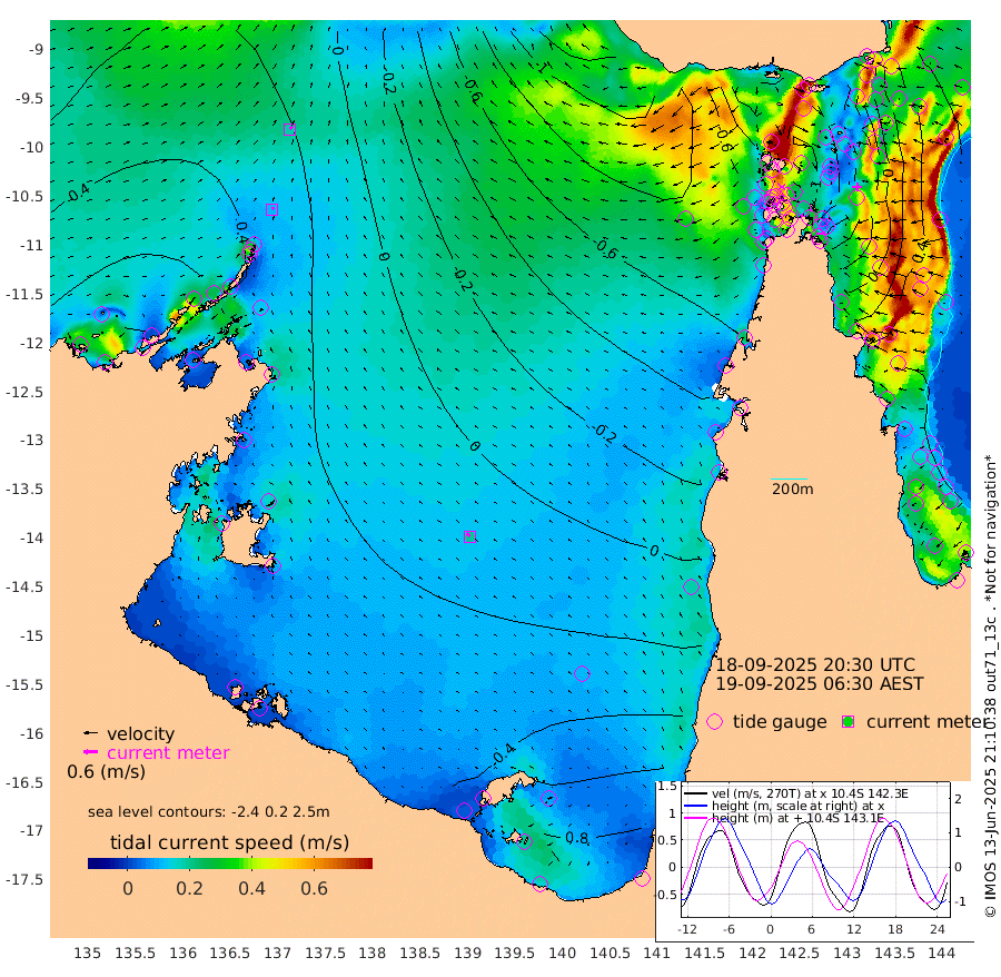 11cm/s 25T +3cm/s rms + 7cm/s -42T. ARA-GOC87 57m 19cm/s -45T +3cm/s rms + 2cm/s -2T. ARA-GOC87 60m 18cm/s 40T +2cm/s rms + 3cm/s 61T. ARA-GOC87 47m -42cm Daru -25cm Bobo Island 36cm Meer Island Barge 29cm Bramble Cay -7cm Unnamed Cay -11cm Pearce Cay 5cm Stephens Island 6cm Merrie England Shoals -36cm Mutacomal Reef 10cm Darnley Island Barge 42cm East Cay -18cm Yorke Island Barge -24cm Rennel Island -24cm Aureed Island -57cm Dungeness Reef -104cm Zagai Island -112cm Yam Island -141cm Dauan Island -135cm Saibai Island -118cm Phipi Reef -109cm Warrior Reef - West -143cm Mabuiag Island Barge -28cm Half Way Island -58cm Coconut Island -48cm Dugong Islet -88cm Poll Island -83cm Kirkcaldie Reef -119cm Suarji Island -90cm Sue Islet -146cm Hawkesbury Island -124cm Alert Patches -123cm Twin Island -143cm Badu Island -143cm St Pauls (Moa Island) -139cm Kubin (Moa Island) -134cm Ince Point -138cm Thursday Island -138cm Nardana Patches -127cm Turtle Head -132cm Round Island -123cm Goods Island -130cm Booby Island -122cm White Rocks Area -124cm Carpentaria -123cm Papou Point -137cm Bampfield Head -105cm Crab Island -127cm Red Wallis Island -128cm Packe Island -57cm Harrington Reef -137cm Herald Camp -44cm Sharp Point -112cm Red Island Point -121cm Possession Island -107cm Alpha Rock -96cm Frederick Point -54cm Wyborn Reef Light -69cm Tetley Island 11cm Triangle Reef -58cm Turtle Head Island 24cm Maclennan Cay 46cm Raine Island -8cm Mcsweeny Reef 7cm Collette Reef 29cm Shadwell Reef 16cm Hannibal Island 29cm Round Point -102cm Vrilya Point 30cm Cape Grenville 31cm Hicks Island 29cm Sir Charles Hardy Island 8cm Harvey Island 47cm Kay Reef 46cm Rocky Island 54cm Chapman Island 47cm Ham Reef 44cm Jubilee Reef 39cm Night Island 50cm Unnamed Reef No. 3 50cm Morris Island 42cm 1st 3 Mile Opening 46cm Creech Reef 53cm Fife Island 72cm Eden Reef 55cm Stanley Island 63cm Normanby River 56cm Yabooma Island 67cm Hutchison River 65cm Elcho Island 58cm North West Crocodile Island 34cm Cape Wessel 57cm Stevens Island 41cm Guluwuru Island 65cm Hopeful Bay 41cm Auster Point 33cm Two Island Bay 60cm Cadell Strait 92cm Mallison Island 39cm Melville Bay (Gove Harbour) 33cm Truant Island 27cm Cape Arnhem 32cm Cape Grey 39cm Hawk Island 46cm Milner Bay (Groote Eylandt) 50cm Cape Beatrice 44cm West Island 48cm Centre Island 93cm Mornington Island 96cm West Wellesley Islands 115cm Bountiful Island 162cm Albert River Mouth 171cm Sweers Island 147cm Karumba 65cm Nassau River Offshore 26cm Christmas Creek -9cm Archer River -44cm Boyd Point -35cm Weipa (Humbug Point) -54cm Pennefather River -89cm Cullen Point