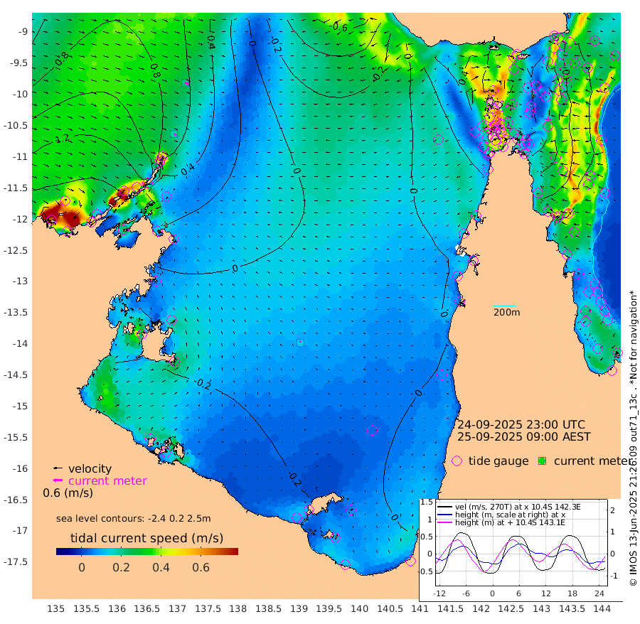 18cm/s 128T +3cm/s rms + 7cm/s -42T. ARA-GOC87 57m 14cm/s -19T +3cm/s rms + 2cm/s -2T. ARA-GOC87 60m 21cm/s 115T +2cm/s rms + 3cm/s 61T. ARA-GOC87 47m -1cm Daru 0cm Bobo Island 21cm Meer Island Barge 27cm Bramble Cay 16cm Unnamed Cay 12cm Pearce Cay 16cm Stephens Island 26cm Merrie England Shoals 5cm Mutacomal Reef 8cm Darnley Island Barge 28cm East Cay -3cm Yorke Island Barge 10cm Rennel Island -10cm Aureed Island -7cm Dungeness Reef -42cm Zagai Island -34cm Yam Island -54cm Dauan Island -66cm Saibai Island -30cm Phipi Reef -48cm Warrior Reef - West -25cm Mabuiag Island Barge 7cm Half Way Island -5cm Coconut Island -6cm Dugong Islet -19cm Poll Island -9cm Kirkcaldie Reef -35cm Suarji Island -29cm Sue Islet 54cm Hawkesbury Island -12cm Alert Patches -18cm Twin Island 35cm Badu Island -29cm St Pauls (Moa Island) 23cm Kubin (Moa Island) -9cm Ince Point 1cm Thursday Island -3cm Nardana Patches 19cm Turtle Head 41cm Round Island 46cm Goods Island 52cm Booby Island 53cm White Rocks Area 9cm Carpentaria -15cm Papou Point 61cm Bampfield Head 54cm Crab Island 42cm Red Wallis Island 31cm Packe Island -3cm Harrington Reef 43cm Herald Camp -19cm Sharp Point 28cm Red Island Point 11cm Possession Island -23cm Alpha Rock -12cm Frederick Point 4cm Wyborn Reef Light -2cm Tetley Island 11cm Triangle Reef 23cm Turtle Head Island 16cm Maclennan Cay 32cm Raine Island 10cm Mcsweeny Reef 15cm Collette Reef 21cm Shadwell Reef 20cm Hannibal Island 35cm Round Point 46cm Vrilya Point 26cm Cape Grenville 28cm Hicks Island 12cm Sir Charles Hardy Island 7cm Harvey Island 31cm Kay Reef 28cm Rocky Island 29cm Chapman Island 24cm Ham Reef 26cm Jubilee Reef 23cm Night Island 26cm Unnamed Reef No. 3 32cm Morris Island 30cm 1st 3 Mile Opening 26cm Creech Reef 28cm Fife Island 36cm Eden Reef 34cm Stanley Island 38cm Normanby River 162cm Yabooma Island 173cm Hutchison River 152cm Elcho Island 149cm North West Crocodile Island 65cm Cape Wessel 134cm Stevens Island 35cm Guluwuru Island 125cm Hopeful Bay 99cm Auster Point 95cm Two Island Bay 126cm Cadell Strait -33cm Mallison Island 45cm Melville Bay (Gove Harbour) 46cm Truant Island 18cm Cape Arnhem 10cm Cape Grey 7cm Hawk Island -9cm Milner Bay (Groote Eylandt) -15cm Cape Beatrice -46cm West Island -41cm Centre Island -34cm Mornington Island -41cm West Wellesley Islands -33cm Bountiful Island -16cm Albert River Mouth -10cm Sweers Island -5cm Karumba -20cm Nassau River Offshore -12cm Christmas Creek 19cm Archer River 9cm Boyd Point 22cm Weipa (Humbug Point) 38cm Pennefather River 27cm Cullen Point