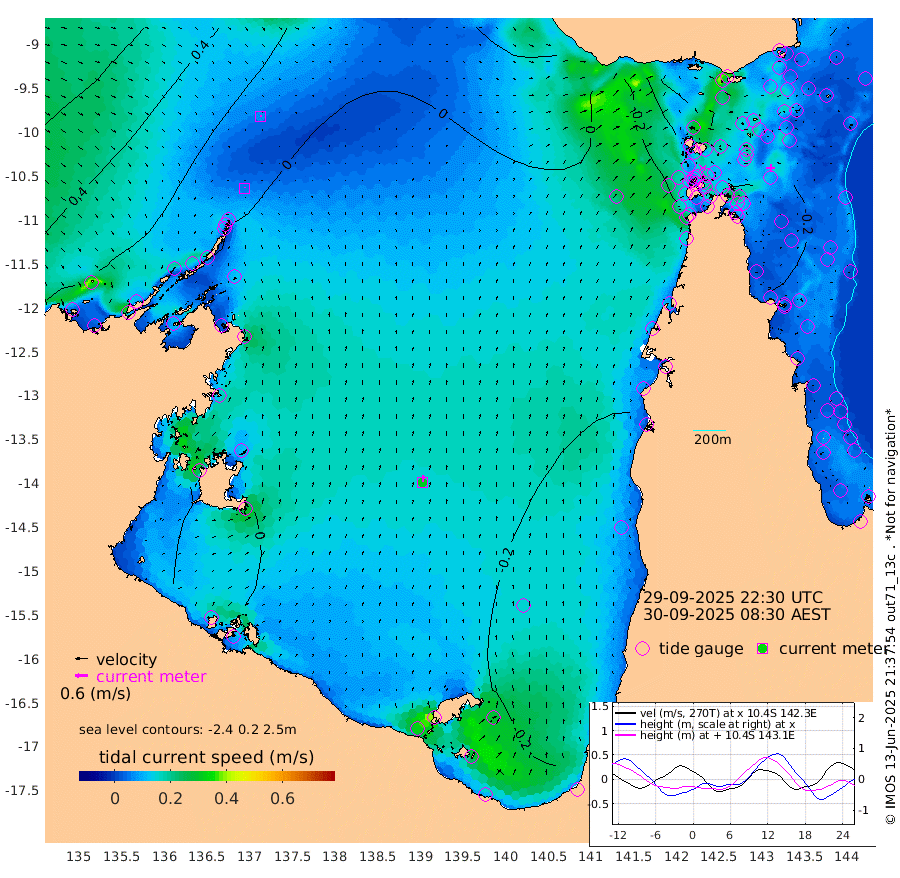 5cm/s 13T +3cm/s rms + 7cm/s -42T. ARA-GOC87 57m 30cm/s 6T +3cm/s rms + 2cm/s -2T. ARA-GOC87 60m 7cm/s 90T +2cm/s rms + 3cm/s 61T. ARA-GOC87 47m -28cm Daru -18cm Bobo Island -24cm Meer Island Barge -19cm Bramble Cay -23cm Unnamed Cay -18cm Pearce Cay -17cm Stephens Island -15cm Merrie England Shoals -20cm Mutacomal Reef -27cm Darnley Island Barge -16cm East Cay -28cm Yorke Island Barge -17cm Rennel Island -20cm Aureed Island -32cm Dungeness Reef -44cm Zagai Island -40cm Yam Island -90cm Dauan Island -80cm Saibai Island -91cm Phipi Reef -60cm Warrior Reef - West -49cm Mabuiag Island Barge -14cm Half Way Island -18cm Coconut Island -20cm Dugong Islet -25cm Poll Island -25cm Kirkcaldie Reef -30cm Suarji Island -36cm Sue Islet -45cm Hawkesbury Island -32cm Alert Patches -25cm Twin Island -50cm Badu Island -35cm St Pauls (Moa Island) -40cm Kubin (Moa Island) -32cm Ince Point -31cm Thursday Island -33cm Nardana Patches -40cm Turtle Head -39cm Round Island -38cm Goods Island -28cm Booby Island -13cm White Rocks Area 0cm Carpentaria -22cm Papou Point -28cm Bampfield Head -18cm Crab Island -19cm Red Wallis Island -33cm Packe Island -6cm Harrington Reef -47cm Herald Camp -10cm Sharp Point -25cm Red Island Point -29cm Possession Island -20cm Alpha Rock -19cm Frederick Point -18cm Wyborn Reef Light -20cm Tetley Island -24cm Triangle Reef -16cm Turtle Head Island -19cm Maclennan Cay -19cm Raine Island -19cm Mcsweeny Reef -22cm Collette Reef -27cm Shadwell Reef -22cm Hannibal Island -15cm Round Point -9cm Vrilya Point -15cm Cape Grenville -19cm Hicks Island -31cm Sir Charles Hardy Island -5cm Harvey Island -15cm Kay Reef -22cm Rocky Island -21cm Chapman Island -20cm Ham Reef -22cm Jubilee Reef -17cm Night Island -15cm Unnamed Reef No. 3 -19cm Morris Island -24cm 1st 3 Mile Opening -20cm Creech Reef -12cm Fife Island -24cm Eden Reef -18cm Stanley Island -11cm Normanby River 19cm Yabooma Island 8cm Hutchison River 18cm Elcho Island 21cm North West Crocodile Island 18cm Cape Wessel 19cm Stevens Island -26cm Guluwuru Island 11cm Hopeful Bay 15cm Auster Point 10cm Two Island Bay -11cm Cadell Strait -90cm Mallison Island -18cm Melville Bay (Gove Harbour) -14cm Truant Island -14cm Cape Arnhem -5cm Cape Grey -5cm Hawk Island 26cm Milner Bay (Groote Eylandt) 22cm Cape Beatrice 38cm West Island 40cm Centre Island -11cm Mornington Island -5cm West Wellesley Islands -33cm Bountiful Island -13cm Albert River Mouth -8cm Sweers Island -22cm Karumba -38cm Nassau River Offshore -51cm Christmas Creek -42cm Archer River -38cm Boyd Point -46cm Weipa (Humbug Point) -18cm Pennefather River -23cm Cullen Point