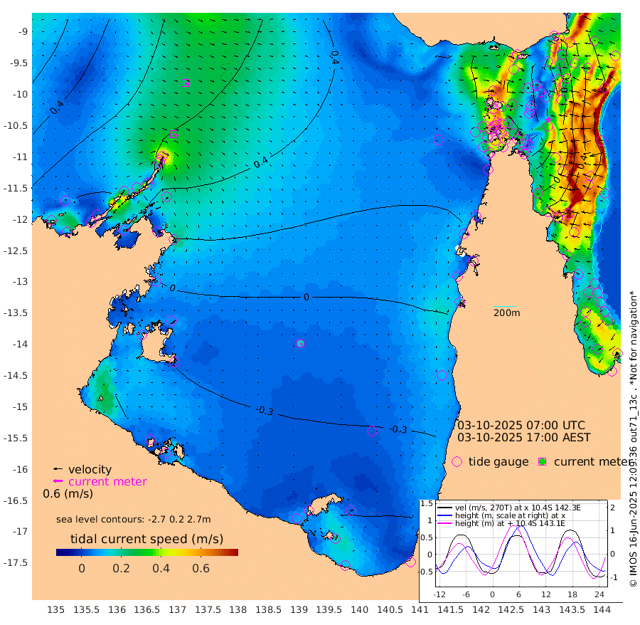 27cm/s 120T +3cm/s rms + 7cm/s -42T. ARA-GOC87 57m 16cm/s 153T +3cm/s rms + 2cm/s -2T. ARA-GOC87 60m 23cm/s 121T +2cm/s rms + 3cm/s 61T. ARA-GOC87 47m -16cm Daru -12cm Bobo Island 55cm Meer Island Barge 40cm Bramble Cay 16cm Unnamed Cay 5cm Pearce Cay 24cm Stephens Island 19cm Merrie England Shoals -12cm Mutacomal Reef 33cm Darnley Island Barge 50cm East Cay 9cm Yorke Island Barge -2cm Rennel Island -9cm Aureed Island -22cm Dungeness Reef -54cm Zagai Island -48cm Yam Island -54cm Dauan Island -54cm Saibai Island -73cm Phipi Reef -60cm Warrior Reef - West -42cm Mabuiag Island Barge 6cm Half Way Island -31cm Coconut Island -6cm Dugong Islet -40cm Poll Island -30cm Kirkcaldie Reef -70cm Suarji Island -35cm Sue Islet 30cm Hawkesbury Island -49cm Alert Patches -47cm Twin Island 8cm Badu Island -57cm St Pauls (Moa Island) 6cm Kubin (Moa Island) -34cm Ince Point -21cm Thursday Island -26cm Nardana Patches -3cm Turtle Head 2cm Round Island 34cm Goods Island 51cm Booby Island 40cm White Rocks Area 54cm Carpentaria -44cm Papou Point 45cm Bampfield Head 37cm Crab Island 40cm Red Wallis Island 15cm Packe Island -25cm Harrington Reef 32cm Herald Camp -29cm Sharp Point -10cm Red Island Point -35cm Possession Island -41cm Alpha Rock -40cm Frederick Point -19cm Wyborn Reef Light -27cm Tetley Island 32cm Triangle Reef -2cm Turtle Head Island 48cm Maclennan Cay 61cm Raine Island 13cm Mcsweeny Reef 21cm Collette Reef 45cm Shadwell Reef 27cm Hannibal Island 37cm Round Point 46cm Vrilya Point 42cm Cape Grenville 46cm Hicks Island 60cm Sir Charles Hardy Island 13cm Harvey Island 58cm Kay Reef 59cm Rocky Island 61cm Chapman Island 63cm Ham Reef 63cm Jubilee Reef 50cm Night Island 60cm Unnamed Reef No. 3 63cm Morris Island 69cm 1st 3 Mile Opening 64cm Creech Reef 54cm Fife Island 84cm Eden Reef 70cm Stanley Island 71cm Normanby River 89cm Yabooma Island 89cm Hutchison River 75cm Elcho Island 65cm North West Crocodile Island 68cm Cape Wessel 74cm Stevens Island 78cm Guluwuru Island 68cm Hopeful Bay 68cm Auster Point 80cm Two Island Bay 97cm Cadell Strait 138cm Mallison Island 58cm Melville Bay (Gove Harbour) 66cm Truant Island 36cm Cape Arnhem 6cm Cape Grey -21cm Hawk Island -43cm Milner Bay (Groote Eylandt) -50cm Cape Beatrice -80cm West Island -86cm Centre Island -98cm Mornington Island -88cm West Wellesley Islands -98cm Bountiful Island -127cm Albert River Mouth -146cm Sweers Island -137cm Karumba -55cm Nassau River Offshore -17cm Christmas Creek 17cm Archer River 30cm Boyd Point 36cm Weipa (Humbug Point) 28cm Pennefather River 39cm Cullen Point