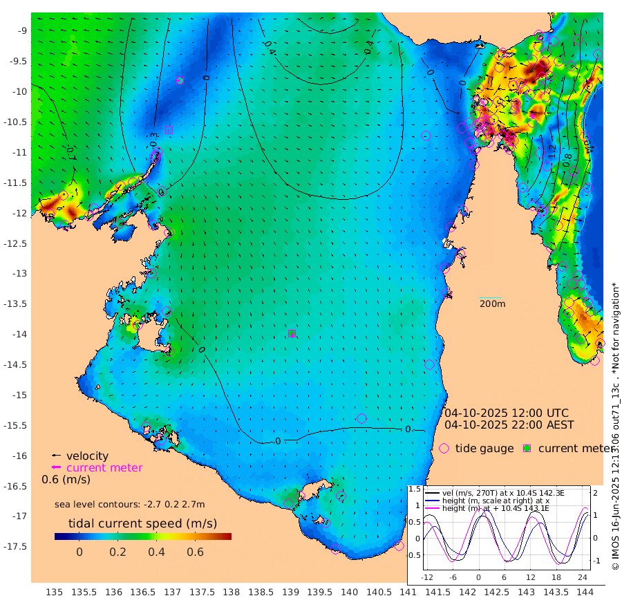 9cm/s -112T +3cm/s rms + 7cm/s -42T. ARA-GOC87 57m 30cm/s 171T +3cm/s rms + 2cm/s -2T. ARA-GOC87 60m 18cm/s -100T +2cm/s rms + 3cm/s 61T. ARA-GOC87 47m 159cm Daru 145cm Bobo Island 58cm Meer Island Barge 100cm Bramble Cay 140cm Unnamed Cay 136cm Pearce Cay 122cm Stephens Island 143cm Merrie England Shoals 171cm Mutacomal Reef 104cm Darnley Island Barge 69cm East Cay 126cm Yorke Island Barge 146cm Rennel Island 133cm Aureed Island 149cm Dungeness Reef 141cm Zagai Island 152cm Yam Island 118cm Dauan Island 109cm Saibai Island 120cm Phipi Reef 154cm Warrior Reef - West 104cm Mabuiag Island Barge 143cm Half Way Island 156cm Coconut Island 156cm Dugong Islet 157cm Poll Island 158cm Kirkcaldie Reef 150cm Suarji Island 146cm Sue Islet 80cm Hawkesbury Island 149cm Alert Patches 154cm Twin Island 82cm Badu Island 154cm St Pauls (Moa Island) 100cm Kubin (Moa Island) 131cm Ince Point 117cm Thursday Island 120cm Nardana Patches 100cm Turtle Head 76cm Round Island 68cm Goods Island 43cm Booby Island 58cm White Rocks Area 23cm Carpentaria 129cm Papou Point 38cm Bampfield Head 32cm Crab Island 60cm Red Wallis Island 100cm Packe Island 170cm Harrington Reef 61cm Herald Camp 46cm Sharp Point 83cm Red Island Point 105cm Possession Island 153cm Alpha Rock 162cm Frederick Point 169cm Wyborn Reef Light 172cm Tetley Island 72cm Triangle Reef 158cm Turtle Head Island 66cm Maclennan Cay 33cm Raine Island 129cm Mcsweeny Reef 112cm Collette Reef 66cm Shadwell Reef 120cm Hannibal Island 106cm Round Point 25cm Vrilya Point 91cm Cape Grenville 74cm Hicks Island 76cm Sir Charles Hardy Island 26cm Harvey Island 70cm Kay Reef 47cm Rocky Island 38cm Chapman Island 35cm Ham Reef 44cm Jubilee Reef 48cm Night Island 42cm Unnamed Reef No. 3 50cm Morris Island 34cm 1st 3 Mile Opening 43cm Creech Reef 56cm Fife Island 40cm Eden Reef 48cm Stanley Island 56cm Normanby River -58cm Yabooma Island -54cm Hutchison River -60cm Elcho Island -55cm North West Crocodile Island -25cm Cape Wessel -36cm Stevens Island -8cm Guluwuru Island -48cm Hopeful Bay -40cm Auster Point -38cm Two Island Bay -36cm Cadell Strait 64cm Mallison Island -11cm Melville Bay (Gove Harbour) -11cm Truant Island -8cm Cape Arnhem -20cm Cape Grey -16cm Hawk Island -39cm Milner Bay (Groote Eylandt) -25cm Cape Beatrice -27cm West Island -38cm Centre Island -17cm Mornington Island -15cm West Wellesley Islands -35cm Bountiful Island -61cm Albert River Mouth -84cm Sweers Island -53cm Karumba 16cm Nassau River Offshore 33cm Christmas Creek 21cm Archer River 27cm Boyd Point 21cm Weipa (Humbug Point) 21cm Pennefather River 24cm Cullen Point