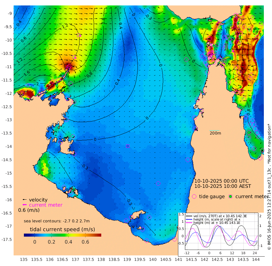 42cm/s 118T +3cm/s rms + 7cm/s -42T. ARA-GOC87 57m 4cm/s -48T +3cm/s rms + 2cm/s -2T. ARA-GOC87 60m 42cm/s 110T +2cm/s rms + 3cm/s 61T. ARA-GOC87 47m 44cm Daru 59cm Bobo Island 67cm Meer Island Barge 74cm Bramble Cay 56cm Unnamed Cay 75cm Pearce Cay 69cm Stephens Island 61cm Merrie England Shoals 40cm Mutacomal Reef 59cm Darnley Island Barge 77cm East Cay 46cm Yorke Island Barge 56cm Rennel Island 50cm Aureed Island 39cm Dungeness Reef 1cm Zagai Island 0cm Yam Island -24cm Dauan Island -42cm Saibai Island -5cm Phipi Reef -2cm Warrior Reef - West -21cm Mabuiag Island Barge 52cm Half Way Island 44cm Coconut Island 38cm Dugong Islet 22cm Poll Island 24cm Kirkcaldie Reef 0cm Suarji Island 0cm Sue Islet 40cm Hawkesbury Island 6cm Alert Patches 10cm Twin Island 40cm Badu Island -4cm St Pauls (Moa Island) 34cm Kubin (Moa Island) 7cm Ince Point 11cm Thursday Island 9cm Nardana Patches 30cm Turtle Head 33cm Round Island 51cm Goods Island 45cm Booby Island 51cm White Rocks Area 3cm Carpentaria 9cm Papou Point 51cm Bampfield Head 45cm Crab Island 41cm Red Wallis Island 41cm Packe Island 46cm Harrington Reef 28cm Herald Camp -19cm Sharp Point 30cm Red Island Point 19cm Possession Island -5cm Alpha Rock 24cm Frederick Point 43cm Wyborn Reef Light 35cm Tetley Island 54cm Triangle Reef 65cm Turtle Head Island 62cm Maclennan Cay 72cm Raine Island 56cm Mcsweeny Reef 55cm Collette Reef 57cm Shadwell Reef 64cm Hannibal Island 81cm Round Point 28cm Vrilya Point 63cm Cape Grenville 73cm Hicks Island 62cm Sir Charles Hardy Island 20cm Harvey Island 67cm Kay Reef 68cm Rocky Island 70cm Chapman Island 62cm Ham Reef 67cm Jubilee Reef 63cm Night Island 67cm Unnamed Reef No. 3 75cm Morris Island 71cm 1st 3 Mile Opening 69cm Creech Reef 77cm Fife Island 89cm Eden Reef 71cm Stanley Island 82cm Normanby River 209cm Yabooma Island 254cm Hutchison River 211cm Elcho Island 197cm North West Crocodile Island 133cm Cape Wessel 189cm Stevens Island 125cm Guluwuru Island 167cm Hopeful Bay 153cm Auster Point 152cm Two Island Bay 218cm Cadell Strait 60cm Mallison Island 117cm Melville Bay (Gove Harbour) 125cm Truant Island 74cm Cape Arnhem 33cm Cape Grey 15cm Hawk Island -29cm Milner Bay (Groote Eylandt) -37cm Cape Beatrice -98cm West Island -95cm Centre Island -68cm Mornington Island -77cm West Wellesley Islands -77cm Bountiful Island -60cm Albert River Mouth -74cm Sweers Island -59cm Karumba -39cm Nassau River Offshore -16cm Christmas Creek 14cm Archer River 11cm Boyd Point 23cm Weipa (Humbug Point) 23cm Pennefather River 15cm Cullen Point