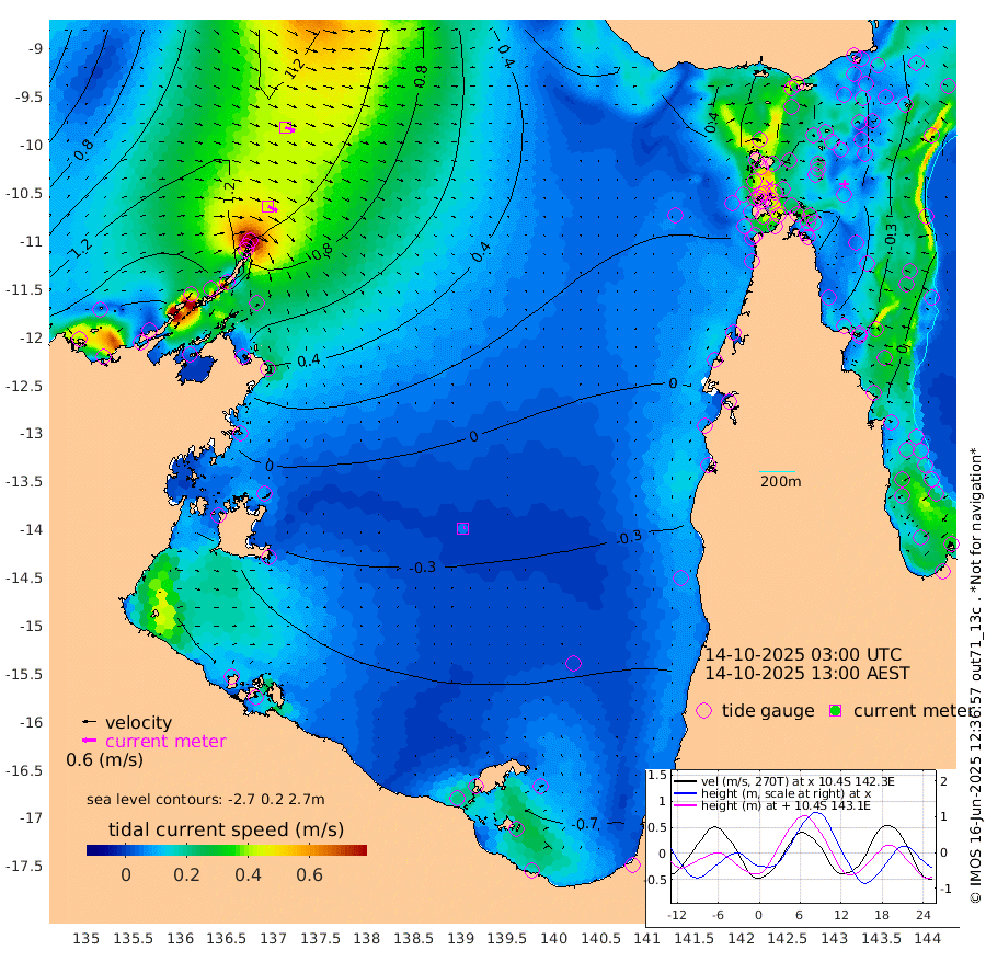 45cm/s 117T +3cm/s rms + 7cm/s -42T. ARA-GOC87 57m 6cm/s 67T +3cm/s rms + 2cm/s -2T. ARA-GOC87 60m 45cm/s 111T +2cm/s rms + 3cm/s 61T. ARA-GOC87 47m -42cm Daru -32cm Bobo Island -11cm Meer Island Barge -24cm Bramble Cay -42cm Unnamed Cay -29cm Pearce Cay -36cm Stephens Island -48cm Merrie England Shoals -50cm Mutacomal Reef -30cm Darnley Island Barge -15cm East Cay -34cm Yorke Island Barge -42cm Rennel Island -34cm Aureed Island -36cm Dungeness Reef -11cm Zagai Island -17cm Yam Island 22cm Dauan Island 22cm Saibai Island 2cm Phipi Reef -14cm Warrior Reef - West 24cm Mabuiag Island Barge -43cm Half Way Island -31cm Coconut Island -47cm Dugong Islet -29cm Poll Island -38cm Kirkcaldie Reef -25cm Suarji Island -28cm Sue Islet 74cm Hawkesbury Island -18cm Alert Patches -15cm Twin Island 73cm Badu Island -12cm St Pauls (Moa Island) 48cm Kubin (Moa Island) 4cm Ince Point 17cm Thursday Island 14cm Nardana Patches 33cm Turtle Head 53cm Round Island 66cm Goods Island 78cm Booby Island 68cm White Rocks Area 61cm Carpentaria 1cm Papou Point 89cm Bampfield Head 65cm Crab Island 68cm Red Wallis Island 47cm Packe Island -51cm Harrington Reef 64cm Herald Camp -15cm Sharp Point 34cm Red Island Point 10cm Possession Island -24cm Alpha Rock -28cm Frederick Point -36cm Wyborn Reef Light -32cm Tetley Island -5cm Triangle Reef -31cm Turtle Head Island -13cm Maclennan Cay 2cm Raine Island -38cm Mcsweeny Reef -34cm Collette Reef -15cm Shadwell Reef -38cm Hannibal Island -25cm Round Point 54cm Vrilya Point -30cm Cape Grenville -17cm Hicks Island -11cm Sir Charles Hardy Island -9cm Harvey Island -20cm Kay Reef -7cm Rocky Island 3cm Chapman Island 1cm Ham Reef -4cm Jubilee Reef -11cm Night Island -3cm Unnamed Reef No. 3 -9cm Morris Island -3cm 1st 3 Mile Opening -7cm Creech Reef -15cm Fife Island -2cm Eden Reef -15cm Stanley Island -16cm Normanby River 174cm Yabooma Island 202cm Hutchison River 172cm Elcho Island 160cm North West Crocodile Island 132cm Cape Wessel 160cm Stevens Island 121cm Guluwuru Island 144cm Hopeful Bay 138cm Auster Point 142cm Two Island Bay 184cm Cadell Strait 105cm Mallison Island 106cm Melville Bay (Gove Harbour) 119cm Truant Island 69cm Cape Arnhem 23cm Cape Grey -1cm Hawk Island -41cm Milner Bay (Groote Eylandt) -62cm Cape Beatrice -119cm West Island -115cm Centre Island -131cm Mornington Island -139cm West Wellesley Islands -138cm Bountiful Island -147cm Albert River Mouth -159cm Sweers Island -150cm Karumba -99cm Nassau River Offshore -57cm Christmas Creek -2cm Archer River 17cm Boyd Point 23cm Weipa (Humbug Point) 22cm Pennefather River 47cm Cullen Point