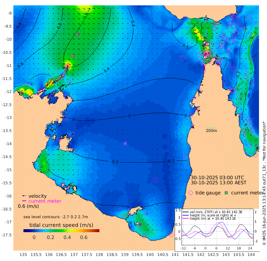 34cm/s 118T +3cm/s rms + 7cm/s -42T. ARA-GOC87 57m 7cm/s 54T +3cm/s rms + 2cm/s -2T. ARA-GOC87 60m 34cm/s 114T +2cm/s rms + 3cm/s 61T. ARA-GOC87 47m -32cm Daru -27cm Bobo Island -6cm Meer Island Barge -24cm Bramble Cay -32cm Unnamed Cay -23cm Pearce Cay -25cm Stephens Island -43cm Merrie England Shoals -43cm Mutacomal Reef -20cm Darnley Island Barge -14cm East Cay -22cm Yorke Island Barge -29cm Rennel Island -23cm Aureed Island -19cm Dungeness Reef 0cm Zagai Island -1cm Yam Island 26cm Dauan Island 19cm Saibai Island 4cm Phipi Reef -6cm Warrior Reef - West 25cm Mabuiag Island Barge -24cm Half Way Island -23cm Coconut Island -24cm Dugong Islet -14cm Poll Island -17cm Kirkcaldie Reef -6cm Suarji Island -16cm Sue Islet 63cm Hawkesbury Island -5cm Alert Patches -1cm Twin Island 64cm Badu Island 5cm St Pauls (Moa Island) 52cm Kubin (Moa Island) 16cm Ince Point 28cm Thursday Island 25cm Nardana Patches 40cm Turtle Head 49cm Round Island 67cm Goods Island 80cm Booby Island 72cm White Rocks Area 72cm Carpentaria 14cm Papou Point 85cm Bampfield Head 64cm Crab Island 69cm Red Wallis Island 47cm Packe Island -32cm Harrington Reef 65cm Herald Camp -9cm Sharp Point 31cm Red Island Point 17cm Possession Island -14cm Alpha Rock -16cm Frederick Point -32cm Wyborn Reef Light -29cm Tetley Island -8cm Triangle Reef -17cm Turtle Head Island -5cm Maclennan Cay 1cm Raine Island -29cm Mcsweeny Reef -31cm Collette Reef -15cm Shadwell Reef -34cm Hannibal Island -28cm Round Point 56cm Vrilya Point -27cm Cape Grenville -13cm Hicks Island -6cm Sir Charles Hardy Island -6cm Harvey Island -22cm Kay Reef -9cm Rocky Island -7cm Chapman Island -4cm Ham Reef -3cm Jubilee Reef -9cm Night Island -8cm Unnamed Reef No. 3 -9cm Morris Island 6cm 1st 3 Mile Opening -4cm Creech Reef -19cm Fife Island -3cm Eden Reef -12cm Stanley Island -14cm Normanby River 122cm Yabooma Island 140cm Hutchison River 117cm Elcho Island 108cm North West Crocodile Island 89cm Cape Wessel 99cm Stevens Island 86cm Guluwuru Island 83cm Hopeful Bay 93cm Auster Point 102cm Two Island Bay 124cm Cadell Strait 12cm Mallison Island 69cm Melville Bay (Gove Harbour) 80cm Truant Island 46cm Cape Arnhem 15cm Cape Grey -12cm Hawk Island -31cm Milner Bay (Groote Eylandt) -47cm Cape Beatrice -84cm West Island -81cm Centre Island -109cm Mornington Island -108cm West Wellesley Islands -115cm Bountiful Island -122cm Albert River Mouth -145cm Sweers Island -133cm Karumba -85cm Nassau River Offshore -48cm Christmas Creek -7cm Archer River 19cm Boyd Point 23cm Weipa (Humbug Point) 20cm Pennefather River 47cm Cullen Point