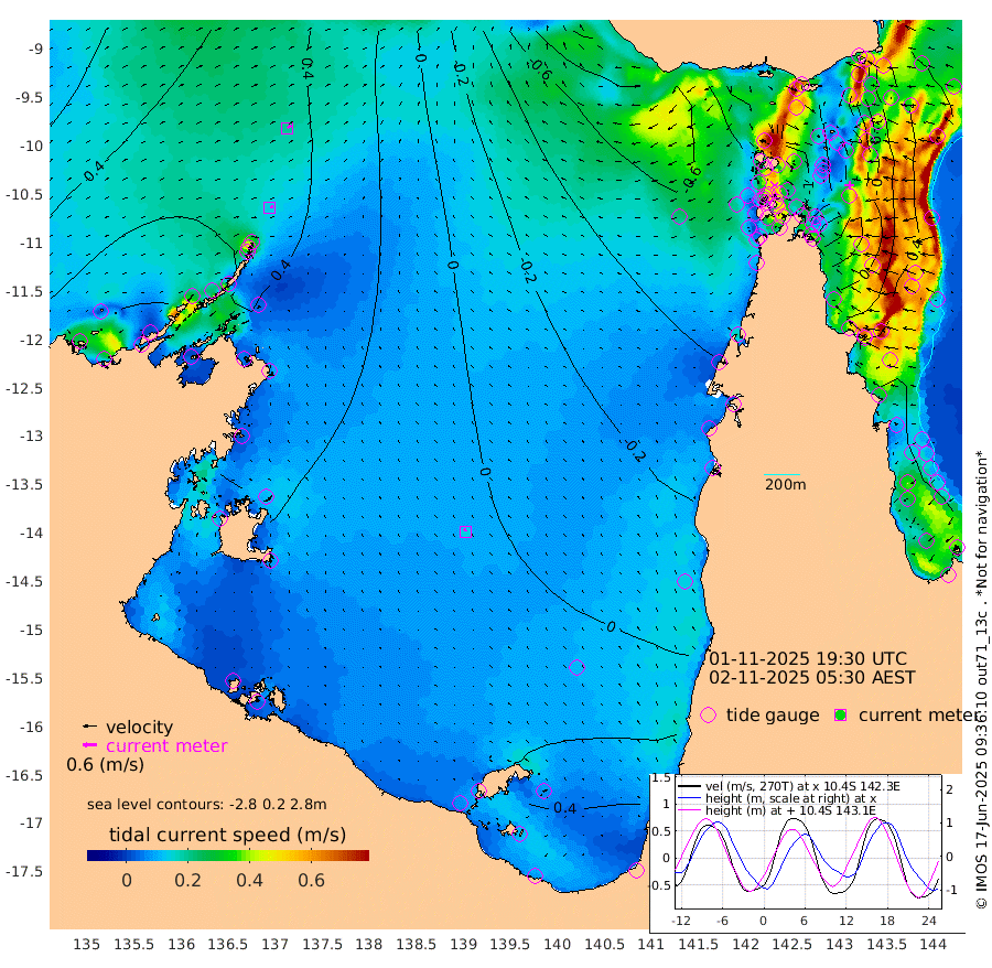 14cm/s 67T +3cm/s rms + 7cm/s -42T. ARA-GOC87 57m 14cm/s -37T +3cm/s rms + 2cm/s -2T. ARA-GOC87 60m 20cm/s 58T +2cm/s rms + 3cm/s 61T. ARA-GOC87 47m -25cm Daru -15cm Bobo Island 41cm Meer Island Barge 32cm Bramble Cay 5cm Unnamed Cay -1cm Pearce Cay 17cm Stephens Island 15cm Merrie England Shoals -27cm Mutacomal Reef 22cm Darnley Island Barge 41cm East Cay -4cm Yorke Island Barge -11cm Rennel Island -16cm Aureed Island -40cm Dungeness Reef -89cm Zagai Island -98cm Yam Island -122cm Dauan Island -125cm Saibai Island -101cm Phipi Reef -97cm Warrior Reef - West -122cm Mabuiag Island Barge -13cm Half Way Island -44cm Coconut Island -31cm Dugong Islet -71cm Poll Island -63cm Kirkcaldie Reef -103cm Suarji Island -70cm Sue Islet -112cm Hawkesbury Island -97cm Alert Patches -101cm Twin Island -117cm Badu Island -116cm St Pauls (Moa Island) -110cm Kubin (Moa Island) -109cm Ince Point -112cm Thursday Island -112cm Nardana Patches -103cm Turtle Head -97cm Round Island -99cm Goods Island -102cm Booby Island -104cm White Rocks Area -100cm Carpentaria -102cm Papou Point -94cm Bampfield Head -80cm Crab Island -110cm Red Wallis Island -109cm Packe Island -39cm Harrington Reef -105cm Herald Camp -38cm Sharp Point -96cm Red Island Point -88cm Possession Island -90cm Alpha Rock -76cm Frederick Point -36cm Wyborn Reef Light -50cm Tetley Island 12cm Triangle Reef -20cm Turtle Head Island 26cm Maclennan Cay 45cm Raine Island 5cm Mcsweeny Reef 16cm Collette Reef 34cm Shadwell Reef 24cm Hannibal Island 33cm Round Point -73cm Vrilya Point 32cm Cape Grenville 36cm Hicks Island 25cm Sir Charles Hardy Island 11cm Harvey Island 44cm Kay Reef 44cm Rocky Island 43cm Chapman Island 42cm Ham Reef 44cm Jubilee Reef 39cm Night Island 41cm Unnamed Reef No. 3 49cm Morris Island 48cm 1st 3 Mile Opening 46cm Creech Reef 53cm Fife Island 66cm Eden Reef 55cm Stanley Island 59cm Normanby River 67cm Yabooma Island 79cm Hutchison River 72cm Elcho Island 62cm North West Crocodile Island 39cm Cape Wessel 68cm Stevens Island 54cm Guluwuru Island 72cm Hopeful Bay 57cm Auster Point 56cm Two Island Bay 80cm Cadell Strait 93cm Mallison Island 53cm Melville Bay (Gove Harbour) 51cm Truant Island 37cm Cape Arnhem 38cm Cape Grey 39cm Hawk Island 34cm Milner Bay (Groote Eylandt) 32cm Cape Beatrice 18cm West Island 20cm Centre Island 48cm Mornington Island 47cm West Wellesley Islands 54cm Bountiful Island 86cm Albert River Mouth 112cm Sweers Island 82cm Karumba 21cm Nassau River Offshore -4cm Christmas Creek -17cm Archer River -38cm Boyd Point -35cm Weipa (Humbug Point) -31cm Pennefather River -71cm Cullen Point
