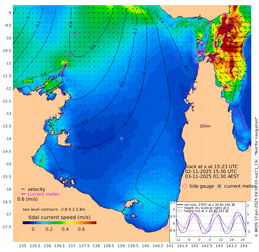 22cm/s -93T +3cm/s rms + 7cm/s -42T. ARA-GOC87 57m 7cm/s -132T +3cm/s rms + 2cm/s -2T. ARA-GOC87 60m 23cm/s -100T +2cm/s rms + 3cm/s 61T. ARA-GOC87 47m -112cm Daru -119cm Bobo Island -108cm Meer Island Barge -128cm Bramble Cay -134cm Unnamed Cay -120cm Pearce Cay -132cm Stephens Island -140cm Merrie England Shoals -119cm Mutacomal Reef -124cm Darnley Island Barge -120cm East Cay -115cm Yorke Island Barge -118cm Rennel Island -106cm Aureed Island -88cm Dungeness Reef -38cm Zagai Island -41cm Yam Island 37cm Dauan Island 26cm Saibai Island 14cm Phipi Reef -27cm Warrior Reef - West 21cm Mabuiag Island Barge -114cm Half Way Island -96cm Coconut Island -106cm Dugong Islet -64cm Poll Island -78cm Kirkcaldie Reef -35cm Suarji Island -64cm Sue Islet 22cm Hawkesbury Island -31cm Alert Patches -36cm Twin Island 31cm Badu Island -19cm St Pauls (Moa Island) 13cm Kubin (Moa Island) -6cm Ince Point 4cm Thursday Island 3cm Nardana Patches 13cm Turtle Head 6cm Round Island 26cm Goods Island 42cm Booby Island 30cm White Rocks Area 39cm Carpentaria -27cm Papou Point 3cm Bampfield Head 42cm Crab Island 46cm Red Wallis Island 24cm Packe Island -115cm Harrington Reef 19cm Herald Camp 3cm Sharp Point 4cm Red Island Point -23cm Possession Island -44cm Alpha Rock -69cm Frederick Point -115cm Wyborn Reef Light -102cm Tetley Island -83cm Triangle Reef -129cm Turtle Head Island -101cm Maclennan Cay -90cm Raine Island -121cm Mcsweeny Reef -119cm Collette Reef -100cm Shadwell Reef -135cm Hannibal Island -132cm Round Point 46cm Vrilya Point -122cm Cape Grenville -119cm Hicks Island -117cm Sir Charles Hardy Island -38cm Harvey Island -122cm Kay Reef -104cm Rocky Island -95cm Chapman Island -94cm Ham Reef -100cm Jubilee Reef -88cm Night Island -93cm Unnamed Reef No. 3 -109cm Morris Island -98cm 1st 3 Mile Opening -101cm Creech Reef -104cm Fife Island -119cm Eden Reef -113cm Stanley Island -128cm Normanby River -82cm Yabooma Island -98cm Hutchison River -71cm Elcho Island -63cm North West Crocodile Island -81cm Cape Wessel -86cm Stevens Island -101cm Guluwuru Island -77cm Hopeful Bay -82cm Auster Point -79cm Two Island Bay -98cm Cadell Strait -149cm Mallison Island -84cm Melville Bay (Gove Harbour) -91cm Truant Island -57cm Cape Arnhem -47cm Cape Grey -23cm Hawk Island -2cm Milner Bay (Groote Eylandt) 10cm Cape Beatrice 33cm West Island 37cm Centre Island 37cm Mornington Island 35cm West Wellesley Islands 26cm Bountiful Island 64cm Albert River Mouth 51cm Sweers Island 60cm Karumba 38cm Nassau River Offshore 27cm Christmas Creek 24cm Archer River 24cm Boyd Point 28cm Weipa (Humbug Point) 32cm Pennefather River 44cm Cullen Point