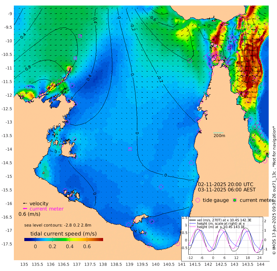15cm/s 91T +3cm/s rms + 7cm/s -42T. ARA-GOC87 57m 12cm/s -44T +3cm/s rms + 2cm/s -2T. ARA-GOC87 60m 19cm/s 77T +2cm/s rms + 3cm/s 61T. ARA-GOC87 47m -21cm Daru -9cm Bobo Island 53cm Meer Island Barge 42cm Bramble Cay 12cm Unnamed Cay 10cm Pearce Cay 27cm Stephens Island 22cm Merrie England Shoals -23cm Mutacomal Reef 29cm Darnley Island Barge 55cm East Cay 1cm Yorke Island Barge -2cm Rennel Island -10cm Aureed Island -34cm Dungeness Reef -91cm Zagai Island -97cm Yam Island -124cm Dauan Island -132cm Saibai Island -102cm Phipi Reef -98cm Warrior Reef - West -119cm Mabuiag Island Barge -4cm Half Way Island -38cm Coconut Island -25cm Dugong Islet -67cm Poll Island -58cm Kirkcaldie Reef -100cm Suarji Island -72cm Sue Islet -84cm Hawkesbury Island -91cm Alert Patches -95cm Twin Island -93cm Badu Island -112cm St Pauls (Moa Island) -87cm Kubin (Moa Island) -99cm Ince Point -97cm Thursday Island -99cm Nardana Patches -81cm Turtle Head -75cm Round Island -67cm Goods Island -66cm Booby Island -69cm White Rocks Area -72cm Carpentaria -95cm Papou Point -59cm Bampfield Head -49cm Crab Island -75cm Red Wallis Island -80cm Packe Island -31cm Harrington Reef -76cm Herald Camp -42cm Sharp Point -78cm Red Island Point -76cm Possession Island -88cm Alpha Rock -69cm Frederick Point -31cm Wyborn Reef Light -46cm Tetley Island 23cm Triangle Reef -11cm Turtle Head Island 39cm Maclennan Cay 60cm Raine Island 13cm Mcsweeny Reef 23cm Collette Reef 44cm Shadwell Reef 32cm Hannibal Island 46cm Round Point -45cm Vrilya Point 43cm Cape Grenville 49cm Hicks Island 37cm Sir Charles Hardy Island 14cm Harvey Island 56cm Kay Reef 57cm Rocky Island 58cm Chapman Island 55cm Ham Reef 57cm Jubilee Reef 53cm Night Island 56cm Unnamed Reef No. 3 64cm Morris Island 63cm 1st 3 Mile Opening 61cm Creech Reef 68cm Fife Island 83cm Eden Reef 69cm Stanley Island 74cm Normanby River 96cm Yabooma Island 113cm Hutchison River 100cm Elcho Island 88cm North West Crocodile Island 53cm Cape Wessel 88cm Stevens Island 62cm Guluwuru Island 90cm Hopeful Bay 74cm Auster Point 73cm Two Island Bay 103cm Cadell Strait 75cm Mallison Island 60cm Melville Bay (Gove Harbour) 60cm Truant Island 40cm Cape Arnhem 33cm Cape Grey 31cm Hawk Island 19cm Milner Bay (Groote Eylandt) 18cm Cape Beatrice -6cm West Island -3cm Centre Island 26cm Mornington Island 24cm West Wellesley Islands 27cm Bountiful Island 58cm Albert River Mouth 74cm Sweers Island 55cm Karumba 12cm Nassau River Offshore -2cm Christmas Creek -3cm Archer River -22cm Boyd Point -15cm Weipa (Humbug Point) -12cm Pennefather River -47cm Cullen Point