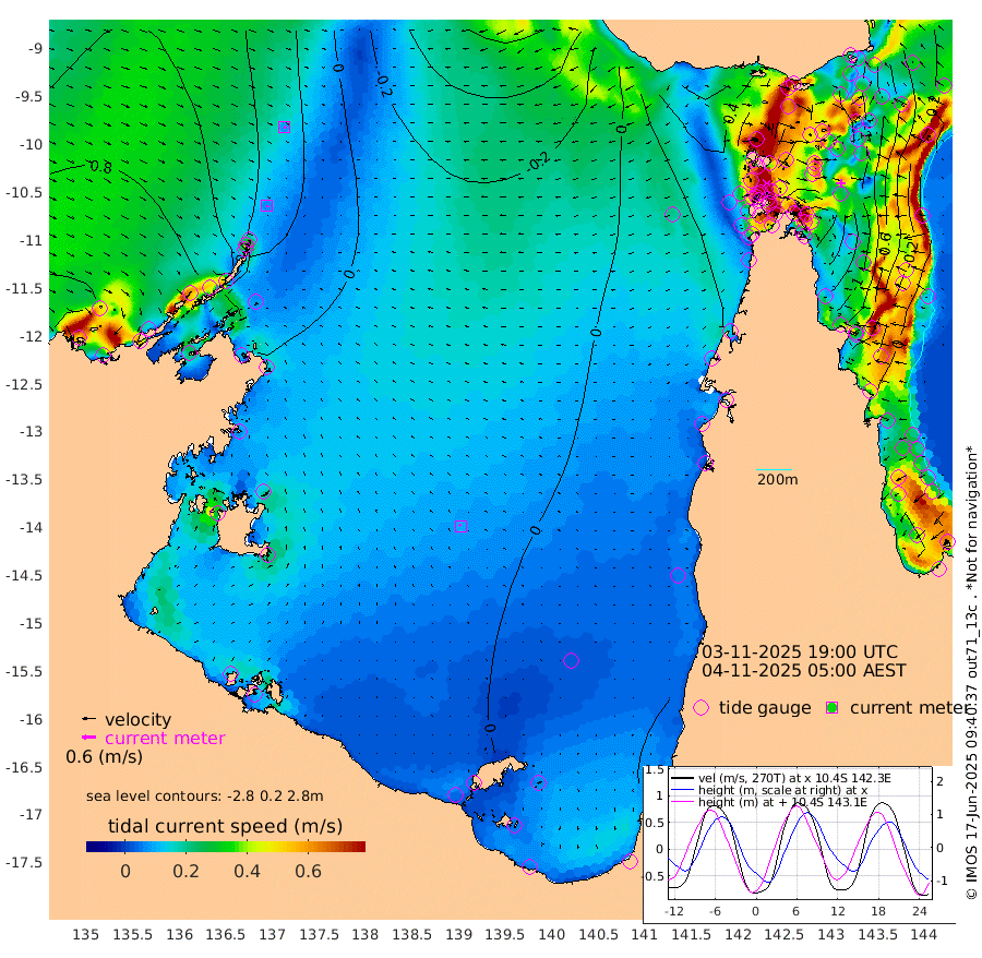 7cm/s 155T +3cm/s rms + 7cm/s -42T. ARA-GOC87 57m 10cm/s -52T +3cm/s rms + 2cm/s -2T. ARA-GOC87 60m 9cm/s 131T +2cm/s rms + 3cm/s 61T. ARA-GOC87 47m -125cm Daru -115cm Bobo Island -20cm Meer Island Barge -53cm Bramble Cay -99cm Unnamed Cay -91cm Pearce Cay -77cm Stephens Island -92cm Merrie England Shoals -130cm Mutacomal Reef -69cm Darnley Island Barge -26cm East Cay -98cm Yorke Island Barge -103cm Rennel Island -104cm Aureed Island -120cm Dungeness Reef -146cm Zagai Island -150cm Yam Island -120cm Dauan Island -132cm Saibai Island -125cm Phipi Reef -148cm Warrior Reef - West -108cm Mabuiag Island Barge -102cm Half Way Island -128cm Coconut Island -119cm Dugong Islet -136cm Poll Island -135cm Kirkcaldie Reef -149cm Suarji Island -140cm Sue Islet -30cm Hawkesbury Island -129cm Alert Patches -136cm Twin Island -44cm Badu Island -145cm St Pauls (Moa Island) -59cm Kubin (Moa Island) -108cm Ince Point -90cm Thursday Island -95cm Nardana Patches -57cm Turtle Head -49cm Round Island -11cm Goods Island 14cm Booby Island 1cm White Rocks Area 6cm Carpentaria -125cm Papou Point -6cm Bampfield Head 21cm Crab Island 4cm Red Wallis Island -38cm Packe Island -135cm Harrington Reef -25cm Herald Camp -52cm Sharp Point -56cm Red Island Point -96cm Possession Island -137cm Alpha Rock -137cm Frederick Point -135cm Wyborn Reef Light -141cm Tetley Island -36cm Triangle Reef -120cm Turtle Head Island -28cm Maclennan Cay 9cm Raine Island -86cm Mcsweeny Reef -72cm Collette Reef -27cm Shadwell Reef -76cm Hannibal Island -51cm Round Point 28cm Vrilya Point -45cm Cape Grenville -33cm Hicks Island -38cm Sir Charles Hardy Island -13cm Harvey Island -24cm Kay Reef -7cm Rocky Island 4cm Chapman Island 3cm Ham Reef -3cm Jubilee Reef -5cm Night Island 3cm Unnamed Reef No. 3 -3cm Morris Island 6cm 1st 3 Mile Opening 0cm Creech Reef 3cm Fife Island 12cm Eden Reef 0cm Stanley Island -5cm Normanby River 84cm Yabooma Island 86cm Hutchison River 87cm Elcho Island 80cm North West Crocodile Island 25cm Cape Wessel 59cm Stevens Island 2cm Guluwuru Island 65cm Hopeful Bay 44cm Auster Point 45cm Two Island Bay 62cm Cadell Strait -43cm Mallison Island 10cm Melville Bay (Gove Harbour) 9cm Truant Island 2cm Cape Arnhem -5cm Cape Grey -2cm Hawk Island -2cm Milner Bay (Groote Eylandt) 1cm Cape Beatrice -14cm West Island -11cm Centre Island 1cm Mornington Island 2cm West Wellesley Islands -4cm Bountiful Island 36cm Albert River Mouth 36cm Sweers Island 30cm Karumba 5cm Nassau River Offshore 4cm Christmas Creek 24cm Archer River 14cm Boyd Point 27cm Weipa (Humbug Point) 29cm Pennefather River 19cm Cullen Point