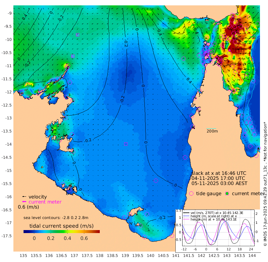 15cm/s -92T +3cm/s rms + 7cm/s -42T. ARA-GOC87 57m 6cm/s 8T +3cm/s rms + 2cm/s -2T. ARA-GOC87 60m 15cm/s -109T +2cm/s rms + 3cm/s 61T. ARA-GOC87 47m -155cm Daru -160cm Bobo Island -122cm Meer Island Barge -150cm Bramble Cay -165cm Unnamed Cay -159cm Pearce Cay -161cm Stephens Island -165cm Merrie England Shoals -157cm Mutacomal Reef -150cm Darnley Island Barge -136cm East Cay -148cm Yorke Island Barge -154cm Rennel Island -147cm Aureed Island -137cm Dungeness Reef -91cm Zagai Island -93cm Yam Island -25cm Dauan Island -23cm Saibai Island -61cm Phipi Reef -90cm Warrior Reef - West -13cm Mabuiag Island Barge -148cm Half Way Island -139cm Coconut Island -145cm Dugong Islet -111cm Poll Island -122cm Kirkcaldie Reef -93cm Suarji Island -103cm Sue Islet 8cm Hawkesbury Island -75cm Alert Patches -80cm Twin Island 7cm Badu Island -68cm St Pauls (Moa Island) -18cm Kubin (Moa Island) -44cm Ince Point -28cm Thursday Island -32cm Nardana Patches -18cm Turtle Head -20cm Round Island 9cm Goods Island 39cm Booby Island 24cm White Rocks Area 59cm Carpentaria -65cm Papou Point -1cm Bampfield Head 44cm Crab Island 41cm Red Wallis Island -4cm Packe Island -156cm Harrington Reef -2cm Herald Camp -12cm Sharp Point -16cm Red Island Point -60cm Possession Island -79cm Alpha Rock -112cm Frederick Point -152cm Wyborn Reef Light -141cm Tetley Island -103cm Triangle Reef -162cm Turtle Head Island -118cm Maclennan Cay -97cm Raine Island -150cm Mcsweeny Reef -144cm Collette Reef -114cm Shadwell Reef -161cm Hannibal Island -154cm Round Point 60cm Vrilya Point -140cm Cape Grenville -137cm Hicks Island -136cm Sir Charles Hardy Island -44cm Harvey Island -132cm Kay Reef -115cm Rocky Island -103cm Chapman Island -98cm Ham Reef -107cm Jubilee Reef -101cm Night Island -99cm Unnamed Reef No. 3 -119cm Morris Island -107cm 1st 3 Mile Opening -110cm Creech Reef -113cm Fife Island -129cm Eden Reef -119cm Stanley Island -136cm Normanby River -76cm Yabooma Island -105cm Hutchison River -71cm Elcho Island -63cm North West Crocodile Island -67cm Cape Wessel -77cm Stevens Island -100cm Guluwuru Island -69cm Hopeful Bay -72cm Auster Point -69cm Two Island Bay -98cm Cadell Strait -116cm Mallison Island -86cm Melville Bay (Gove Harbour) -89cm Truant Island -60cm Cape Arnhem -47cm Cape Grey -33cm Hawk Island -2cm Milner Bay (Groote Eylandt) 4cm Cape Beatrice 30cm West Island 32cm Centre Island -4cm Mornington Island 1cm West Wellesley Islands -28cm Bountiful Island 6cm Albert River Mouth -2cm Sweers Island -2cm Karumba -8cm Nassau River Offshore -12cm Christmas Creek 8cm Archer River 15cm Boyd Point 13cm Weipa (Humbug Point) 38cm Pennefather River 46cm Cullen Point