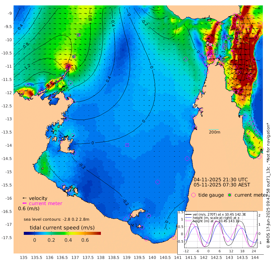 28cm/s 114T +3cm/s rms + 7cm/s -42T. ARA-GOC87 57m 6cm/s -54T +3cm/s rms + 2cm/s -2T. ARA-GOC87 60m 29cm/s 104T +2cm/s rms + 3cm/s 61T. ARA-GOC87 47m 20cm Daru 35cm Bobo Island 81cm Meer Island Barge 79cm Bramble Cay 50cm Unnamed Cay 57cm Pearce Cay 68cm Stephens Island 62cm Merrie England Shoals 19cm Mutacomal Reef 62cm Darnley Island Barge 89cm East Cay 35cm Yorke Island Barge 41cm Rennel Island 31cm Aureed Island 8cm Dungeness Reef -56cm Zagai Island -58cm Yam Island -98cm Dauan Island -111cm Saibai Island -75cm Phipi Reef -63cm Warrior Reef - West -86cm Mabuiag Island Barge 38cm Half Way Island 10cm Coconut Island 17cm Dugong Islet -24cm Poll Island -14cm Kirkcaldie Reef -59cm Suarji Island -39cm Sue Islet -20cm Hawkesbury Island -46cm Alert Patches -47cm Twin Island -30cm Badu Island -68cm St Pauls (Moa Island) -27cm Kubin (Moa Island) -51cm Ince Point -47cm Thursday Island -50cm Nardana Patches -25cm Turtle Head -20cm Round Island -2cm Goods Island 0cm Booby Island 0cm White Rocks Area -21cm Carpentaria -50cm Papou Point 8cm Bampfield Head 6cm Crab Island -8cm Red Wallis Island -15cm Packe Island 18cm Harrington Reef -20cm Herald Camp -37cm Sharp Point -25cm Red Island Point -31cm Possession Island -50cm Alpha Rock -21cm Frederick Point 14cm Wyborn Reef Light 0cm Tetley Island 53cm Triangle Reef 40cm Turtle Head Island 70cm Maclennan Cay 89cm Raine Island 51cm Mcsweeny Reef 56cm Collette Reef 69cm Shadwell Reef 68cm Hannibal Island 86cm Round Point 3cm Vrilya Point 76cm Cape Grenville 83cm Hicks Island 71cm Sir Charles Hardy Island 24cm Harvey Island 87cm Kay Reef 85cm Rocky Island 86cm Chapman Island 81cm Ham Reef 84cm Jubilee Reef 79cm Night Island 85cm Unnamed Reef No. 3 94cm Morris Island 91cm 1st 3 Mile Opening 89cm Creech Reef 97cm Fife Island 115cm Eden Reef 96cm Stanley Island 106cm Normanby River 155cm Yabooma Island 189cm Hutchison River 160cm Elcho Island 145cm North West Crocodile Island 96cm Cape Wessel 141cm Stevens Island 98cm Guluwuru Island 131cm Hopeful Bay 116cm Auster Point 115cm Two Island Bay 162cm Cadell Strait 71cm Mallison Island 90cm Melville Bay (Gove Harbour) 95cm Truant Island 58cm Cape Arnhem 31cm Cape Grey 18cm Hawk Island -13cm Milner Bay (Groote Eylandt) -16cm Cape Beatrice -62cm West Island -59cm Centre Island -33cm Mornington Island -38cm West Wellesley Islands -44cm Bountiful Island -22cm Albert River Mouth -25cm Sweers Island -24cm Karumba -21cm Nassau River Offshore -10cm Christmas Creek 11cm Archer River 2cm Boyd Point 12cm Weipa (Humbug Point) 15cm Pennefather River -8cm Cullen Point