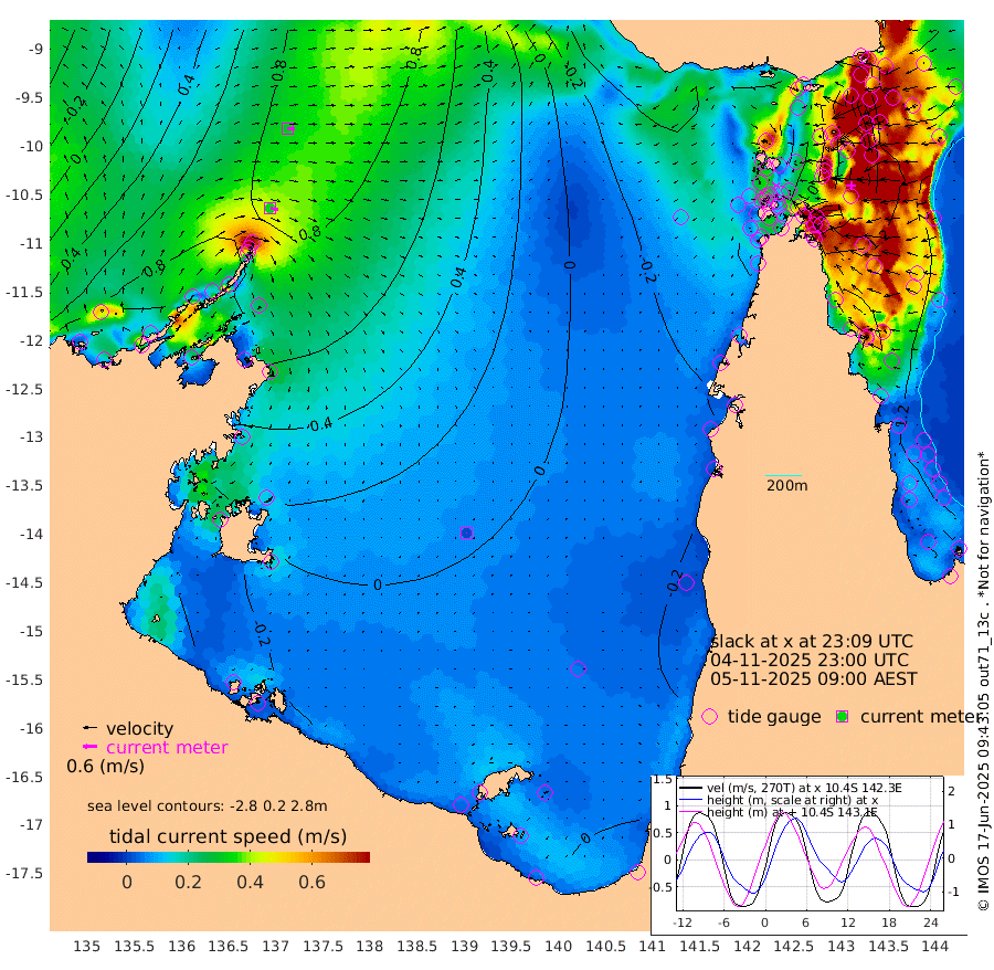 33cm/s 104T +3cm/s rms + 7cm/s -42T. ARA-GOC87 57m 1cm/s -135T +3cm/s rms + 2cm/s -2T. ARA-GOC87 60m 32cm/s 93T +2cm/s rms + 3cm/s 61T. ARA-GOC87 47m 129cm Daru 139cm Bobo Island 117cm Meer Island Barge 139cm Bramble Cay 142cm Unnamed Cay 145cm Pearce Cay 147cm Stephens Island 150cm Merrie England Shoals 128cm Mutacomal Reef 135cm Darnley Island Barge 128cm East Cay 126cm Yorke Island Barge 134cm Rennel Island 126cm Aureed Island 110cm Dungeness Reef 55cm Zagai Island 49cm Yam Island -18cm Dauan Island -29cm Saibai Island 18cm Phipi Reef 47cm Warrior Reef - West -24cm Mabuiag Island Barge 130cm Half Way Island 118cm Coconut Island 118cm Dugong Islet 82cm Poll Island 91cm Kirkcaldie Reef 51cm Suarji Island 66cm Sue Islet -22cm Hawkesbury Island 47cm Alert Patches 50cm Twin Island -16cm Badu Island 33cm St Pauls (Moa Island) 2cm Kubin (Moa Island) 20cm Ince Point 7cm Thursday Island 9cm Nardana Patches 6cm Turtle Head 2cm Round Island -9cm Goods Island -31cm Booby Island -21cm White Rocks Area -46cm Carpentaria 36cm Papou Point -2cm Bampfield Head -23cm Crab Island -33cm Red Wallis Island -2cm Packe Island 132cm Harrington Reef -23cm Herald Camp -2cm Sharp Point 1cm Red Island Point 36cm Possession Island 46cm Alpha Rock 83cm Frederick Point 126cm Wyborn Reef Light 113cm Tetley Island 95cm Triangle Reef 147cm Turtle Head Island 107cm Maclennan Cay 100cm Raine Island 133cm Mcsweeny Reef 129cm Collette Reef 108cm Shadwell Reef 147cm Hannibal Island 145cm Round Point -31cm Vrilya Point 128cm Cape Grenville 127cm Hicks Island 114cm Sir Charles Hardy Island 40cm Harvey Island 122cm Kay Reef 107cm Rocky Island 99cm Chapman Island 93cm Ham Reef 104cm Jubilee Reef 101cm Night Island 98cm Unnamed Reef No. 3 117cm Morris Island 108cm 1st 3 Mile Opening 108cm Creech Reef 116cm Fife Island 130cm Eden Reef 117cm Stanley Island 130cm Normanby River 93cm Yabooma Island 137cm Hutchison River 103cm Elcho Island 87cm North West Crocodile Island 83cm Cape Wessel 106cm Stevens Island 117cm Guluwuru Island 91cm Hopeful Bay 93cm Auster Point 88cm Two Island Bay 133cm Cadell Strait 142cm Mallison Island 100cm Melville Bay (Gove Harbour) 107cm Truant Island 72cm Cape Arnhem 45cm Cape Grey 31cm Hawk Island -8cm Milner Bay (Groote Eylandt) -13cm Cape Beatrice -56cm West Island -53cm Centre Island -22cm Mornington Island -30cm West Wellesley Islands -40cm Bountiful Island -35cm Albert River Mouth -35cm Sweers Island -34cm Karumba -20cm Nassau River Offshore -9cm Christmas Creek -6cm Archer River -13cm Boyd Point -14cm Weipa (Humbug Point) -6cm Pennefather River -36cm Cullen Point