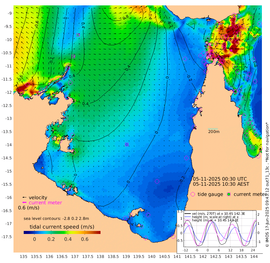 25cm/s 96T +3cm/s rms + 7cm/s -42T. ARA-GOC87 57m 6cm/s 133T +3cm/s rms + 2cm/s -2T. ARA-GOC87 60m 21cm/s 81T +2cm/s rms + 3cm/s 61T. ARA-GOC87 47m 171cm Daru 171cm Bobo Island 95cm Meer Island Barge 128cm Bramble Cay 160cm Unnamed Cay 159cm Pearce Cay 151cm Stephens Island 161cm Merrie England Shoals 170cm Mutacomal Reef 140cm Darnley Island Barge 102cm East Cay 152cm Yorke Island Barge 158cm Rennel Island 157cm Aureed Island 156cm Dungeness Reef 138cm Zagai Island 129cm Yam Island 72cm Dauan Island 67cm Saibai Island 105cm Phipi Reef 133cm Warrior Reef - West 52cm Mabuiag Island Barge 155cm Half Way Island 168cm Coconut Island 157cm Dugong Islet 146cm Poll Island 150cm Kirkcaldie Reef 137cm Suarji Island 138cm Sue Islet -6cm Hawkesbury Island 120cm Alert Patches 124cm Twin Island 14cm Badu Island 120cm St Pauls (Moa Island) 35cm Kubin (Moa Island) 84cm Ince Point 63cm Thursday Island 69cm Nardana Patches 42cm Turtle Head 33cm Round Island -2cm Goods Island -32cm Booby Island -21cm White Rocks Area -33cm Carpentaria 105cm Papou Point 7cm Bampfield Head -26cm Crab Island -29cm Red Wallis Island 20cm Packe Island 178cm Harrington Reef -4cm Herald Camp 34cm Sharp Point 31cm Red Island Point 91cm Possession Island 119cm Alpha Rock 146cm Frederick Point 173cm Wyborn Reef Light 168cm Tetley Island 89cm Triangle Reef 180cm Turtle Head Island 90cm Maclennan Cay 65cm Raine Island 148cm Mcsweeny Reef 137cm Collette Reef 95cm Shadwell Reef 151cm Hannibal Island 130cm Round Point -34cm Vrilya Point 115cm Cape Grenville 108cm Hicks Island 99cm Sir Charles Hardy Island 36cm Harvey Island 97cm Kay Reef 77cm Rocky Island 64cm Chapman Island 61cm Ham Reef 73cm Jubilee Reef 75cm Night Island 64cm Unnamed Reef No. 3 81cm Morris Island 74cm 1st 3 Mile Opening 76cm Creech Reef 78cm Fife Island 82cm Eden Reef 81cm Stanley Island 87cm Normanby River -30cm Yabooma Island 2cm Hutchison River -19cm Elcho Island -30cm North West Crocodile Island 19cm Cape Wessel 6cm Stevens Island 73cm Guluwuru Island -6cm Hopeful Bay 16cm Auster Point 7cm Two Island Bay 24cm Cadell Strait 141cm Mallison Island 55cm Melville Bay (Gove Harbour) 61cm Truant Island 48cm Cape Arnhem 33cm Cape Grey 26cm Hawk Island -2cm Milner Bay (Groote Eylandt) -8cm Cape Beatrice -28cm West Island -22cm Centre Island -5cm Mornington Island -13cm West Wellesley Islands -29cm Bountiful Island -43cm Albert River Mouth -39cm Sweers Island -39cm Karumba -14cm Nassau River Offshore -4cm Christmas Creek -14cm Archer River -12cm Boyd Point -24cm Weipa (Humbug Point) -11cm Pennefather River -34cm Cullen Point