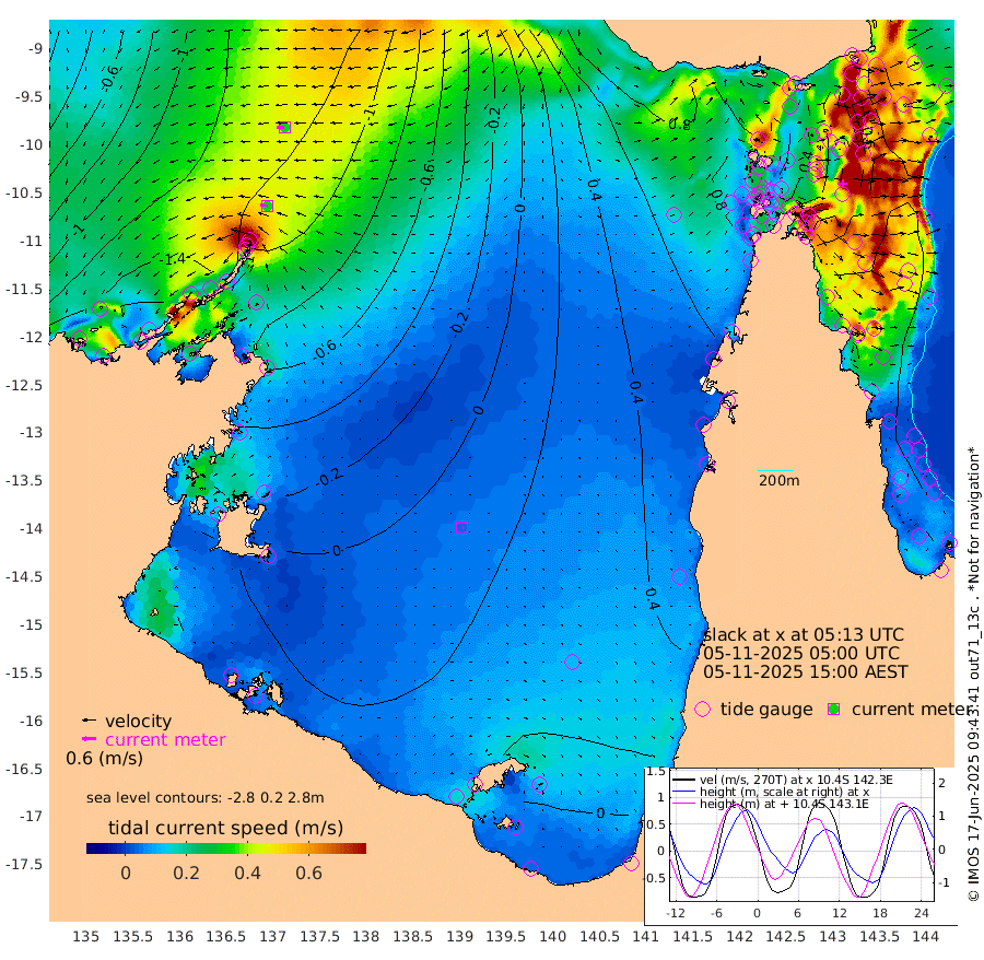 33cm/s -81T +3cm/s rms + 7cm/s -42T. ARA-GOC87 57m 4cm/s 108T +3cm/s rms + 2cm/s -2T. ARA-GOC87 60m 34cm/s -93T +2cm/s rms + 3cm/s 61T. ARA-GOC87 47m -71cm Daru -84cm Bobo Island -74cm Meer Island Barge -93cm Bramble Cay -85cm Unnamed Cay -94cm Pearce Cay -93cm Stephens Island -95cm Merrie England Shoals -73cm Mutacomal Reef -82cm Darnley Island Barge -82cm East Cay -72cm Yorke Island Barge -77cm Rennel Island -69cm Aureed Island -50cm Dungeness Reef 2cm Zagai Island 2cm Yam Island 68cm Dauan Island 74cm Saibai Island 50cm Phipi Reef 7cm Warrior Reef - West 70cm Mabuiag Island Barge -80cm Half Way Island -53cm Coconut Island -65cm Dugong Islet -27cm Poll Island -34cm Kirkcaldie Reef 24cm Suarji Island -12cm Sue Islet 68cm Hawkesbury Island 22cm Alert Patches 11cm Twin Island 71cm Badu Island 26cm St Pauls (Moa Island) 50cm Kubin (Moa Island) 38cm Ince Point 50cm Thursday Island 48cm Nardana Patches 56cm Turtle Head 70cm Round Island 67cm Goods Island 89cm Booby Island 76cm White Rocks Area 100cm Carpentaria 15cm Papou Point 105cm Bampfield Head 71cm Crab Island 81cm Red Wallis Island 57cm Packe Island -70cm Harrington Reef 97cm Herald Camp 16cm Sharp Point 44cm Red Island Point 39cm Possession Island 6cm Alpha Rock -23cm Frederick Point -66cm Wyborn Reef Light -54cm Tetley Island -53cm Triangle Reef -84cm Turtle Head Island -63cm Maclennan Cay -59cm Raine Island -79cm Mcsweeny Reef -74cm Collette Reef -61cm Shadwell Reef -90cm Hannibal Island -96cm Round Point 70cm Vrilya Point -79cm Cape Grenville -79cm Hicks Island -64cm Sir Charles Hardy Island -25cm Harvey Island -77cm Kay Reef -64cm Rocky Island -56cm Chapman Island -55cm Ham Reef -64cm Jubilee Reef -61cm Night Island -58cm Unnamed Reef No. 3 -73cm Morris Island -58cm 1st 3 Mile Opening -64cm Creech Reef -78cm Fife Island -87cm Eden Reef -73cm Stanley Island -91cm Normanby River -159cm Yabooma Island -203cm Hutchison River -170cm Elcho Island -163cm North West Crocodile Island -121cm Cape Wessel -165cm Stevens Island -136cm Guluwuru Island -139cm Hopeful Bay -129cm Auster Point -142cm Two Island Bay -205cm Cadell Strait -142cm Mallison Island -118cm Melville Bay (Gove Harbour) -122cm Truant Island -76cm Cape Arnhem -48cm Cape Grey -35cm Hawk Island -2cm Milner Bay (Groote Eylandt) -3cm Cape Beatrice 40cm West Island 48cm Centre Island 22cm Mornington Island 28cm West Wellesley Islands 34cm Bountiful Island -1cm Albert River Mouth 7cm Sweers Island 7cm Karumba 23cm Nassau River Offshore 35cm Christmas Creek 41cm Archer River 53cm Boyd Point 56cm Weipa (Humbug Point) 40cm Pennefather River 78cm Cullen Point