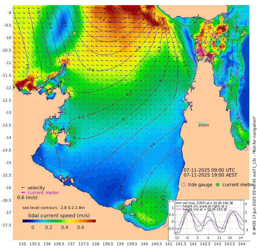 43cm/s -87T +3cm/s rms + 7cm/s -42T. ARA-GOC87 57m 13cm/s -111T +3cm/s rms + 2cm/s -2T. ARA-GOC87 60m 39cm/s -96T +2cm/s rms + 3cm/s 61T. ARA-GOC87 47m -70cm Daru -75cm Bobo Island -23cm Meer Island Barge -36cm Bramble Cay -56cm Unnamed Cay -63cm Pearce Cay -53cm Stephens Island -55cm Merrie England Shoals -66cm Mutacomal Reef -54cm Darnley Island Barge -18cm East Cay -66cm Yorke Island Barge -57cm Rennel Island -65cm Aureed Island -58cm Dungeness Reef -69cm Zagai Island -55cm Yam Island -22cm Dauan Island -31cm Saibai Island -13cm Phipi Reef -55cm Warrior Reef - West -13cm Mabuiag Island Barge -65cm Half Way Island -70cm Coconut Island -66cm Dugong Islet -63cm Poll Island -61cm Kirkcaldie Reef -42cm Suarji Island -68cm Sue Islet 50cm Hawkesbury Island -38cm Alert Patches -49cm Twin Island 37cm Badu Island -50cm St Pauls (Moa Island) 21cm Kubin (Moa Island) -20cm Ince Point -5cm Thursday Island -8cm Nardana Patches 25cm Turtle Head 41cm Round Island 58cm Goods Island 70cm Booby Island 68cm White Rocks Area 32cm Carpentaria -46cm Papou Point 68cm Bampfield Head 53cm Crab Island 62cm Red Wallis Island 43cm Packe Island -75cm Harrington Reef 74cm Herald Camp -20cm Sharp Point 20cm Red Island Point -12cm Possession Island -53cm Alpha Rock -60cm Frederick Point -74cm Wyborn Reef Light -75cm Tetley Island -22cm Triangle Reef -83cm Turtle Head Island -16cm Maclennan Cay 2cm Raine Island -54cm Mcsweeny Reef -45cm Collette Reef -20cm Shadwell Reef -50cm Hannibal Island -33cm Round Point 38cm Vrilya Point -25cm Cape Grenville -21cm Hicks Island -13cm Sir Charles Hardy Island -9cm Harvey Island -12cm Kay Reef -1cm Rocky Island 6cm Chapman Island 2cm Ham Reef -7cm Jubilee Reef -7cm Night Island 2cm Unnamed Reef No. 3 -3cm Morris Island -2cm 1st 3 Mile Opening -4cm Creech Reef -5cm Fife Island -3cm Eden Reef -4cm Stanley Island -7cm Normanby River 29cm Yabooma Island 11cm Hutchison River 18cm Elcho Island 25cm North West Crocodile Island -48cm Cape Wessel -19cm Stevens Island -90cm Guluwuru Island 3cm Hopeful Bay -31cm Auster Point -38cm Two Island Bay -52cm Cadell Strait -199cm Mallison Island -60cm Melville Bay (Gove Harbour) -73cm Truant Island -53cm Cape Arnhem -29cm Cape Grey -12cm Hawk Island 4cm Milner Bay (Groote Eylandt) 17cm Cape Beatrice 35cm West Island 33cm Centre Island 69cm Mornington Island 67cm West Wellesley Islands 122cm Bountiful Island 119cm Albert River Mouth 119cm Sweers Island 129cm Karumba 86cm Nassau River Offshore 75cm Christmas Creek 63cm Archer River 47cm Boyd Point 73cm Weipa (Humbug Point) 24cm Pennefather River 53cm Cullen Point