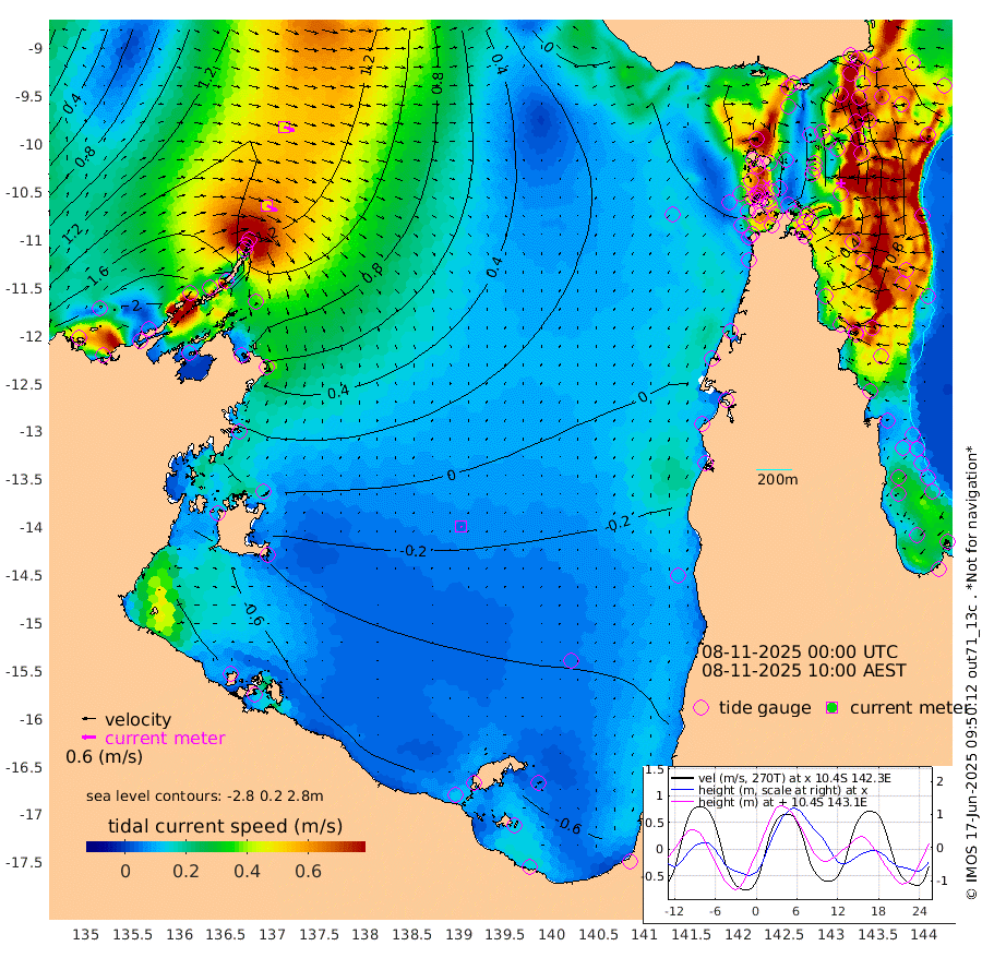 50cm/s 118T +3cm/s rms + 7cm/s -42T. ARA-GOC87 57m 4cm/s 152T +3cm/s rms + 2cm/s -2T. ARA-GOC87 60m 48cm/s 111T +2cm/s rms + 3cm/s 61T. ARA-GOC87 47m 57cm Daru 75cm Bobo Island 83cm Meer Island Barge 89cm Bramble Cay 72cm Unnamed Cay 90cm Pearce Cay 84cm Stephens Island 76cm Merrie England Shoals 55cm Mutacomal Reef 77cm Darnley Island Barge 91cm East Cay 63cm Yorke Island Barge 70cm Rennel Island 66cm Aureed Island 52cm Dungeness Reef 18cm Zagai Island 15cm Yam Island -11cm Dauan Island -22cm Saibai Island 0cm Phipi Reef 12cm Warrior Reef - West -4cm Mabuiag Island Barge 66cm Half Way Island 60cm Coconut Island 54cm Dugong Islet 35cm Poll Island 38cm Kirkcaldie Reef 13cm Suarji Island 19cm Sue Islet 65cm Hawkesbury Island 21cm Alert Patches 26cm Twin Island 60cm Badu Island 11cm St Pauls (Moa Island) 53cm Kubin (Moa Island) 23cm Ince Point 27cm Thursday Island 25cm Nardana Patches 46cm Turtle Head 51cm Round Island 71cm Goods Island 69cm Booby Island 71cm White Rocks Area 37cm Carpentaria 26cm Papou Point 82cm Bampfield Head 60cm Crab Island 62cm Red Wallis Island 58cm Packe Island 60cm Harrington Reef 49cm Herald Camp -17cm Sharp Point 46cm Red Island Point 34cm Possession Island 12cm Alpha Rock 40cm Frederick Point 60cm Wyborn Reef Light 52cm Tetley Island 70cm Triangle Reef 83cm Turtle Head Island 77cm Maclennan Cay 84cm Raine Island 70cm Mcsweeny Reef 70cm Collette Reef 71cm Shadwell Reef 80cm Hannibal Island 94cm Round Point 46cm Vrilya Point 78cm Cape Grenville 87cm Hicks Island 82cm Sir Charles Hardy Island 24cm Harvey Island 83cm Kay Reef 82cm Rocky Island 85cm Chapman Island 78cm Ham Reef 82cm Jubilee Reef 73cm Night Island 82cm Unnamed Reef No. 3 89cm Morris Island 85cm 1st 3 Mile Opening 84cm Creech Reef 84cm Fife Island 106cm Eden Reef 85cm Stanley Island 97cm Normanby River 206cm Yabooma Island 257cm Hutchison River 210cm Elcho Island 193cm North West Crocodile Island 150cm Cape Wessel 191cm Stevens Island 153cm Guluwuru Island 168cm Hopeful Bay 162cm Auster Point 163cm Two Island Bay 228cm Cadell Strait 110cm Mallison Island 132cm Melville Bay (Gove Harbour) 145cm Truant Island 85cm Cape Arnhem 34cm Cape Grey 7cm Hawk Island -50cm Milner Bay (Groote Eylandt) -61cm Cape Beatrice -133cm West Island -130cm Centre Island -117cm Mornington Island -125cm West Wellesley Islands -135cm Bountiful Island -136cm Albert River Mouth -158cm Sweers Island -137cm Karumba -78cm Nassau River Offshore -35cm Christmas Creek 13cm Archer River 21cm Boyd Point 29cm Weipa (Humbug Point) 31cm Pennefather River 31cm Cullen Point