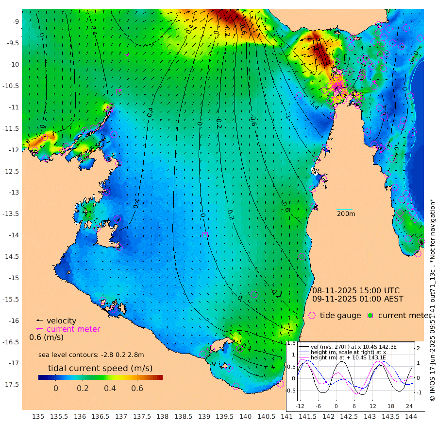 26cm/s 45T +3cm/s rms + 7cm/s -42T. ARA-GOC87 57m 15cm/s -26T +3cm/s rms + 2cm/s -2T. ARA-GOC87 60m 34cm/s 40T +2cm/s rms + 3cm/s 61T. ARA-GOC87 47m 22cm Daru 30cm Bobo Island -1cm Meer Island Barge 8cm Bramble Cay 15cm Unnamed Cay 21cm Pearce Cay 15cm Stephens Island 12cm Merrie England Shoals 17cm Mutacomal Reef 19cm Darnley Island Barge -6cm East Cay 24cm Yorke Island Barge 9cm Rennel Island 25cm Aureed Island 9cm Dungeness Reef 14cm Zagai Island -4cm Yam Island -27cm Dauan Island -19cm Saibai Island -22cm Phipi Reef 9cm Warrior Reef - West -65cm Mabuiag Island Barge 13cm Half Way Island 6cm Coconut Island 13cm Dugong Islet 2cm Poll Island -8cm Kirkcaldie Reef -18cm Suarji Island 6cm Sue Islet -187cm Hawkesbury Island -51cm Alert Patches -38cm Twin Island -164cm Badu Island -34cm St Pauls (Moa Island) -134cm Kubin (Moa Island) -75cm Ince Point -102cm Thursday Island -94cm Nardana Patches -136cm Turtle Head -152cm Round Island -189cm Goods Island -224cm Booby Island -210cm White Rocks Area -196cm Carpentaria -38cm Papou Point -229cm Bampfield Head -196cm Crab Island -210cm Red Wallis Island -164cm Packe Island 10cm Harrington Reef -195cm Herald Camp 1cm Sharp Point -126cm Red Island Point -80cm Possession Island -20cm Alpha Rock -16cm Frederick Point 14cm Wyborn Reef Light 10cm Tetley Island -7cm Triangle Reef 4cm Turtle Head Island -11cm Maclennan Cay -26cm Raine Island 12cm Mcsweeny Reef 9cm Collette Reef -8cm Shadwell Reef 14cm Hannibal Island 1cm Round Point -190cm Vrilya Point -4cm Cape Grenville -5cm Hicks Island -12cm Sir Charles Hardy Island 0cm Harvey Island -13cm Kay Reef -16cm Rocky Island -24cm Chapman Island -23cm Ham Reef -17cm Jubilee Reef -14cm Night Island -26cm Unnamed Reef No. 3 -18cm Morris Island -26cm 1st 3 Mile Opening -21cm Creech Reef -12cm Fife Island -14cm Eden Reef -19cm Stanley Island -9cm Normanby River 21cm Yabooma Island 42cm Hutchison River 35cm Elcho Island 34cm North West Crocodile Island 56cm Cape Wessel 53cm Stevens Island 91cm Guluwuru Island 43cm Hopeful Bay 48cm Auster Point 58cm Two Island Bay 83cm Cadell Strait 158cm Mallison Island 77cm Melville Bay (Gove Harbour) 76cm Truant Island 62cm Cape Arnhem 63cm Cape Grey 69cm Hawk Island 72cm Milner Bay (Groote Eylandt) 67cm Cape Beatrice 68cm West Island 63cm Centre Island 81cm Mornington Island 80cm West Wellesley Islands 97cm Bountiful Island 137cm Albert River Mouth 162cm Sweers Island 118cm Karumba 20cm Nassau River Offshore -38cm Christmas Creek -97cm Archer River -114cm Boyd Point -129cm Weipa (Humbug Point) -128cm Pennefather River -167cm Cullen Point