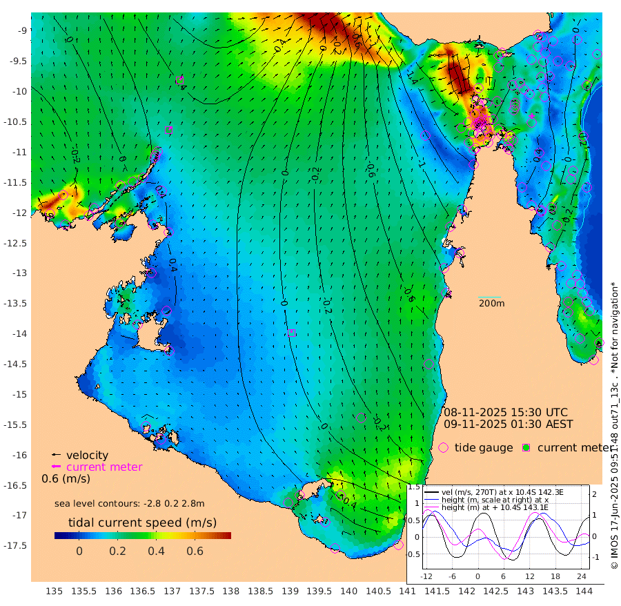 26cm/s 40T +3cm/s rms + 7cm/s -42T. ARA-GOC87 57m 16cm/s -13T +3cm/s rms + 2cm/s -2T. ARA-GOC87 60m 33cm/s 37T +2cm/s rms + 3cm/s 61T. ARA-GOC87 47m 12cm Daru 19cm Bobo Island -12cm Meer Island Barge -5cm Bramble Cay 5cm Unnamed Cay 7cm Pearce Cay 3cm Stephens Island 1cm Merrie England Shoals 8cm Mutacomal Reef 8cm Darnley Island Barge -19cm East Cay 15cm Yorke Island Barge -1cm Rennel Island 15cm Aureed Island -1cm Dungeness Reef 9cm Zagai Island -8cm Yam Island -33cm Dauan Island -20cm Saibai Island -33cm Phipi Reef 2cm Warrior Reef - West -65cm Mabuiag Island Barge 5cm Half Way Island -2cm Coconut Island 5cm Dugong Islet -4cm Poll Island -13cm Kirkcaldie Reef -23cm Suarji Island 3cm Sue Islet -190cm Hawkesbury Island -53cm Alert Patches -41cm Twin Island -169cm Badu Island -35cm St Pauls (Moa Island) -139cm Kubin (Moa Island) -77cm Ince Point -103cm Thursday Island -95cm Nardana Patches -140cm Turtle Head -156cm Round Island -194cm Goods Island -224cm Booby Island -212cm White Rocks Area -184cm Carpentaria -40cm Papou Point -230cm Bampfield Head -194cm Crab Island -210cm Red Wallis Island -170cm Packe Island 3cm Harrington Reef -199cm Herald Camp 3cm Sharp Point -129cm Red Island Point -82cm Possession Island -20cm Alpha Rock -21cm Frederick Point 6cm Wyborn Reef Light 3cm Tetley Island -17cm Triangle Reef -4cm Turtle Head Island -22cm Maclennan Cay -38cm Raine Island 2cm Mcsweeny Reef -1cm Collette Reef -18cm Shadwell Reef 3cm Hannibal Island -13cm Round Point -183cm Vrilya Point -15cm Cape Grenville -18cm Hicks Island -25cm Sir Charles Hardy Island -3cm Harvey Island -25cm Kay Reef -29cm Rocky Island -37cm Chapman Island -34cm Ham Reef -29cm Jubilee Reef -24cm Night Island -37cm Unnamed Reef No. 3 -31cm Morris Island -37cm 1st 3 Mile Opening -32cm Creech Reef -25cm Fife Island -30cm Eden Reef -31cm Stanley Island -23cm Normanby River -15cm Yabooma Island -3cm Hutchison River -1cm Elcho Island -1cm North West Crocodile Island 38cm Cape Wessel 23cm Stevens Island 72cm Guluwuru Island 15cm Hopeful Bay 26cm Auster Point 36cm Two Island Bay 48cm Cadell Strait 157cm Mallison Island 58cm Melville Bay (Gove Harbour) 58cm Truant Island 51cm Cape Arnhem 56cm Cape Grey 62cm Hawk Island 72cm Milner Bay (Groote Eylandt) 66cm Cape Beatrice 76cm West Island 72cm Centre Island 74cm Mornington Island 76cm West Wellesley Islands 81cm Bountiful Island 116cm Albert River Mouth 144cm Sweers Island 97cm Karumba 9cm Nassau River Offshore -48cm Christmas Creek -103cm Archer River -115cm Boyd Point -135cm Weipa (Humbug Point) -124cm Pennefather River -163cm Cullen Point