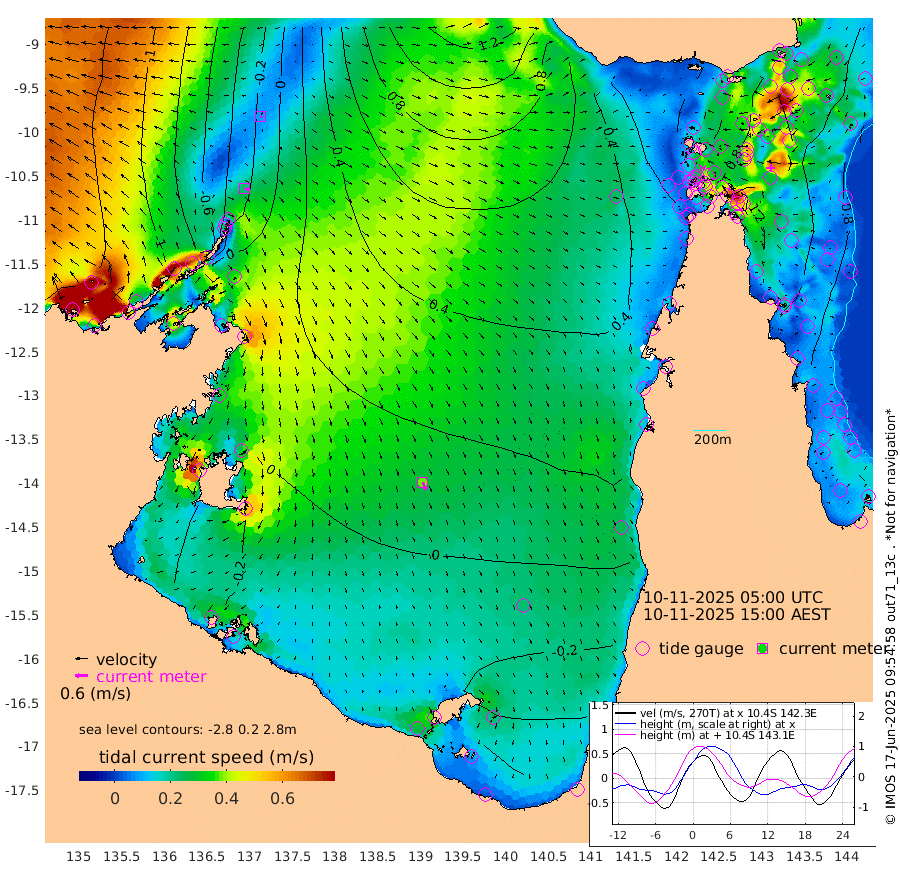 22cm/s 114T +3cm/s rms + 7cm/s -42T. ARA-GOC87 57m 38cm/s 160T +3cm/s rms + 2cm/s -2T. ARA-GOC87 60m 9cm/s 123T +2cm/s rms + 3cm/s 61T. ARA-GOC87 47m 118cm Daru 116cm Bobo Island 92cm Meer Island Barge 99cm Bramble Cay 113cm Unnamed Cay 117cm Pearce Cay 114cm Stephens Island 109cm Merrie England Shoals 113cm Mutacomal Reef 117cm Darnley Island Barge 93cm East Cay 120cm Yorke Island Barge 111cm Rennel Island 117cm Aureed Island 113cm Dungeness Reef 101cm Zagai Island 101cm Yam Island 92cm Dauan Island 91cm Saibai Island 83cm Phipi Reef 109cm Warrior Reef - West 65cm Mabuiag Island Barge 115cm Half Way Island 110cm Coconut Island 120cm Dugong Islet 104cm Poll Island 111cm Kirkcaldie Reef 90cm Suarji Island 109cm Sue Islet 59cm Hawkesbury Island 92cm Alert Patches 96cm Twin Island 56cm Badu Island 95cm St Pauls (Moa Island) 68cm Kubin (Moa Island) 81cm Ince Point 75cm Thursday Island 75cm Nardana Patches 69cm Turtle Head 50cm Round Island 55cm Goods Island 48cm Booby Island 40cm White Rocks Area 53cm Carpentaria 81cm Papou Point 52cm Bampfield Head 39cm Crab Island 50cm Red Wallis Island 67cm Packe Island 119cm Harrington Reef 62cm Herald Camp 25cm Sharp Point 58cm Red Island Point 69cm Possession Island 89cm Alpha Rock 106cm Frederick Point 111cm Wyborn Reef Light 110cm Tetley Island 85cm Triangle Reef 121cm Turtle Head Island 90cm Maclennan Cay 72cm Raine Island 111cm Mcsweeny Reef 105cm Collette Reef 87cm Shadwell Reef 111cm Hannibal Island 100cm Round Point 44cm Vrilya Point 95cm Cape Grenville 93cm Hicks Island 107cm Sir Charles Hardy Island 31cm Harvey Island 88cm Kay Reef 80cm Rocky Island 78cm Chapman Island 78cm Ham Reef 82cm Jubilee Reef 76cm Night Island 78cm Unnamed Reef No. 3 81cm Morris Island 80cm 1st 3 Mile Opening 85cm Creech Reef 84cm Fife Island 91cm Eden Reef 86cm Stanley Island 88cm Normanby River -105cm Yabooma Island -111cm Hutchison River -117cm Elcho Island -121cm North West Crocodile Island -22cm Cape Wessel -80cm Stevens Island 32cm Guluwuru Island -80cm Hopeful Bay -46cm Auster Point -41cm Two Island Bay -35cm Cadell Strait 186cm Mallison Island 6cm Melville Bay (Gove Harbour) 15cm Truant Island 14cm Cape Arnhem -13cm Cape Grey -30cm Hawk Island -64cm Milner Bay (Groote Eylandt) -62cm Cape Beatrice -75cm West Island -77cm Centre Island -62cm Mornington Island -54cm West Wellesley Islands -88cm Bountiful Island -152cm Albert River Mouth -171cm Sweers Island -140cm Karumba -12cm Nassau River Offshore 35cm Christmas Creek 40cm Archer River 53cm Boyd Point 45cm Weipa (Humbug Point) 39cm Pennefather River 45cm Cullen Point