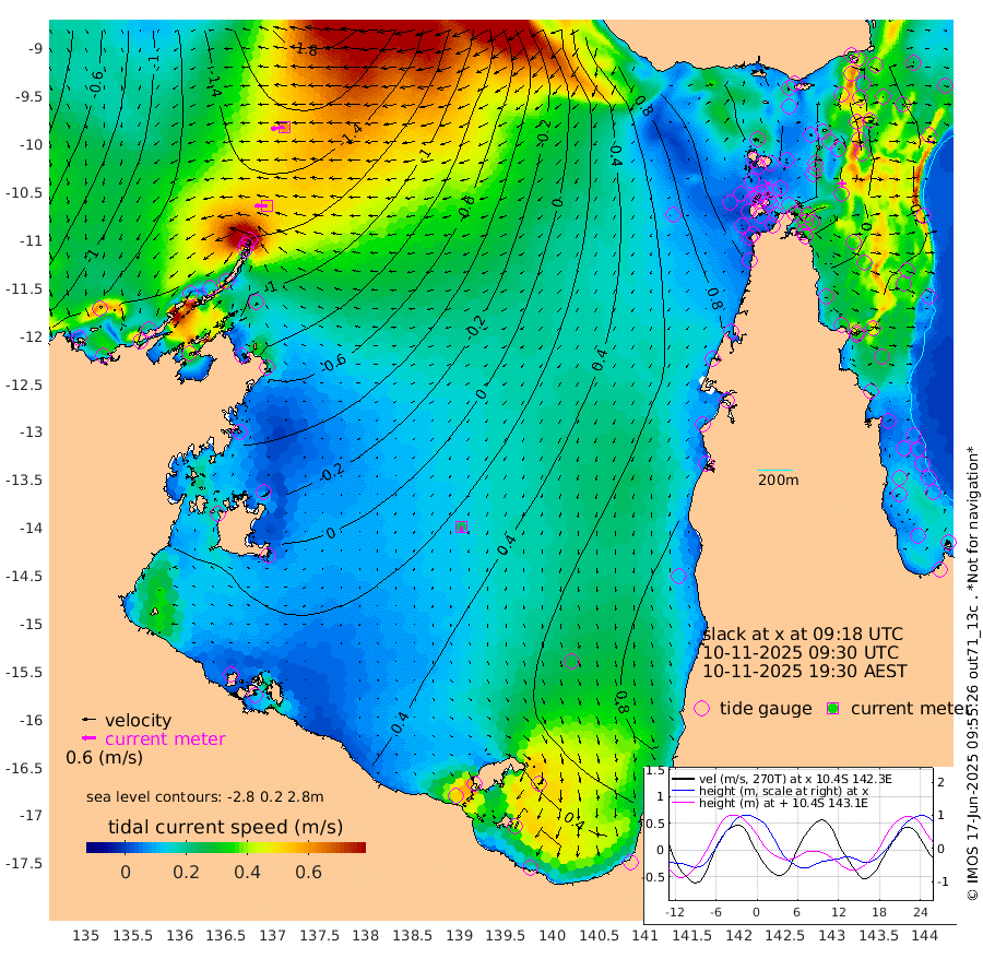 54cm/s -90T +3cm/s rms + 7cm/s -42T. ARA-GOC87 57m 23cm/s -171T +3cm/s rms + 2cm/s -2T. ARA-GOC87 60m 60cm/s -99T +2cm/s rms + 3cm/s 61T. ARA-GOC87 47m 17cm Daru -6cm Bobo Island -17cm Meer Island Barge -12cm Bramble Cay 4cm Unnamed Cay -6cm Pearce Cay -5cm Stephens Island 5cm Merrie England Shoals 21cm Mutacomal Reef -13cm Darnley Island Barge -13cm East Cay -4cm Yorke Island Barge 13cm Rennel Island -1cm Aureed Island 30cm Dungeness Reef 32cm Zagai Island 52cm Yam Island 76cm Dauan Island 61cm Saibai Island 89cm Phipi Reef 51cm Warrior Reef - West 78cm Mabuiag Island Barge 12cm Half Way Island 21cm Coconut Island 22cm Dugong Islet 38cm Poll Island 49cm Kirkcaldie Reef 65cm Suarji Island 34cm Sue Islet 117cm Hawkesbury Island 78cm Alert Patches 65cm Twin Island 112cm Badu Island 72cm St Pauls (Moa Island) 99cm Kubin (Moa Island) 85cm Ince Point 95cm Thursday Island 93cm Nardana Patches 109cm Turtle Head 102cm Round Island 118cm Goods Island 127cm Booby Island 122cm White Rocks Area 93cm Carpentaria 55cm Papou Point 106cm Bampfield Head 111cm Crab Island 125cm Red Wallis Island 119cm Packe Island 24cm Harrington Reef 128cm Herald Camp 25cm Sharp Point 97cm Red Island Point 74cm Possession Island 51cm Alpha Rock 46cm Frederick Point 13cm Wyborn Reef Light 19cm Tetley Island -5cm Triangle Reef 6cm Turtle Head Island -4cm Maclennan Cay -9cm Raine Island 2cm Mcsweeny Reef -1cm Collette Reef -5cm Shadwell Reef -6cm Hannibal Island -8cm Round Point 105cm Vrilya Point -1cm Cape Grenville -8cm Hicks Island -4cm Sir Charles Hardy Island -1cm Harvey Island -7cm Kay Reef -9cm Rocky Island -11cm Chapman Island -12cm Ham Reef -12cm Jubilee Reef -6cm Night Island -8cm Unnamed Reef No. 3 -10cm Morris Island -8cm 1st 3 Mile Opening -8cm Creech Reef -12cm Fife Island -24cm Eden Reef -9cm Stanley Island -18cm Normanby River -151cm Yabooma Island -186cm Hutchison River -160cm Elcho Island -143cm North West Crocodile Island -166cm Cape Wessel -172cm Stevens Island -179cm Guluwuru Island -153cm Hopeful Bay -161cm Auster Point -167cm Two Island Bay -207cm Cadell Strait -245cm Mallison Island -151cm Melville Bay (Gove Harbour) -167cm Truant Island -111cm Cape Arnhem -72cm Cape Grey -51cm Hawk Island -24cm Milner Bay (Groote Eylandt) 1cm Cape Beatrice 47cm West Island 45cm Centre Island 74cm Mornington Island 72cm West Wellesley Islands 91cm Bountiful Island 71cm Albert River Mouth 54cm Sweers Island 93cm Karumba 108cm Nassau River Offshore 112cm Christmas Creek 95cm Archer River 85cm Boyd Point 100cm Weipa (Humbug Point) 82cm Pennefather River 102cm Cullen Point