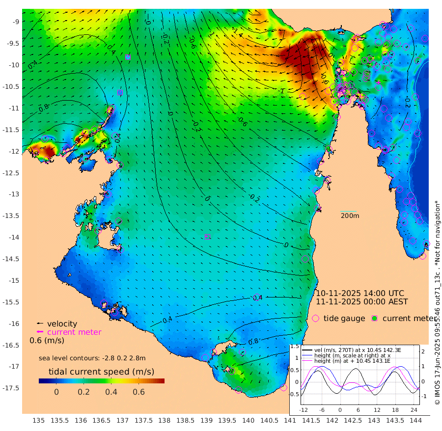 7cm/s -11T +3cm/s rms + 7cm/s -42T. ARA-GOC87 57m 20cm/s -77T +3cm/s rms + 2cm/s -2T. ARA-GOC87 60m 13cm/s 22T +2cm/s rms + 3cm/s 61T. ARA-GOC87 47m -41cm Daru -34cm Bobo Island -23cm Meer Island Barge -26cm Bramble Cay -41cm Unnamed Cay -30cm Pearce Cay -38cm Stephens Island -44cm Merrie England Shoals -46cm Mutacomal Reef -34cm Darnley Island Barge -26cm East Cay -38cm Yorke Island Barge -44cm Rennel Island -32cm Aureed Island -37cm Dungeness Reef -31cm Zagai Island -44cm Yam Island -9cm Dauan Island -21cm Saibai Island 5cm Phipi Reef -20cm Warrior Reef - West -53cm Mabuiag Island Barge -49cm Half Way Island -47cm Coconut Island -52cm Dugong Islet -46cm Poll Island -60cm Kirkcaldie Reef -44cm Suarji Island -54cm Sue Islet -103cm Hawkesbury Island -68cm Alert Patches -67cm Twin Island -75cm Badu Island -62cm St Pauls (Moa Island) -81cm Kubin (Moa Island) -71cm Ince Point -80cm Thursday Island -75cm Nardana Patches -75cm Turtle Head -88cm Round Island -89cm Goods Island -113cm Booby Island -104cm White Rocks Area -143cm Carpentaria -64cm Papou Point -135cm Bampfield Head -102cm Crab Island -109cm Red Wallis Island -86cm Packe Island -61cm Harrington Reef -109cm Herald Camp -16cm Sharp Point -78cm Red Island Point -74cm Possession Island -65cm Alpha Rock -63cm Frederick Point -53cm Wyborn Reef Light -56cm Tetley Island -22cm Triangle Reef -70cm Turtle Head Island -29cm Maclennan Cay -19cm Raine Island -41cm Mcsweeny Reef -36cm Collette Reef -25cm Shadwell Reef -35cm Hannibal Island -31cm Round Point -117cm Vrilya Point -35cm Cape Grenville -29cm Hicks Island -30cm Sir Charles Hardy Island -11cm Harvey Island -31cm Kay Reef -20cm Rocky Island -16cm Chapman Island -23cm Ham Reef -24cm Jubilee Reef -20cm Night Island -24cm Unnamed Reef No. 3 -22cm Morris Island -25cm 1st 3 Mile Opening -25cm Creech Reef -21cm Fife Island -14cm Eden Reef -28cm Stanley Island -25cm Normanby River 99cm Yabooma Island 131cm Hutchison River 116cm Elcho Island 114cm North West Crocodile Island 45cm Cape Wessel 90cm Stevens Island 54cm Guluwuru Island 89cm Hopeful Bay 59cm Auster Point 58cm Two Island Bay 105cm Cadell Strait 15cm Mallison Island 60cm Melville Bay (Gove Harbour) 50cm Truant Island 40cm Cape Arnhem 42cm Cape Grey 58cm Hawk Island 54cm Milner Bay (Groote Eylandt) 60cm Cape Beatrice 48cm West Island 46cm Centre Island 115cm Mornington Island 109cm West Wellesley Islands 165cm Bountiful Island 229cm Albert River Mouth 234cm Sweers Island 211cm Karumba 88cm Nassau River Offshore 34cm Christmas Creek -17cm Archer River -49cm Boyd Point -35cm Weipa (Humbug Point) -72cm Pennefather River -91cm Cullen Point