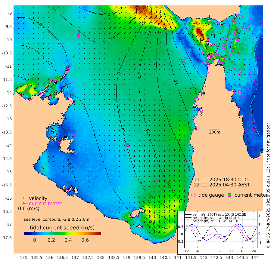 23cm/s 27T +3cm/s rms + 7cm/s -42T. ARA-GOC87 57m 24cm/s -4T +3cm/s rms + 2cm/s -2T. ARA-GOC87 60m 28cm/s 32T +2cm/s rms + 3cm/s 61T. ARA-GOC87 47m -21cm Daru -10cm Bobo Island 3cm Meer Island Barge -1cm Bramble Cay -9cm Unnamed Cay -13cm Pearce Cay -1cm Stephens Island -4cm Merrie England Shoals -23cm Mutacomal Reef 5cm Darnley Island Barge 0cm East Cay -5cm Yorke Island Barge -18cm Rennel Island -9cm Aureed Island -39cm Dungeness Reef -58cm Zagai Island -76cm Yam Island -119cm Dauan Island -103cm Saibai Island -117cm Phipi Reef -74cm Warrior Reef - West -123cm Mabuiag Island Barge -16cm Half Way Island -35cm Coconut Island -25cm Dugong Islet -54cm Poll Island -57cm Kirkcaldie Reef -78cm Suarji Island -47cm Sue Islet -212cm Hawkesbury Island -97cm Alert Patches -90cm Twin Island -199cm Badu Island -97cm St Pauls (Moa Island) -171cm Kubin (Moa Island) -120cm Ince Point -138cm Thursday Island -134cm Nardana Patches -162cm Turtle Head -174cm Round Island -197cm Goods Island -209cm Booby Island -200cm White Rocks Area -150cm Carpentaria -92cm Papou Point -203cm Bampfield Head -176cm Crab Island -200cm Red Wallis Island -185cm Packe Island -25cm Harrington Reef -205cm Herald Camp -20cm Sharp Point -152cm Red Island Point -114cm Possession Island -66cm Alpha Rock -63cm Frederick Point -27cm Wyborn Reef Light -36cm Tetley Island -15cm Triangle Reef -30cm Turtle Head Island -9cm Maclennan Cay -8cm Raine Island -6cm Mcsweeny Reef -3cm Collette Reef -4cm Shadwell Reef 2cm Hannibal Island -4cm Round Point -155cm Vrilya Point -1cm Cape Grenville -4cm Hicks Island -13cm Sir Charles Hardy Island 0cm Harvey Island 0cm Kay Reef -4cm Rocky Island -8cm Chapman Island -5cm Ham Reef -3cm Jubilee Reef -1cm Night Island -6cm Unnamed Reef No. 3 -2cm Morris Island -7cm 1st 3 Mile Opening -3cm Creech Reef 10cm Fife Island 3cm Eden Reef 2cm Stanley Island 8cm Normanby River -47cm Yabooma Island -48cm Hutchison River -34cm Elcho Island -40cm North West Crocodile Island 14cm Cape Wessel -10cm Stevens Island 36cm Guluwuru Island -8cm Hopeful Bay 3cm Auster Point 2cm Two Island Bay -6cm Cadell Strait 130cm Mallison Island 29cm Melville Bay (Gove Harbour) 30cm Truant Island 33cm Cape Arnhem 45cm Cape Grey 49cm Hawk Island 75cm Milner Bay (Groote Eylandt) 69cm Cape Beatrice 89cm West Island 87cm Centre Island 73cm Mornington Island 81cm West Wellesley Islands 67cm Bountiful Island 99cm Albert River Mouth 135cm Sweers Island 80cm Karumba 3cm Nassau River Offshore -47cm Christmas Creek -87cm Archer River -100cm Boyd Point -118cm Weipa (Humbug Point) -100cm Pennefather River -145cm Cullen Point