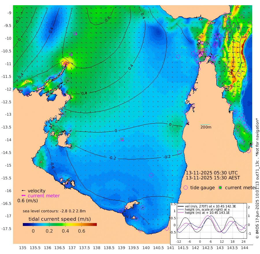 29cm/s 111T +3cm/s rms + 7cm/s -42T. ARA-GOC87 57m 22cm/s 161T +3cm/s rms + 2cm/s -2T. ARA-GOC87 60m 23cm/s 104T +2cm/s rms + 3cm/s 61T. ARA-GOC87 47m 19cm Daru 28cm Bobo Island 61cm Meer Island Barge 55cm Bramble Cay 37cm Unnamed Cay 38cm Pearce Cay 43cm Stephens Island 35cm Merrie England Shoals 20cm Mutacomal Reef 50cm Darnley Island Barge 65cm East Cay 36cm Yorke Island Barge 26cm Rennel Island 29cm Aureed Island 11cm Dungeness Reef -2cm Zagai Island -2cm Yam Island 8cm Dauan Island 13cm Saibai Island -15cm Phipi Reef 2cm Warrior Reef - West 0cm Mabuiag Island Barge 23cm Half Way Island 10cm Coconut Island 19cm Dugong Islet 0cm Poll Island -1cm Kirkcaldie Reef -20cm Suarji Island 6cm Sue Islet 47cm Hawkesbury Island -12cm Alert Patches -7cm Twin Island 26cm Badu Island -15cm St Pauls (Moa Island) 26cm Kubin (Moa Island) -3cm Ince Point 2cm Thursday Island 0cm Nardana Patches 16cm Turtle Head 26cm Round Island 37cm Goods Island 40cm Booby Island 34cm White Rocks Area 34cm Carpentaria -7cm Papou Point 55cm Bampfield Head 26cm Crab Island 38cm Red Wallis Island 32cm Packe Island 7cm Harrington Reef 52cm Herald Camp -16cm Sharp Point 13cm Red Island Point -1cm Possession Island -2cm Alpha Rock 1cm Frederick Point 20cm Wyborn Reef Light 16cm Tetley Island 53cm Triangle Reef 21cm Turtle Head Island 57cm Maclennan Cay 63cm Raine Island 37cm Mcsweeny Reef 42cm Collette Reef 55cm Shadwell Reef 46cm Hannibal Island 57cm Round Point 22cm Vrilya Point 53cm Cape Grenville 58cm Hicks Island 76cm Sir Charles Hardy Island 16cm Harvey Island 65cm Kay Reef 66cm Rocky Island 76cm Chapman Island 73cm Ham Reef 67cm Jubilee Reef 55cm Night Island 70cm Unnamed Reef No. 3 66cm Morris Island 63cm 1st 3 Mile Opening 66cm Creech Reef 69cm Fife Island 83cm Eden Reef 69cm Stanley Island 75cm Normanby River 88cm Yabooma Island 91cm Hutchison River 70cm Elcho Island 61cm North West Crocodile Island 93cm Cape Wessel 84cm Stevens Island 101cm Guluwuru Island 82cm Hopeful Bay 82cm Auster Point 90cm Two Island Bay 116cm Cadell Strait 219cm Mallison Island 81cm Melville Bay (Gove Harbour) 93cm Truant Island 55cm Cape Arnhem 11cm Cape Grey -9cm Hawk Island -55cm Milner Bay (Groote Eylandt) -65cm Cape Beatrice -107cm West Island -111cm Centre Island -101cm Mornington Island -95cm West Wellesley Islands -101cm Bountiful Island -148cm Albert River Mouth -160cm Sweers Island -144cm Karumba -52cm Nassau River Offshore -8cm Christmas Creek 19cm Archer River 31cm Boyd Point 35cm Weipa (Humbug Point) 9cm Pennefather River 33cm Cullen Point
