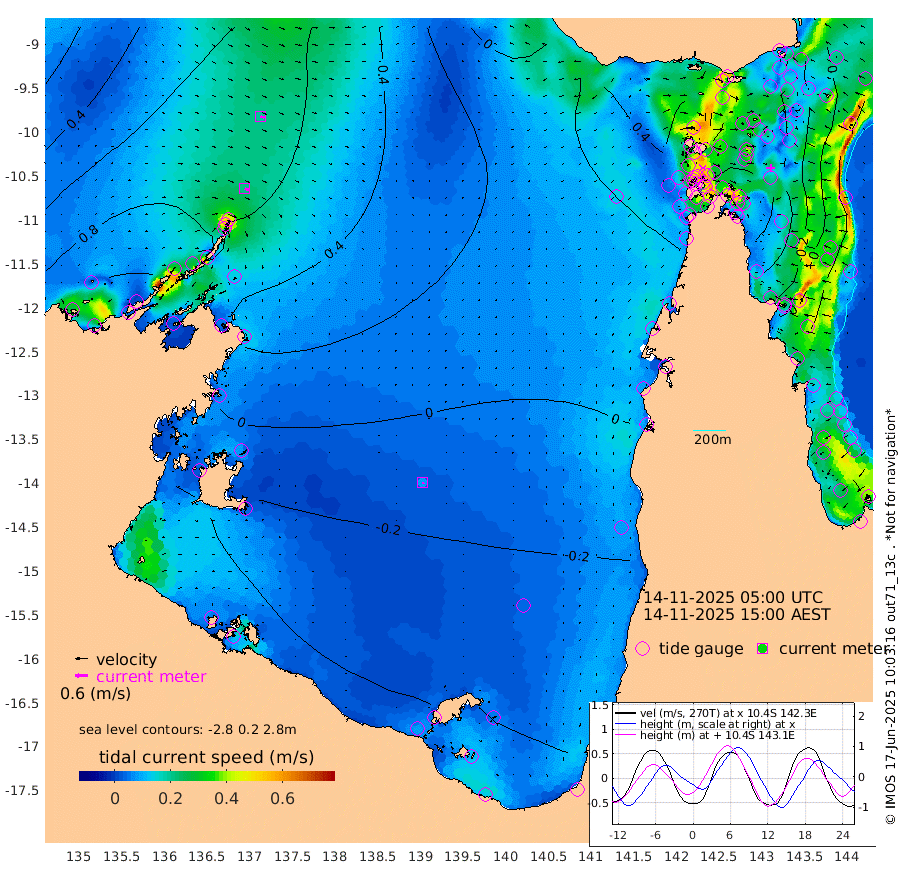 21cm/s 116T +3cm/s rms + 7cm/s -42T. ARA-GOC87 57m 9cm/s 155T +3cm/s rms + 2cm/s -2T. ARA-GOC87 60m 20cm/s 110T +2cm/s rms + 3cm/s 61T. ARA-GOC87 47m -41cm Daru -38cm Bobo Island 11cm Meer Island Barge -4cm Bramble Cay -24cm Unnamed Cay -30cm Pearce Cay -23cm Stephens Island -28cm Merrie England Shoals -38cm Mutacomal Reef -13cm Darnley Island Barge 9cm East Cay -25cm Yorke Island Barge -34cm Rennel Island -34cm Aureed Island -41cm Dungeness Reef -33cm Zagai Island -32cm Yam Island 5cm Dauan Island 8cm Saibai Island -23cm Phipi Reef -31cm Warrior Reef - West 4cm Mabuiag Island Barge -39cm Half Way Island -44cm Coconut Island -41cm Dugong Islet -42cm Poll Island -48cm Kirkcaldie Reef -44cm Suarji Island -35cm Sue Islet 59cm Hawkesbury Island -35cm Alert Patches -35cm Twin Island 42cm Badu Island -37cm St Pauls (Moa Island) 29cm Kubin (Moa Island) -15cm Ince Point -3cm Thursday Island -6cm Nardana Patches 17cm Turtle Head 40cm Round Island 51cm Goods Island 63cm Booby Island 55cm White Rocks Area 50cm Carpentaria -28cm Papou Point 82cm Bampfield Head 44cm Crab Island 55cm Red Wallis Island 35cm Packe Island -57cm Harrington Reef 69cm Herald Camp -21cm Sharp Point 9cm Red Island Point -11cm Possession Island -29cm Alpha Rock -42cm Frederick Point -35cm Wyborn Reef Light -35cm Tetley Island 9cm Triangle Reef -41cm Turtle Head Island 8cm Maclennan Cay 24cm Raine Island -24cm Mcsweeny Reef -15cm Collette Reef 10cm Shadwell Reef -18cm Hannibal Island -4cm Round Point 35cm Vrilya Point -3cm Cape Grenville 5cm Hicks Island 23cm Sir Charles Hardy Island -2cm Harvey Island 13cm Kay Reef 21cm Rocky Island 34cm Chapman Island 31cm Ham Reef 23cm Jubilee Reef 12cm Night Island 26cm Unnamed Reef No. 3 18cm Morris Island 23cm 1st 3 Mile Opening 19cm Creech Reef 16cm Fife Island 30cm Eden Reef 20cm Stanley Island 18cm Normanby River 122cm Yabooma Island 121cm Hutchison River 104cm Elcho Island 95cm North West Crocodile Island 93cm Cape Wessel 104cm Stevens Island 82cm Guluwuru Island 103cm Hopeful Bay 92cm Auster Point 96cm Two Island Bay 112cm Cadell Strait 146cm Mallison Island 72cm Melville Bay (Gove Harbour) 81cm Truant Island 46cm Cape Arnhem 9cm Cape Grey -7cm Hawk Island -38cm Milner Bay (Groote Eylandt) -52cm Cape Beatrice -91cm West Island -92cm Centre Island -95cm Mornington Island -89cm West Wellesley Islands -82cm Bountiful Island -111cm Albert River Mouth -122cm Sweers Island -114cm Karumba -58cm Nassau River Offshore -20cm Christmas Creek 14cm Archer River 29cm Boyd Point 39cm Weipa (Humbug Point) 11cm Pennefather River 46cm Cullen Point