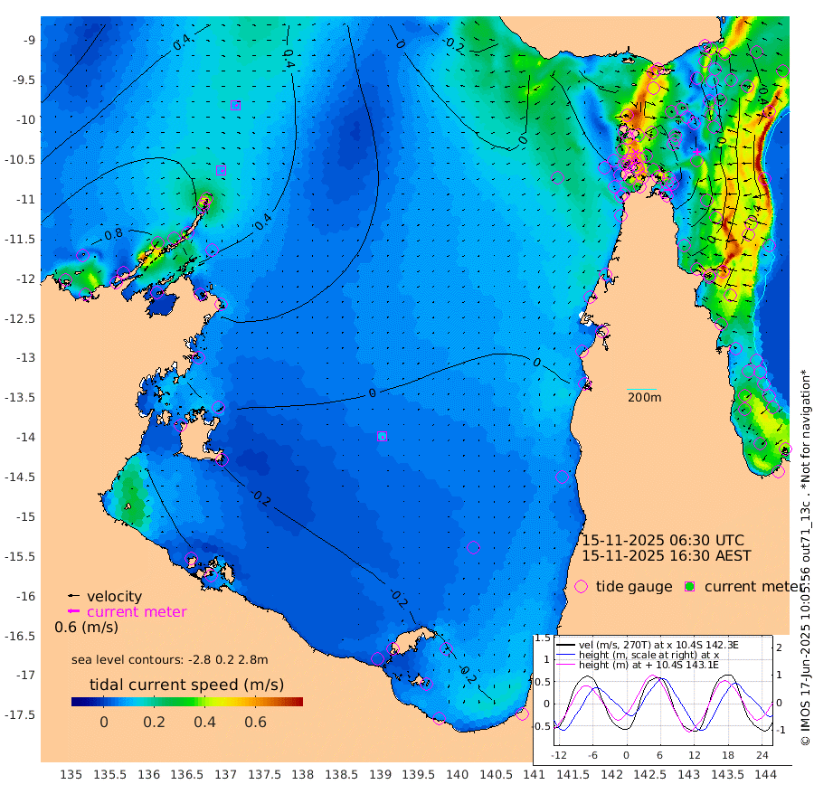 11cm/s 115T +3cm/s rms + 7cm/s -42T. ARA-GOC87 57m 12cm/s 172T +3cm/s rms + 2cm/s -2T. ARA-GOC87 60m 9cm/s 109T +2cm/s rms + 3cm/s 61T. ARA-GOC87 47m -19cm Daru -16cm Bobo Island 34cm Meer Island Barge 26cm Bramble Cay 4cm Unnamed Cay -7cm Pearce Cay 7cm Stephens Island 5cm Merrie England Shoals -13cm Mutacomal Reef 13cm Darnley Island Barge 38cm East Cay -4cm Yorke Island Barge -10cm Rennel Island -15cm Aureed Island -28cm Dungeness Reef -41cm Zagai Island -36cm Yam Island -21cm Dauan Island -17cm Saibai Island -42cm Phipi Reef -37cm Warrior Reef - West -22cm Mabuiag Island Barge -15cm Half Way Island -31cm Coconut Island -21cm Dugong Islet -38cm Poll Island -38cm Kirkcaldie Reef -53cm Suarji Island -32cm Sue Islet 30cm Hawkesbury Island -44cm Alert Patches -42cm Twin Island 9cm Badu Island -50cm St Pauls (Moa Island) 7cm Kubin (Moa Island) -30cm Ince Point -22cm Thursday Island -24cm Nardana Patches -3cm Turtle Head 15cm Round Island 24cm Goods Island 31cm Booby Island 28cm White Rocks Area 20cm Carpentaria -40cm Papou Point 46cm Bampfield Head 18cm Crab Island 28cm Red Wallis Island 17cm Packe Island -36cm Harrington Reef 44cm Herald Camp -24cm Sharp Point -8cm Red Island Point -27cm Possession Island -30cm Alpha Rock -37cm Frederick Point -16cm Wyborn Reef Light -21cm Tetley Island 26cm Triangle Reef -25cm Turtle Head Island 31cm Maclennan Cay 45cm Raine Island 2cm Mcsweeny Reef 11cm Collette Reef 32cm Shadwell Reef 13cm Hannibal Island 29cm Round Point 11cm Vrilya Point 28cm Cape Grenville 32cm Hicks Island 50cm Sir Charles Hardy Island 7cm Harvey Island 44cm Kay Reef 47cm Rocky Island 57cm Chapman Island 53cm Ham Reef 46cm Jubilee Reef 36cm Night Island 51cm Unnamed Reef No. 3 46cm Morris Island 43cm 1st 3 Mile Opening 44cm Creech Reef 48cm Fife Island 59cm Eden Reef 49cm Stanley Island 52cm Normanby River 106cm Yabooma Island 101cm Hutchison River 87cm Elcho Island 80cm North West Crocodile Island 79cm Cape Wessel 90cm Stevens Island 70cm Guluwuru Island 92cm Hopeful Bay 76cm Auster Point 81cm Two Island Bay 96cm Cadell Strait 160cm Mallison Island 63cm Melville Bay (Gove Harbour) 69cm Truant Island 38cm Cape Arnhem 8cm Cape Grey -4cm Hawk Island -32cm Milner Bay (Groote Eylandt) -39cm Cape Beatrice -70cm West Island -76cm Centre Island -62cm Mornington Island -56cm West Wellesley Islands -44cm Bountiful Island -73cm Albert River Mouth -82cm Sweers Island -74cm Karumba -25cm Nassau River Offshore 2cm Christmas Creek 18cm Archer River 24cm Boyd Point 34cm Weipa (Humbug Point) -1cm Pennefather River 27cm Cullen Point