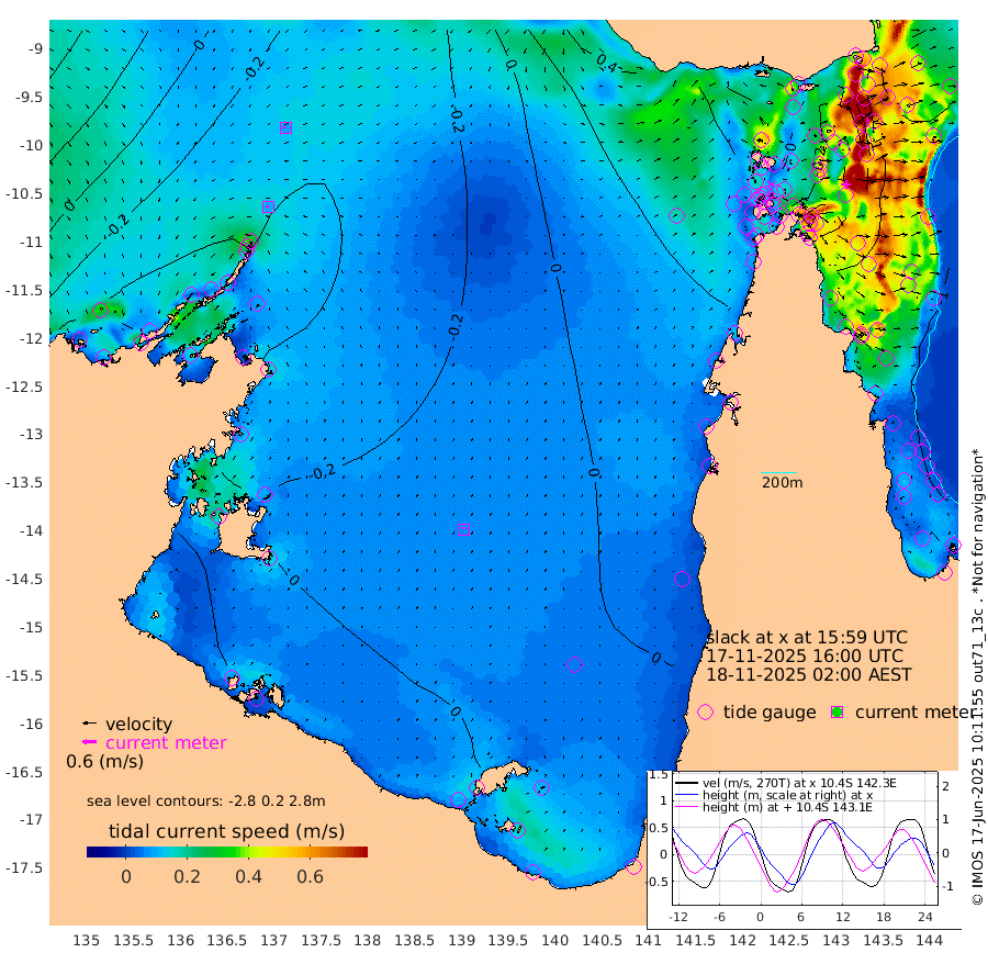 10cm/s -80T +3cm/s rms + 7cm/s -42T. ARA-GOC87 57m 7cm/s -3T +3cm/s rms + 2cm/s -2T. ARA-GOC87 60m 9cm/s -86T +2cm/s rms + 3cm/s 61T. ARA-GOC87 47m -102cm Daru -110cm Bobo Island -95cm Meer Island Barge -115cm Bramble Cay -116cm Unnamed Cay -110cm Pearce Cay -115cm Stephens Island -121cm Merrie England Shoals -109cm Mutacomal Reef -107cm Darnley Island Barge -111cm East Cay -99cm Yorke Island Barge -106cm Rennel Island -102cm Aureed Island -85cm Dungeness Reef -52cm Zagai Island -52cm Yam Island -4cm Dauan Island -11cm Saibai Island -21cm Phipi Reef -51cm Warrior Reef - West -3cm Mabuiag Island Barge -97cm Half Way Island -96cm Coconut Island -92cm Dugong Islet -67cm Poll Island -73cm Kirkcaldie Reef -54cm Suarji Island -61cm Sue Islet -1cm Hawkesbury Island -43cm Alert Patches -47cm Twin Island -7cm Badu Island -32cm St Pauls (Moa Island) -13cm Kubin (Moa Island) -26cm Ince Point -17cm Thursday Island -19cm Nardana Patches -19cm Turtle Head -14cm Round Island -11cm Goods Island 6cm Booby Island -9cm White Rocks Area 14cm Carpentaria -35cm Papou Point -21cm Bampfield Head 12cm Crab Island 3cm Red Wallis Island -17cm Packe Island -102cm Harrington Reef -7cm Herald Camp -1cm Sharp Point -18cm Red Island Point -30cm Possession Island -51cm Alpha Rock -71cm Frederick Point -104cm Wyborn Reef Light -94cm Tetley Island -84cm Triangle Reef -97cm Turtle Head Island -94cm Maclennan Cay -88cm Raine Island -107cm Mcsweeny Reef -107cm Collette Reef -92cm Shadwell Reef -119cm Hannibal Island -120cm Round Point 26cm Vrilya Point -110cm Cape Grenville -106cm Hicks Island -114cm Sir Charles Hardy Island -32cm Harvey Island -112cm Kay Reef -98cm Rocky Island -98cm Chapman Island -92cm Ham Reef -94cm Jubilee Reef -85cm Night Island -96cm Unnamed Reef No. 3 -103cm Morris Island -90cm 1st 3 Mile Opening -95cm Creech Reef -101cm Fife Island -113cm Eden Reef -102cm Stanley Island -114cm Normanby River -52cm Yabooma Island -76cm Hutchison River -53cm Elcho Island -43cm North West Crocodile Island -58cm Cape Wessel -58cm Stevens Island -76cm Guluwuru Island -53cm Hopeful Bay -50cm Auster Point -39cm Two Island Bay -63cm Cadell Strait -128cm Mallison Island -63cm Melville Bay (Gove Harbour) -67cm Truant Island -44cm Cape Arnhem -28cm Cape Grey -13cm Hawk Island 12cm Milner Bay (Groote Eylandt) 13cm Cape Beatrice 37cm West Island 40cm Centre Island 11cm Mornington Island 10cm West Wellesley Islands -4cm Bountiful Island 22cm Albert River Mouth 33cm Sweers Island 24cm Karumba -4cm Nassau River Offshore -18cm Christmas Creek -12cm Archer River -7cm Boyd Point -12cm Weipa (Humbug Point) 18cm Pennefather River 15cm Cullen Point