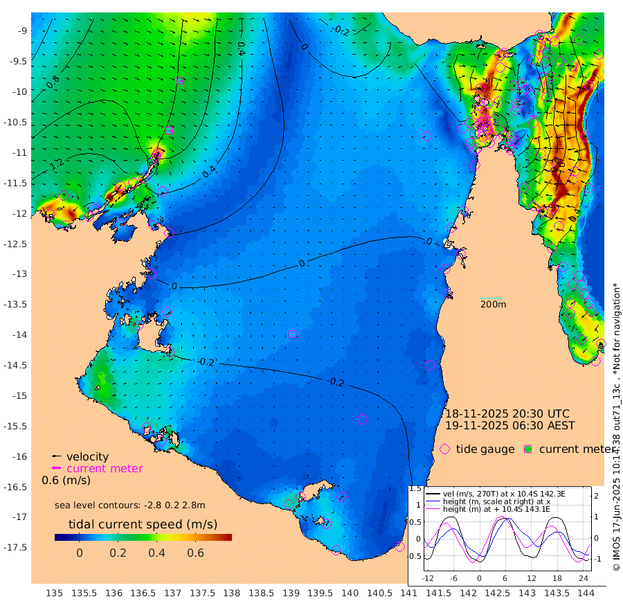 20cm/s 119T +3cm/s rms + 7cm/s -42T. ARA-GOC87 57m 9cm/s -7T +3cm/s rms + 2cm/s -2T. ARA-GOC87 60m 22cm/s 111T +2cm/s rms + 3cm/s 61T. ARA-GOC87 47m -44cm Daru -38cm Bobo Island 17cm Meer Island Barge 10cm Bramble Cay -17cm Unnamed Cay -24cm Pearce Cay -11cm Stephens Island -5cm Merrie England Shoals -39cm Mutacomal Reef -10cm Darnley Island Barge 20cm East Cay -31cm Yorke Island Barge -29cm Rennel Island -44cm Aureed Island -56cm Dungeness Reef -88cm Zagai Island -89cm Yam Island -98cm Dauan Island -97cm Saibai Island -88cm Phipi Reef -98cm Warrior Reef - West -65cm Mabuiag Island Barge -34cm Half Way Island -49cm Coconut Island -51cm Dugong Islet -71cm Poll Island -63cm Kirkcaldie Reef -94cm Suarji Island -70cm Sue Islet 11cm Hawkesbury Island -65cm Alert Patches -73cm Twin Island -6cm Badu Island -87cm St Pauls (Moa Island) -24cm Kubin (Moa Island) -59cm Ince Point -48cm Thursday Island -52cm Nardana Patches -26cm Turtle Head -4cm Round Island 10cm Goods Island 25cm Booby Island 17cm White Rocks Area 12cm Carpentaria -67cm Papou Point 36cm Bampfield Head 30cm Crab Island 12cm Red Wallis Island -15cm Packe Island -53cm Harrington Reef 0cm Herald Camp -36cm Sharp Point -16cm Red Island Point -39cm Possession Island -68cm Alpha Rock -63cm Frederick Point -39cm Wyborn Reef Light -48cm Tetley Island 2cm Triangle Reef -24cm Turtle Head Island 7cm Maclennan Cay 35cm Raine Island -17cm Mcsweeny Reef -5cm Collette Reef 17cm Shadwell Reef -2cm Hannibal Island 16cm Round Point 34cm Vrilya Point 12cm Cape Grenville 15cm Hicks Island 5cm Sir Charles Hardy Island 2cm Harvey Island 28cm Kay Reef 28cm Rocky Island 33cm Chapman Island 31cm Ham Reef 29cm Jubilee Reef 21cm Night Island 32cm Unnamed Reef No. 3 32cm Morris Island 32cm 1st 3 Mile Opening 28cm Creech Reef 31cm Fife Island 42cm Eden Reef 35cm Stanley Island 35cm Normanby River 133cm Yabooma Island 149cm Hutchison River 134cm Elcho Island 124cm North West Crocodile Island 72cm Cape Wessel 121cm Stevens Island 57cm Guluwuru Island 117cm Hopeful Bay 95cm Auster Point 91cm Two Island Bay 118cm Cadell Strait 61cm Mallison Island 58cm Melville Bay (Gove Harbour) 61cm Truant Island 32cm Cape Arnhem 18cm Cape Grey 9cm Hawk Island -12cm Milner Bay (Groote Eylandt) -20cm Cape Beatrice -55cm West Island -53cm Centre Island -55cm Mornington Island -61cm West Wellesley Islands -66cm Bountiful Island -51cm Albert River Mouth -40cm Sweers Island -47cm Karumba -49cm Nassau River Offshore -35cm Christmas Creek 9cm Archer River 5cm Boyd Point 12cm Weipa (Humbug Point) 32cm Pennefather River 15cm Cullen Point
