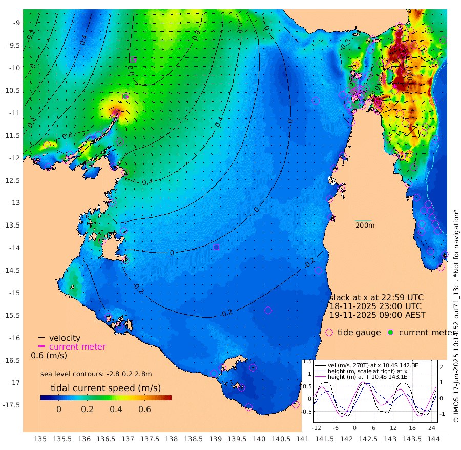 30cm/s 108T +3cm/s rms + 7cm/s -42T. ARA-GOC87 57m 3cm/s 113T +3cm/s rms + 2cm/s -2T. ARA-GOC87 60m 29cm/s 99T +2cm/s rms + 3cm/s 61T. ARA-GOC87 47m 92cm Daru 106cm Bobo Island 84cm Meer Island Barge 105cm Bramble Cay 104cm Unnamed Cay 108cm Pearce Cay 103cm Stephens Island 112cm Merrie England Shoals 98cm Mutacomal Reef 96cm Darnley Island Barge 97cm East Cay 91cm Yorke Island Barge 96cm Rennel Island 93cm Aureed Island 75cm Dungeness Reef 45cm Zagai Island 36cm Yam Island -11cm Dauan Island -4cm Saibai Island 15cm Phipi Reef 37cm Warrior Reef - West 1cm Mabuiag Island Barge 87cm Half Way Island 94cm Coconut Island 78cm Dugong Islet 61cm Poll Island 64cm Kirkcaldie Reef 42cm Suarji Island 54cm Sue Islet 14cm Hawkesbury Island 44cm Alert Patches 45cm Twin Island 17cm Badu Island 28cm St Pauls (Moa Island) 13cm Kubin (Moa Island) 24cm Ince Point 17cm Thursday Island 18cm Nardana Patches 18cm Turtle Head 20cm Round Island 14cm Goods Island 2cm Booby Island 9cm White Rocks Area -7cm Carpentaria 35cm Papou Point 30cm Bampfield Head 4cm Crab Island 0cm Red Wallis Island 14cm Packe Island 95cm Harrington Reef -2cm Herald Camp -1cm Sharp Point 25cm Red Island Point 38cm Possession Island 43cm Alpha Rock 67cm Frederick Point 100cm Wyborn Reef Light 92cm Tetley Island 76cm Triangle Reef 107cm Turtle Head Island 77cm Maclennan Cay 76cm Raine Island 98cm Mcsweeny Reef 98cm Collette Reef 82cm Shadwell Reef 110cm Hannibal Island 112cm Round Point -3cm Vrilya Point 96cm Cape Grenville 92cm Hicks Island 86cm Sir Charles Hardy Island 28cm Harvey Island 98cm Kay Reef 83cm Rocky Island 84cm Chapman Island 77cm Ham Reef 80cm Jubilee Reef 73cm Night Island 82cm Unnamed Reef No. 3 88cm Morris Island 75cm 1st 3 Mile Opening 80cm Creech Reef 85cm Fife Island 98cm Eden Reef 86cm Stanley Island 96cm Normanby River 78cm Yabooma Island 117cm Hutchison River 89cm Elcho Island 76cm North West Crocodile Island 82cm Cape Wessel 96cm Stevens Island 100cm Guluwuru Island 86cm Hopeful Bay 84cm Auster Point 71cm Two Island Bay 109cm Cadell Strait 149cm Mallison Island 85cm Melville Bay (Gove Harbour) 92cm Truant Island 59cm Cape Arnhem 34cm Cape Grey 20cm Hawk Island -21cm Milner Bay (Groote Eylandt) -29cm Cape Beatrice -71cm West Island -66cm Centre Island -52cm Mornington Island -60cm West Wellesley Islands -69cm Bountiful Island -81cm Albert River Mouth -77cm Sweers Island -75cm Karumba -43cm Nassau River Offshore -22cm Christmas Creek 3cm Archer River 0cm Boyd Point -2cm Weipa (Humbug Point) 7cm Pennefather River -12cm Cullen Point