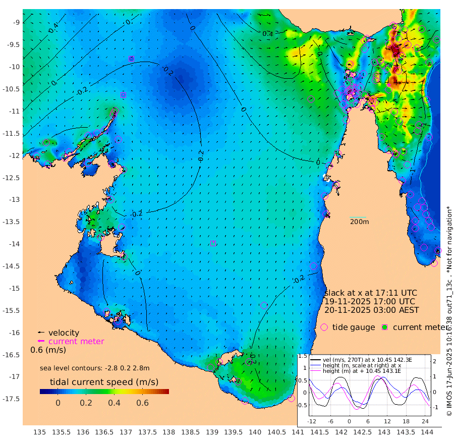 8cm/s -45T +3cm/s rms + 7cm/s -42T. ARA-GOC87 57m 16cm/s 9T +3cm/s rms + 2cm/s -2T. ARA-GOC87 60m 5cm/s -47T +2cm/s rms + 3cm/s 61T. ARA-GOC87 47m -118cm Daru -120cm Bobo Island -92cm Meer Island Barge -117cm Bramble Cay -124cm Unnamed Cay -119cm Pearce Cay -117cm Stephens Island -127cm Merrie England Shoals -125cm Mutacomal Reef -108cm Darnley Island Barge -106cm East Cay -108cm Yorke Island Barge -116cm Rennel Island -109cm Aureed Island -106cm Dungeness Reef -82cm Zagai Island -85cm Yam Island -57cm Dauan Island -57cm Saibai Island -83cm Phipi Reef -89cm Warrior Reef - West -46cm Mabuiag Island Barge -105cm Half Way Island -112cm Coconut Island -105cm Dugong Islet -91cm Poll Island -99cm Kirkcaldie Reef -85cm Suarji Island -86cm Sue Islet -50cm Hawkesbury Island -78cm Alert Patches -78cm Twin Island -58cm Badu Island -68cm St Pauls (Moa Island) -52cm Kubin (Moa Island) -61cm Ince Point -54cm Thursday Island -56cm Nardana Patches -59cm Turtle Head -53cm Round Island -51cm Goods Island -29cm Booby Island -40cm White Rocks Area 5cm Carpentaria -65cm Papou Point -47cm Bampfield Head -19cm Crab Island -29cm Red Wallis Island -54cm Packe Island -113cm Harrington Reef -45cm Herald Camp -13cm Sharp Point -59cm Red Island Point -62cm Possession Island -74cm Alpha Rock -94cm Frederick Point -118cm Wyborn Reef Light -111cm Tetley Island -86cm Triangle Reef -111cm Turtle Head Island -91cm Maclennan Cay -83cm Raine Island -112cm Mcsweeny Reef -111cm Collette Reef -92cm Shadwell Reef -122cm Hannibal Island -120cm Round Point 1cm Vrilya Point -108cm Cape Grenville -104cm Hicks Island -112cm Sir Charles Hardy Island -31cm Harvey Island -108cm Kay Reef -94cm Rocky Island -93cm Chapman Island -85cm Ham Reef -89cm Jubilee Reef -79cm Night Island -88cm Unnamed Reef No. 3 -96cm Morris Island -84cm 1st 3 Mile Opening -89cm Creech Reef -88cm Fife Island -104cm Eden Reef -94cm Stanley Island -104cm Normanby River -50cm Yabooma Island -78cm Hutchison River -50cm Elcho Island -45cm North West Crocodile Island -37cm Cape Wessel -50cm Stevens Island -62cm Guluwuru Island -45cm Hopeful Bay -37cm Auster Point -25cm Two Island Bay -60cm Cadell Strait -97cm Mallison Island -52cm Melville Bay (Gove Harbour) -51cm Truant Island -33cm Cape Arnhem -21cm Cape Grey -10cm Hawk Island 23cm Milner Bay (Groote Eylandt) 20cm Cape Beatrice 46cm West Island 48cm Centre Island -3cm Mornington Island 1cm West Wellesley Islands -30cm Bountiful Island -3cm Albert River Mouth 13cm Sweers Island -8cm Karumba -31cm Nassau River Offshore -47cm Christmas Creek -40cm Archer River -28cm Boyd Point -39cm Weipa (Humbug Point) -5cm Pennefather River -7cm Cullen Point