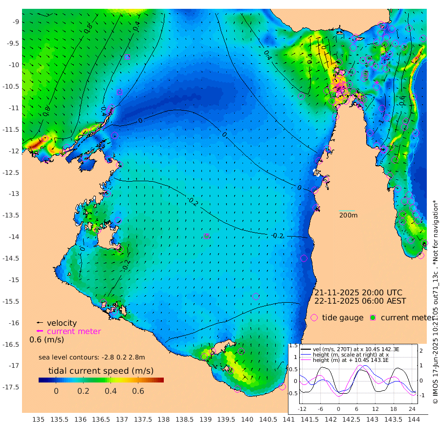 5cm/s 146T +3cm/s rms + 7cm/s -42T. ARA-GOC87 57m 23cm/s 9T +3cm/s rms + 2cm/s -2T. ARA-GOC87 60m 11cm/s 138T +2cm/s rms + 3cm/s 61T. ARA-GOC87 47m -107cm Daru -102cm Bobo Island -41cm Meer Island Barge -66cm Bramble Cay -89cm Unnamed Cay -92cm Pearce Cay -75cm Stephens Island -84cm Merrie England Shoals -109cm Mutacomal Reef -73cm Darnley Island Barge -47cm East Cay -90cm Yorke Island Barge -88cm Rennel Island -97cm Aureed Island -104cm Dungeness Reef -118cm Zagai Island -113cm Yam Island -120cm Dauan Island -123cm Saibai Island -134cm Phipi Reef -134cm Warrior Reef - West -77cm Mabuiag Island Barge -82cm Half Way Island -103cm Coconut Island -94cm Dugong Islet -104cm Poll Island -100cm Kirkcaldie Reef -112cm Suarji Island -106cm Sue Islet -8cm Hawkesbury Island -90cm Alert Patches -93cm Twin Island -31cm Badu Island -97cm St Pauls (Moa Island) -30cm Kubin (Moa Island) -70cm Ince Point -53cm Thursday Island -58cm Nardana Patches -39cm Turtle Head -16cm Round Island 0cm Goods Island 33cm Booby Island 22cm White Rocks Area 55cm Carpentaria -78cm Papou Point 36cm Bampfield Head 35cm Crab Island 23cm Red Wallis Island -20cm Packe Island -98cm Harrington Reef 2cm Herald Camp -35cm Sharp Point -37cm Red Island Point -54cm Possession Island -90cm Alpha Rock -97cm Frederick Point -103cm Wyborn Reef Light -105cm Tetley Island -52cm Triangle Reef -80cm Turtle Head Island -42cm Maclennan Cay -22cm Raine Island -80cm Mcsweeny Reef -75cm Collette Reef -47cm Shadwell Reef -80cm Hannibal Island -64cm Round Point 49cm Vrilya Point -55cm Cape Grenville -48cm Hicks Island -59cm Sir Charles Hardy Island -16cm Harvey Island -45cm Kay Reef -36cm Rocky Island -36cm Chapman Island -28cm Ham Reef -31cm Jubilee Reef -29cm Night Island -29cm Unnamed Reef No. 3 -31cm Morris Island -21cm 1st 3 Mile Opening -28cm Creech Reef -29cm Fife Island -31cm Eden Reef -29cm Stanley Island -33cm Normanby River 67cm Yabooma Island 58cm Hutchison River 67cm Elcho Island 62cm North West Crocodile Island 28cm Cape Wessel 47cm Stevens Island -12cm Guluwuru Island 44cm Hopeful Bay 42cm Auster Point 49cm Two Island Bay 29cm Cadell Strait -105cm Mallison Island -5cm Melville Bay (Gove Harbour) 1cm Truant Island -8cm Cape Arnhem -10cm Cape Grey -15cm Hawk Island 1cm Milner Bay (Groote Eylandt) -7cm Cape Beatrice -8cm West Island -6cm Centre Island -64cm Mornington Island -63cm West Wellesley Islands -94cm Bountiful Island -73cm Albert River Mouth -67cm Sweers Island -78cm Karumba -77cm Nassau River Offshore -67cm Christmas Creek -24cm Archer River -7cm Boyd Point -9cm Weipa (Humbug Point) 25cm Pennefather River 28cm Cullen Point